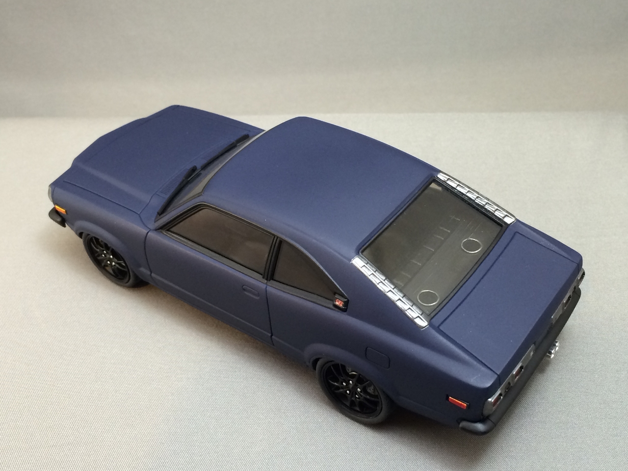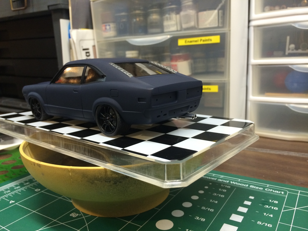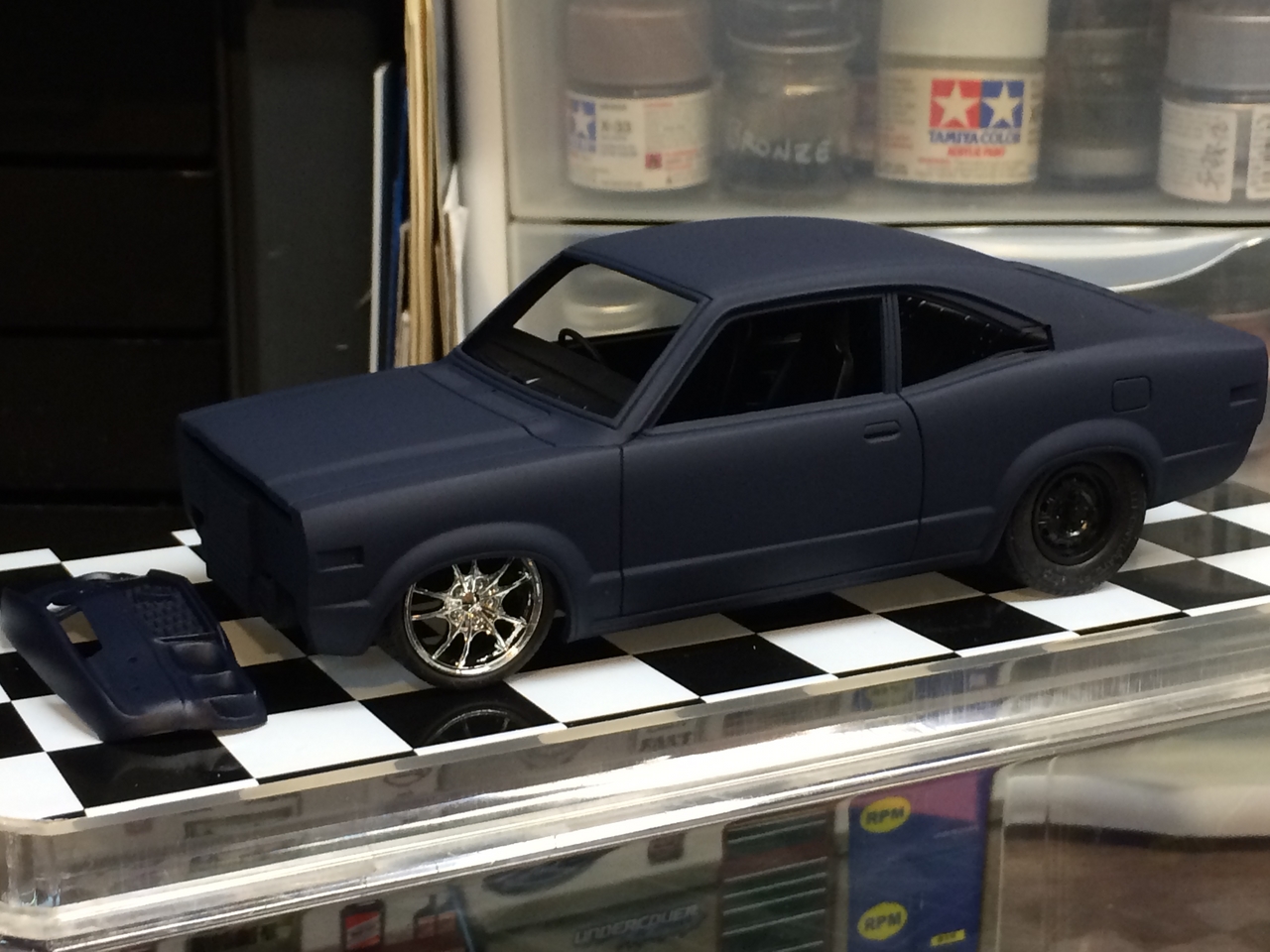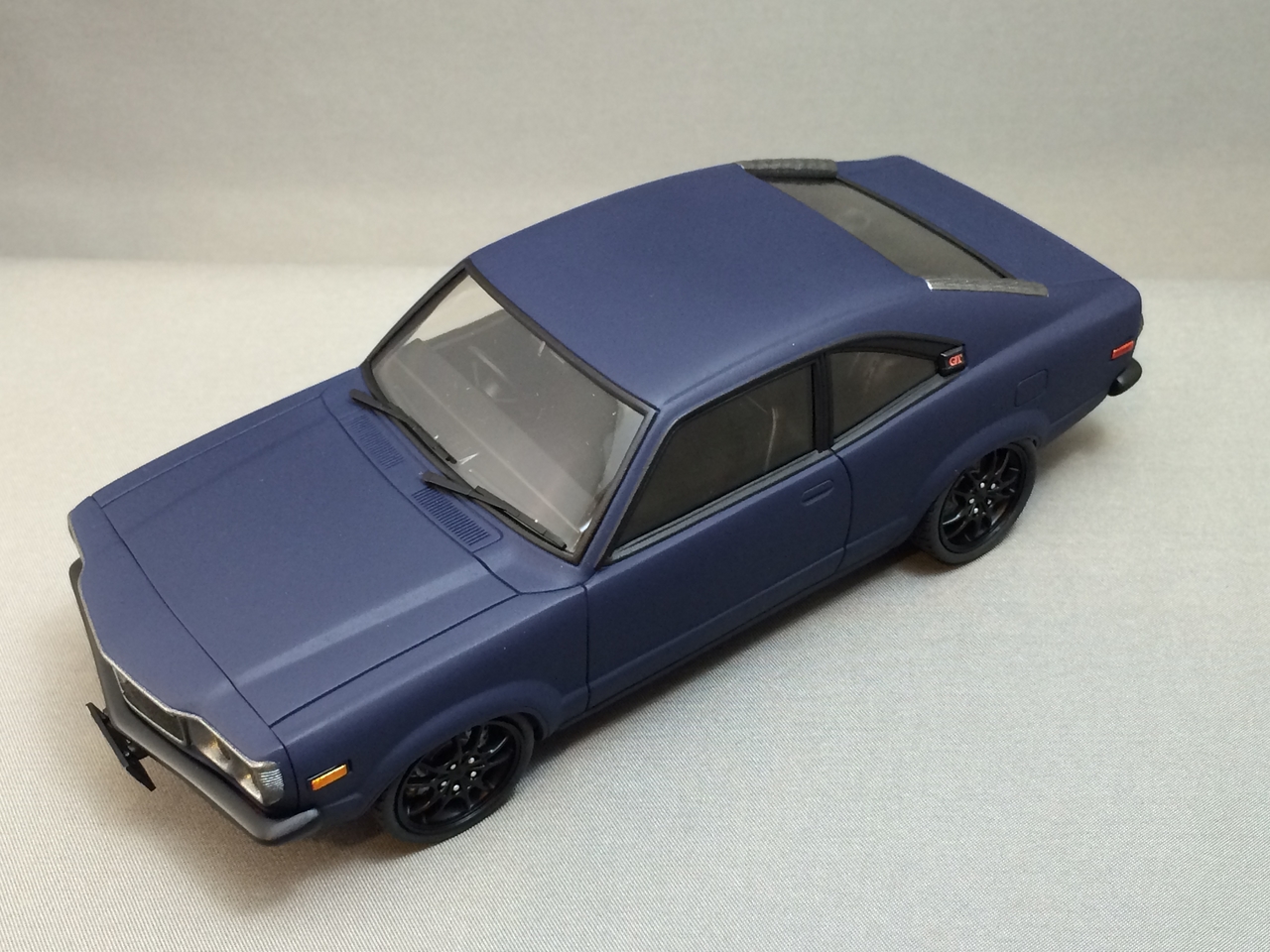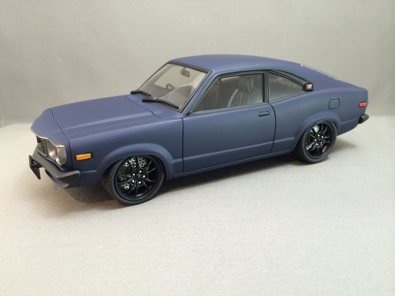 The kit is painted a flat dark blue and is sealed with satin clear. I found a picture of a similar era Toyota painted the same way and knew how I wanted the model to look. I was able to mount a set of Pegasus wheels by grinding out the wheel wells, inner and outer. The look of the new wheels gives the car a very aggressive look. The ride height is un-modified which was as very sweet surprise.