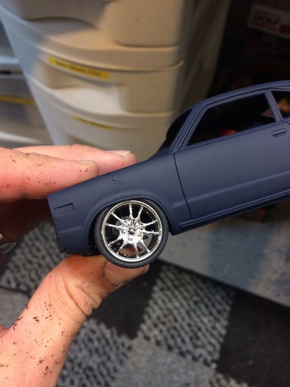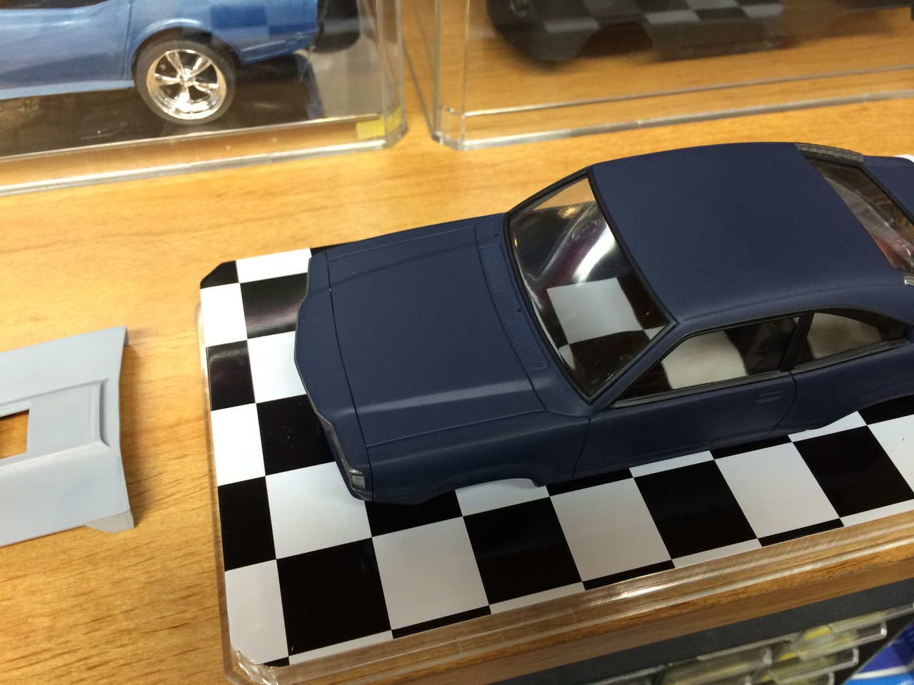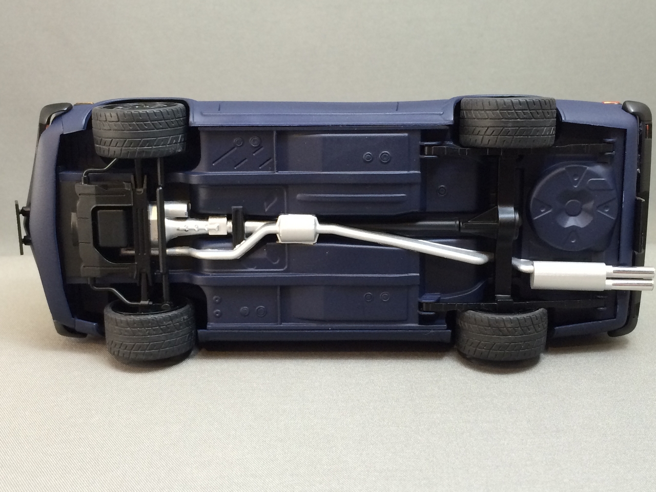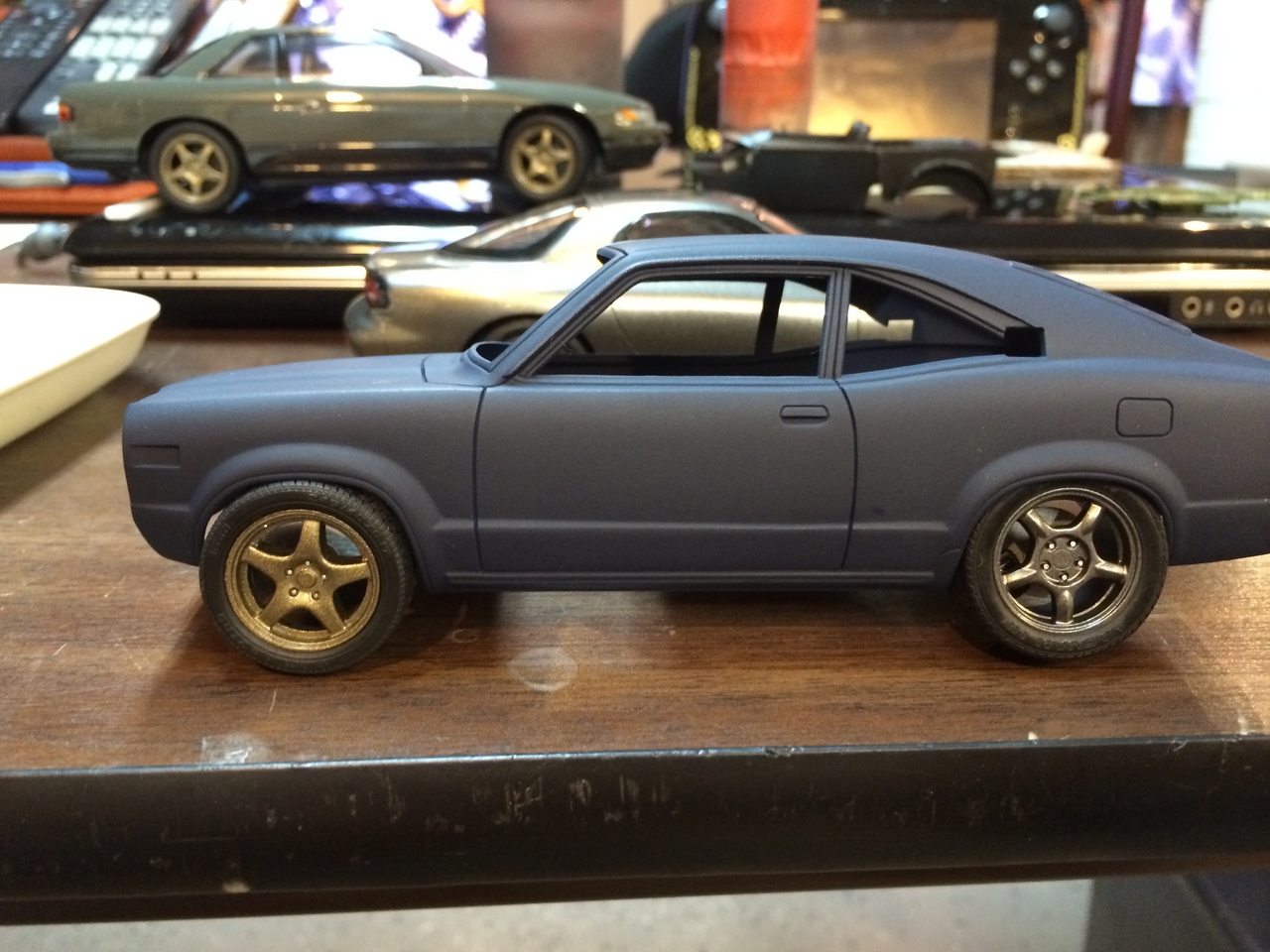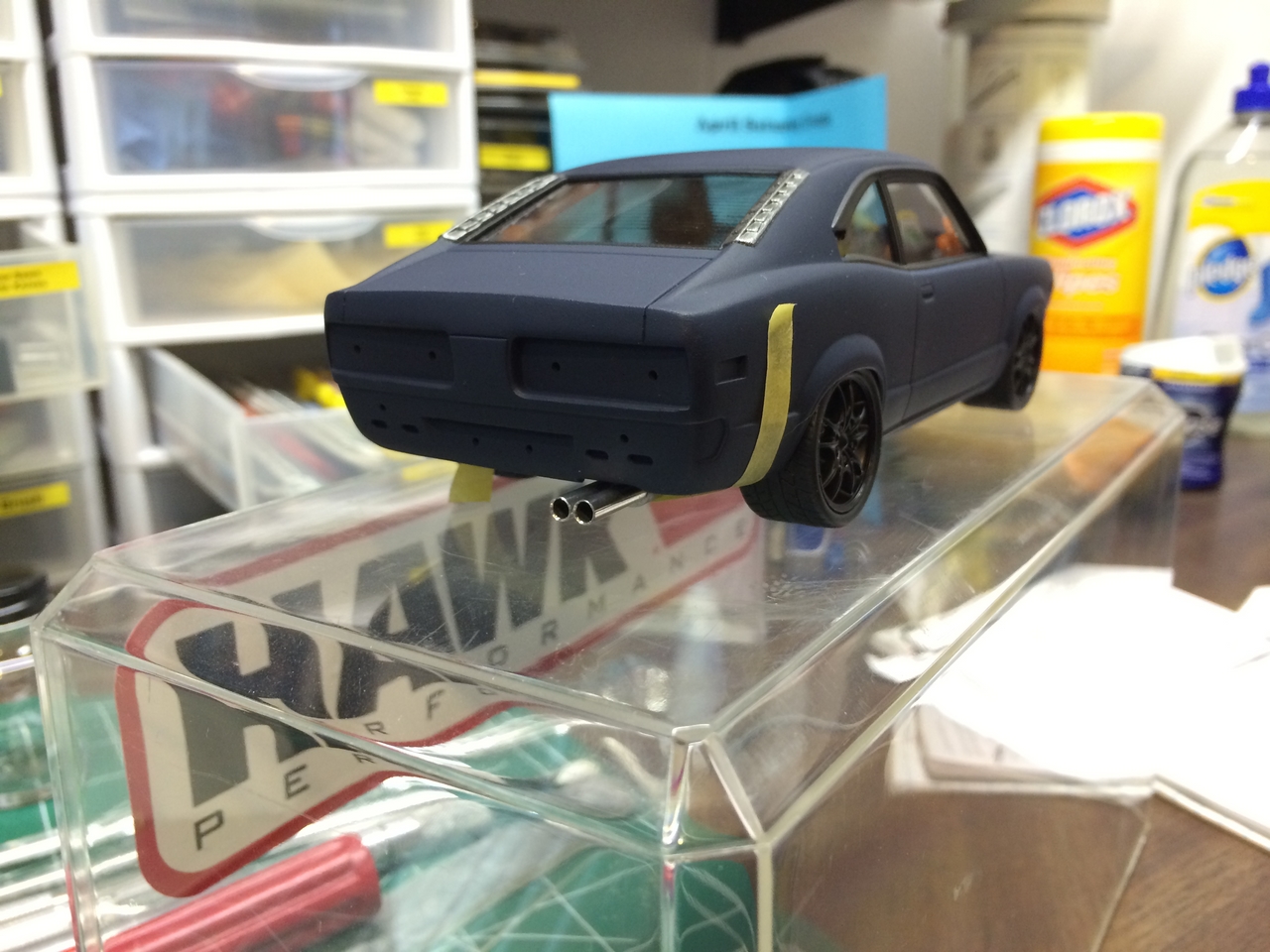 The kit is painted a flat dark blue and is sealed with satin clear. I found a picture of a similar era Toyota painted the same way and knew how I wanted the model to look. I was able to mount a set of Pegasus wheels by grinding out the wheel wells, inner and outer. The look of the new wheels gives the car a very aggressive look. The ride height is un-modified which was as very sweet surprise.