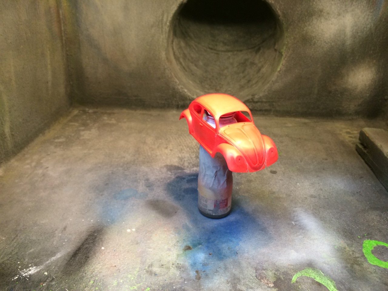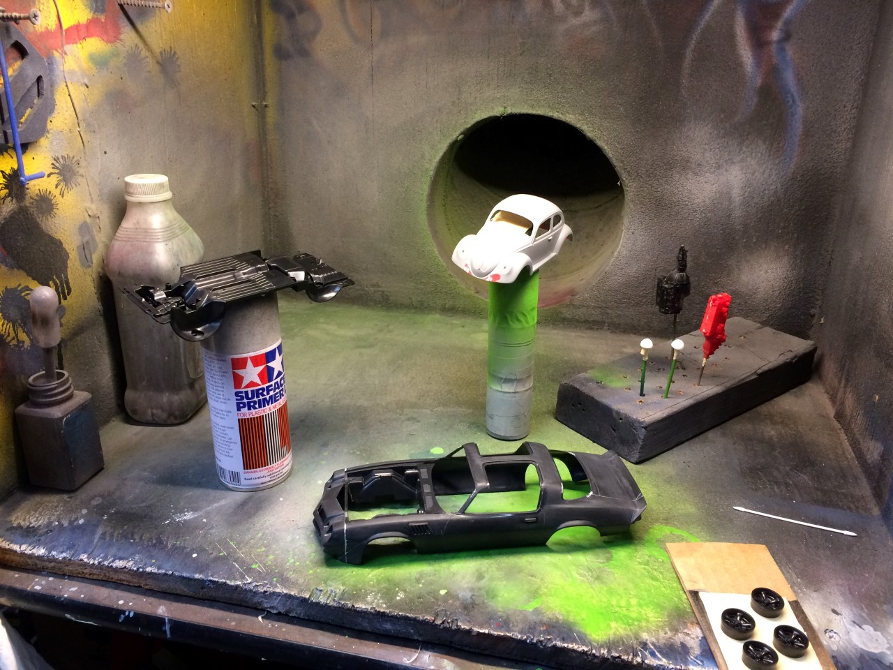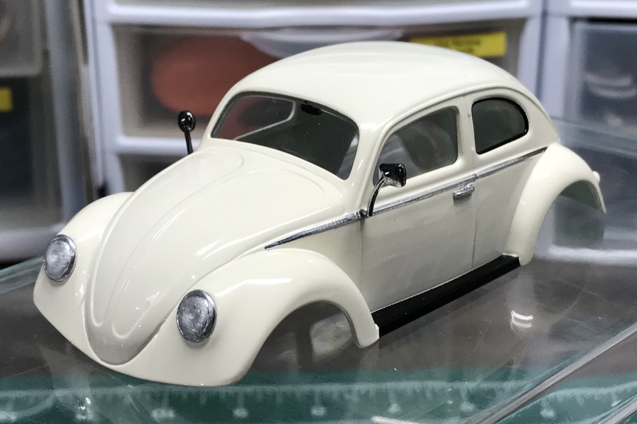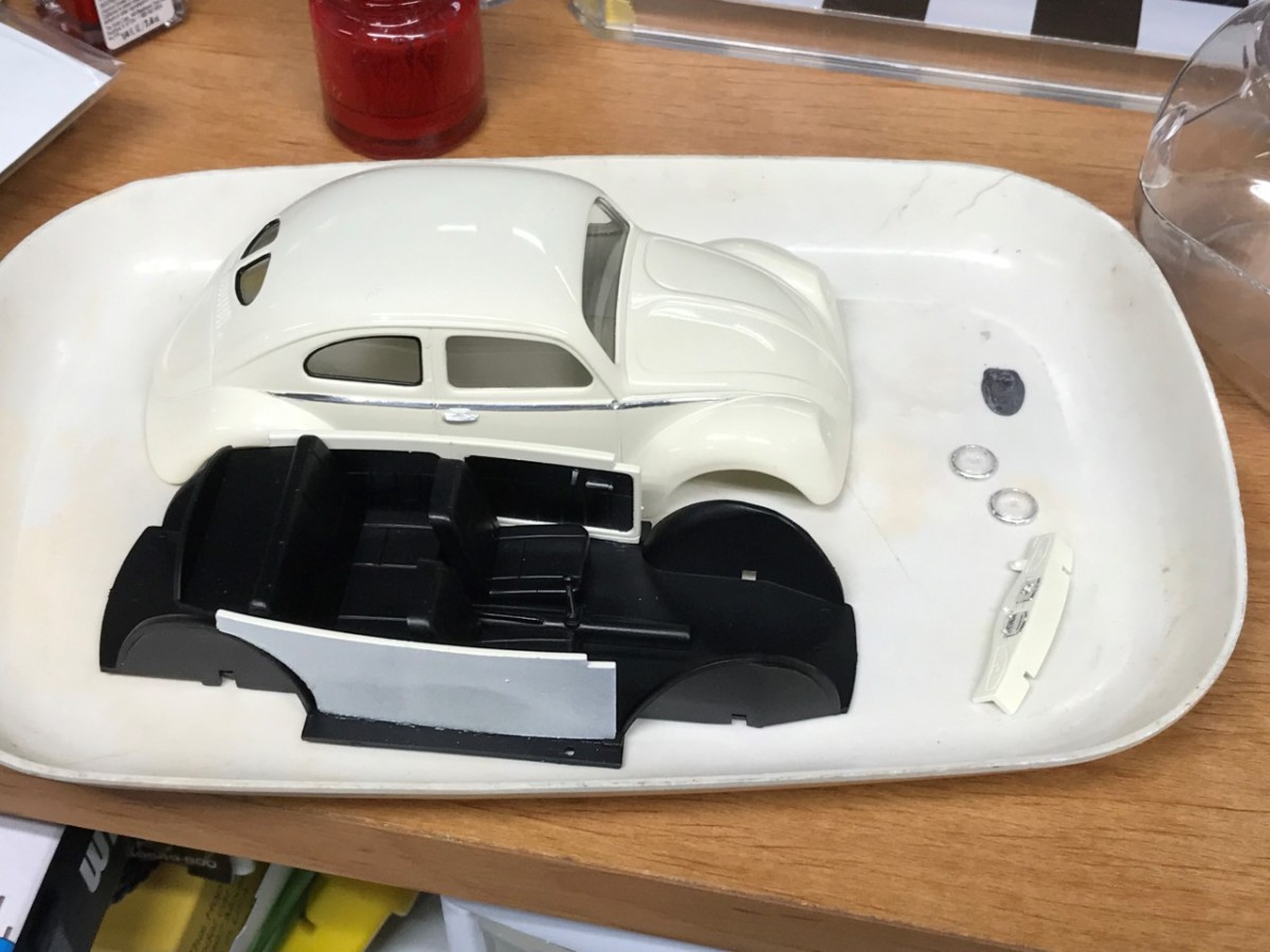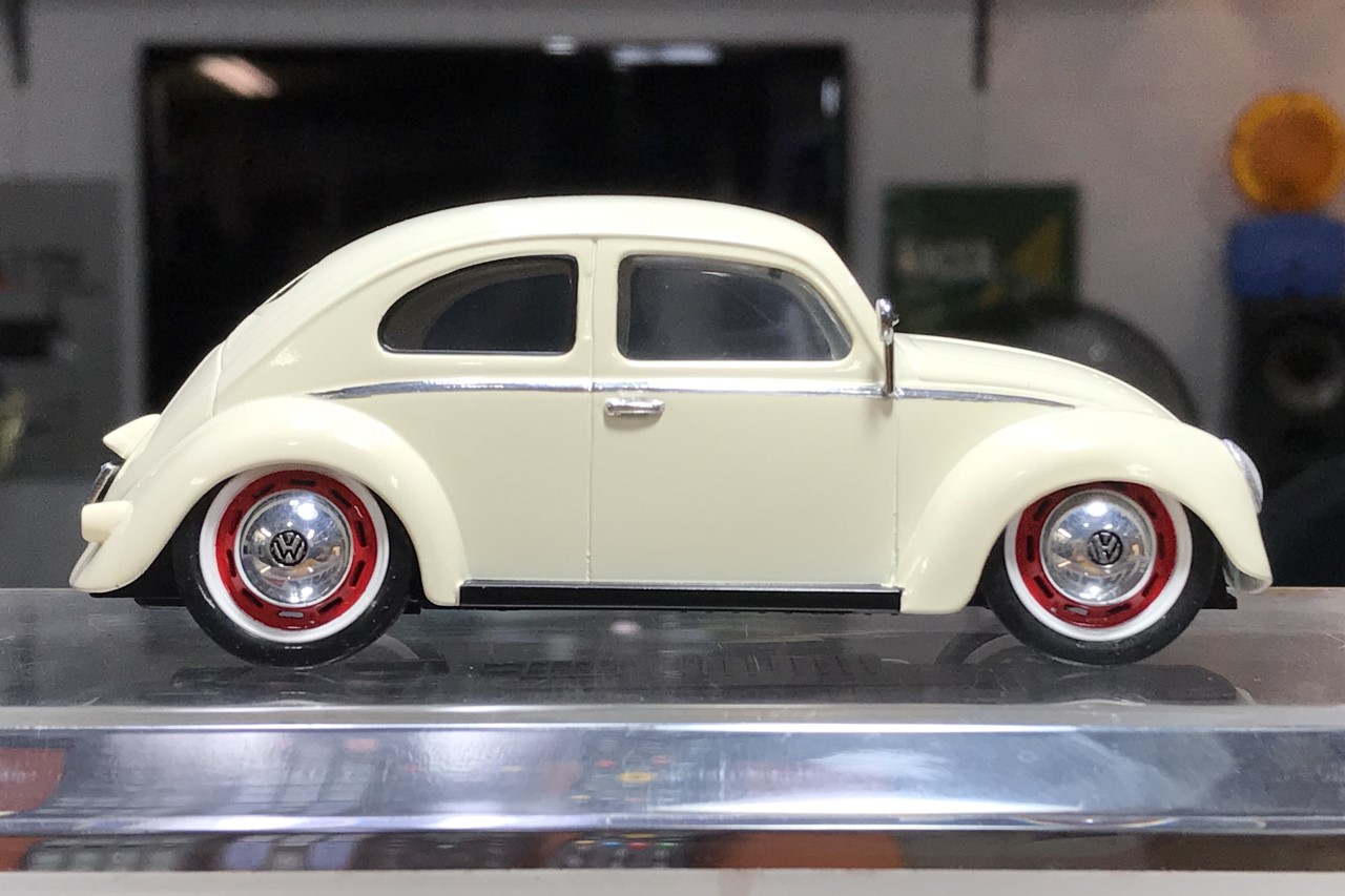 I chose Tamiya’s racing white after I saw another build in the same color. The kit wheels aren’t cast very well on top of the fact that they look small. Since I don’t tend to work with 1/32 scale kits, I don’t have any spare wheels and tires to use. I decided to use a set of 1/24 scale VW bus wheels to give the bug an over-sized aftermarket wheel look. The next challenge was finding a tire that would have the same overall diameter but the correct inner diameter. I found what I needed through Jel Claws slot car tires. The tires do not have tread but I wasn’t concerned. I did have to trim the width to make them fit in the wheel wells properly. One last detail that I felt was important to tone down the size of the wheels was to pant the rim white. In doing so, I’ve simulated a white wall tire.