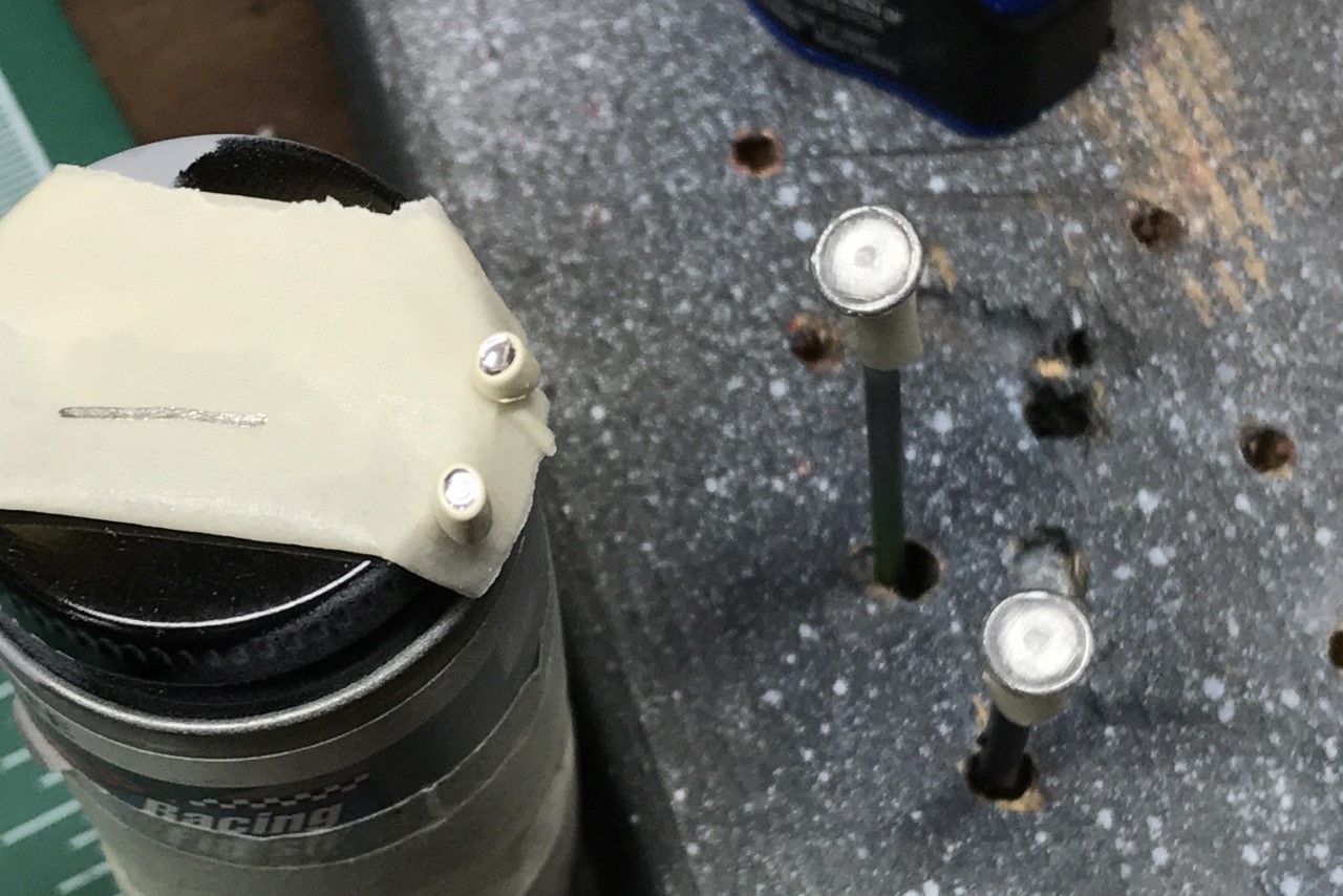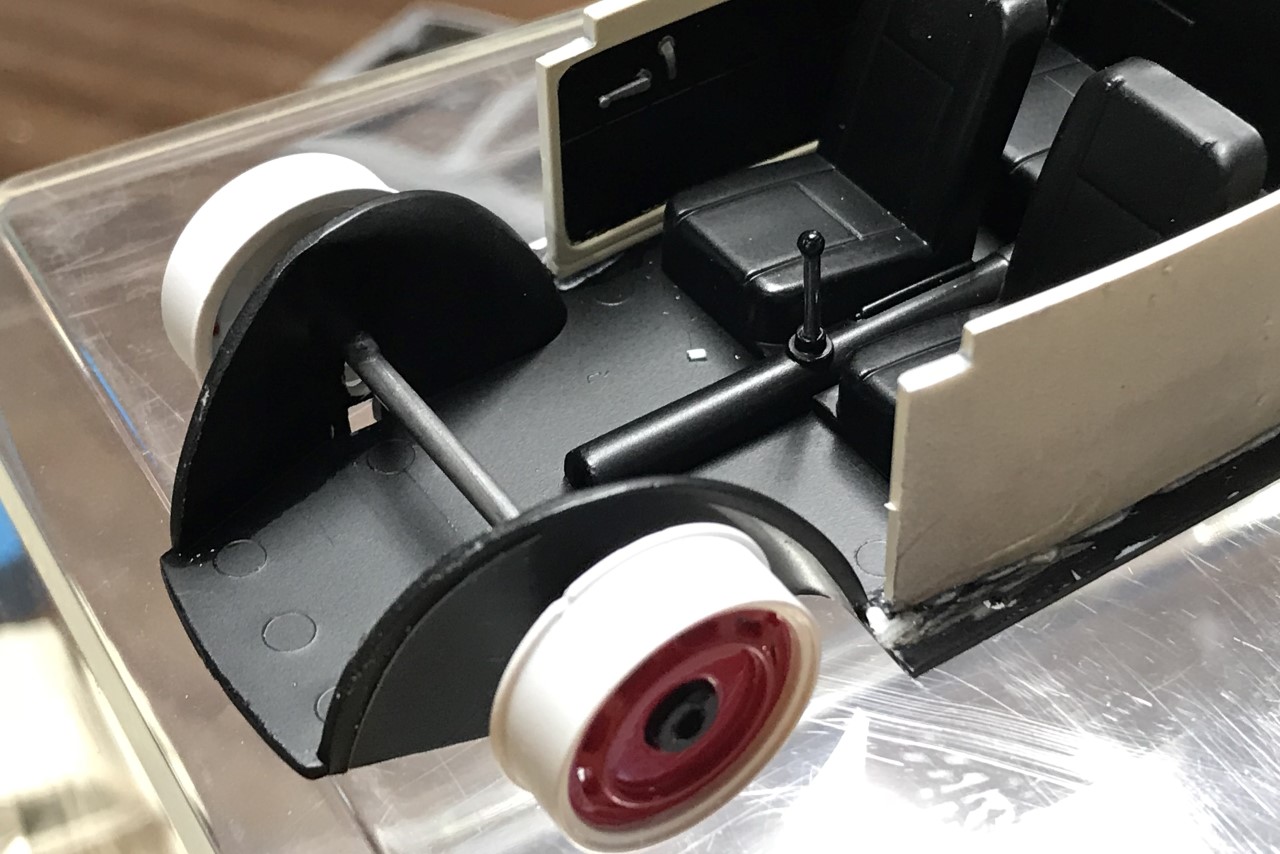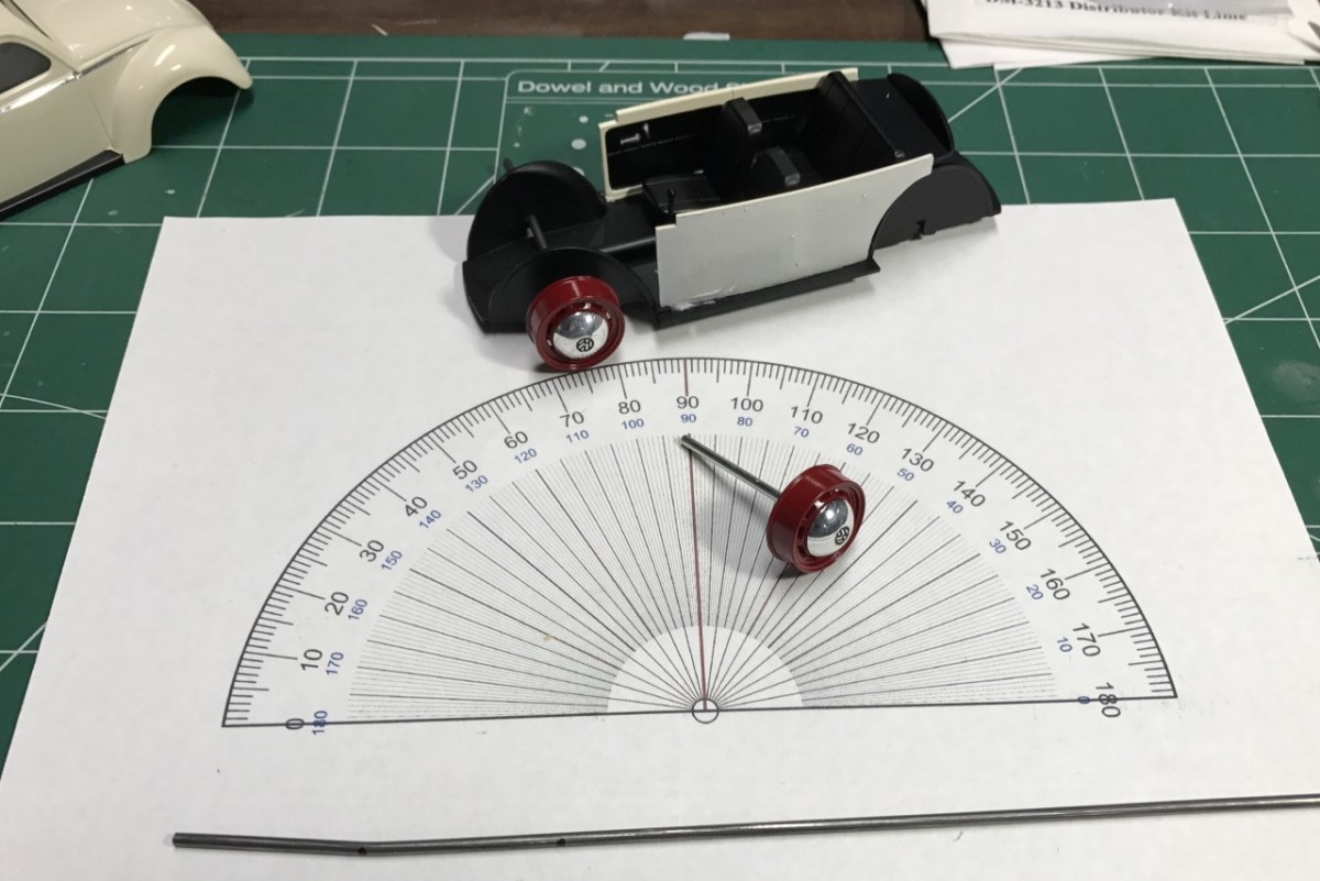 Adapting the new wheels and tires required new axles. The kit supplied metal axles were too short. While preparing new axles, I carefully bent the rear axle to add camber to complete the lowered appearance. I simply drilled the chassis pan to move the axles into position.