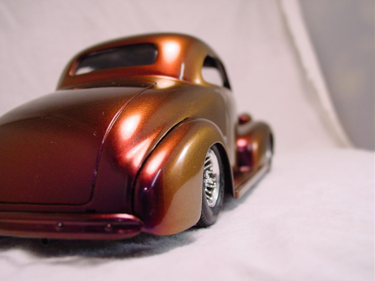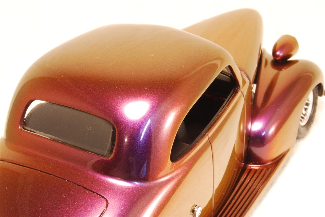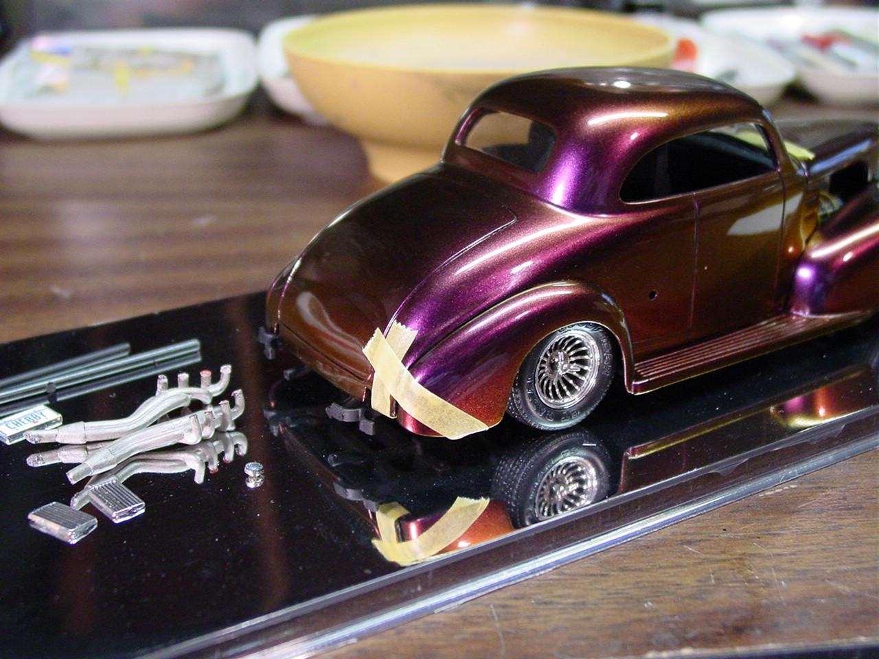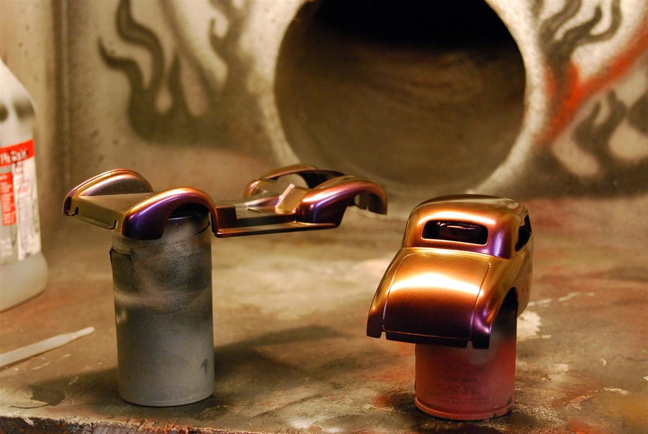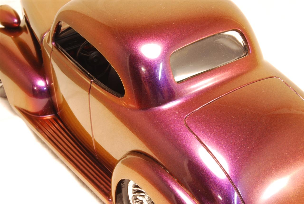 The comparison shot reveals most of the changes. I used ’65 Corvette wheels. I chopped the suspension as far as it would go. I then cut out the pillar creating a “coupe”. I also cut out the bar in the front window. Using body filler, I filled in all of the trim around the windows to make a very clean edge. I also scribed door lines which go well with the pillar-less look. The color is a “flip flop” that we carried at the hobby shop several years ago.