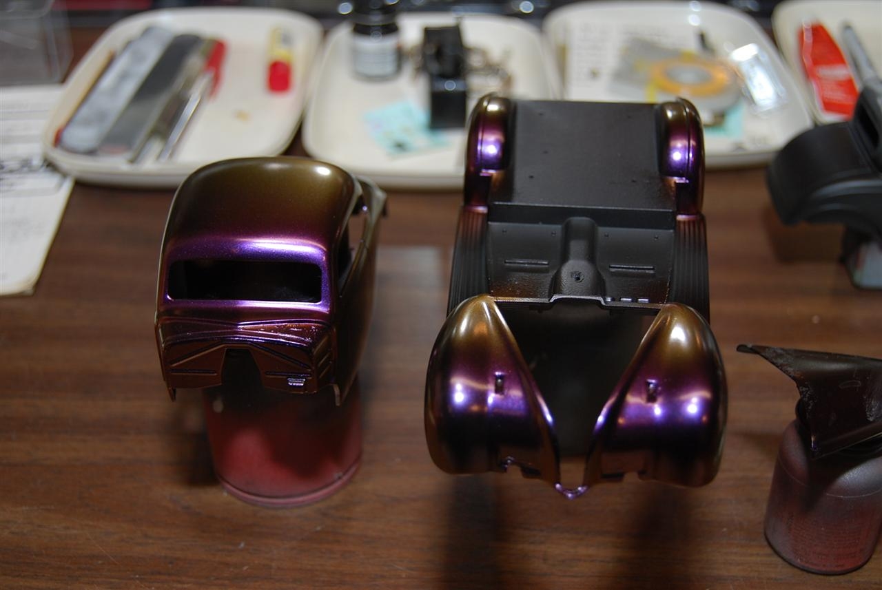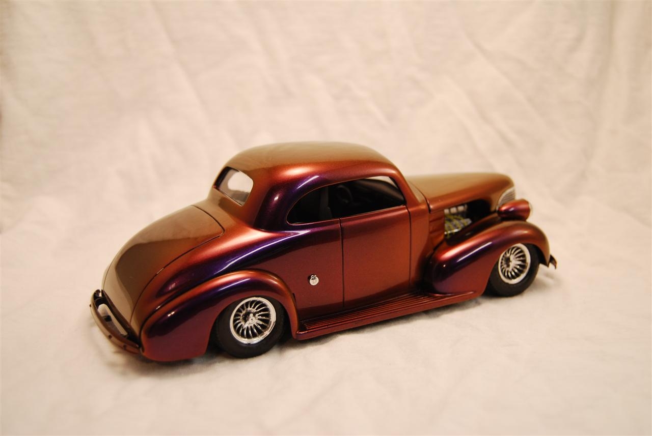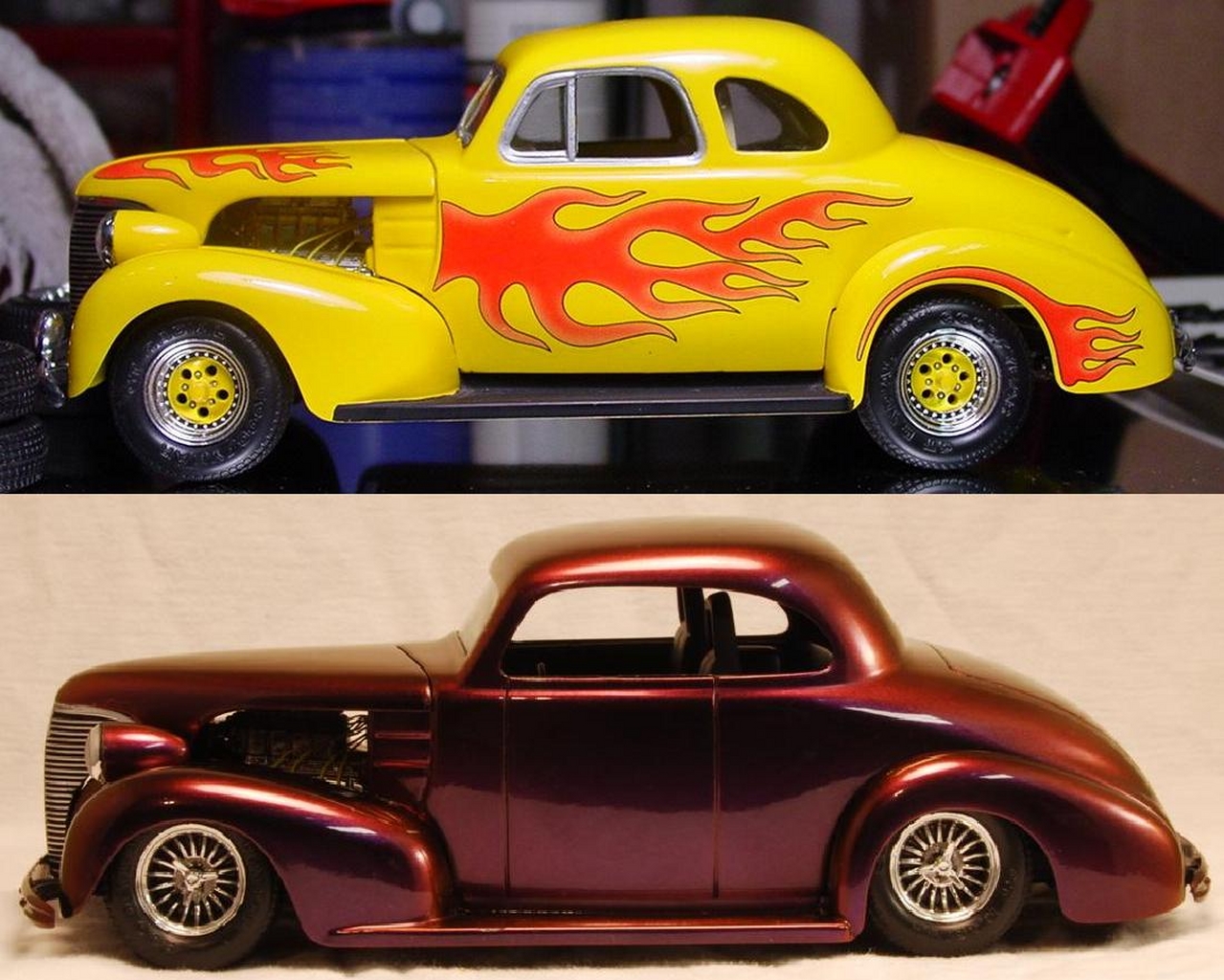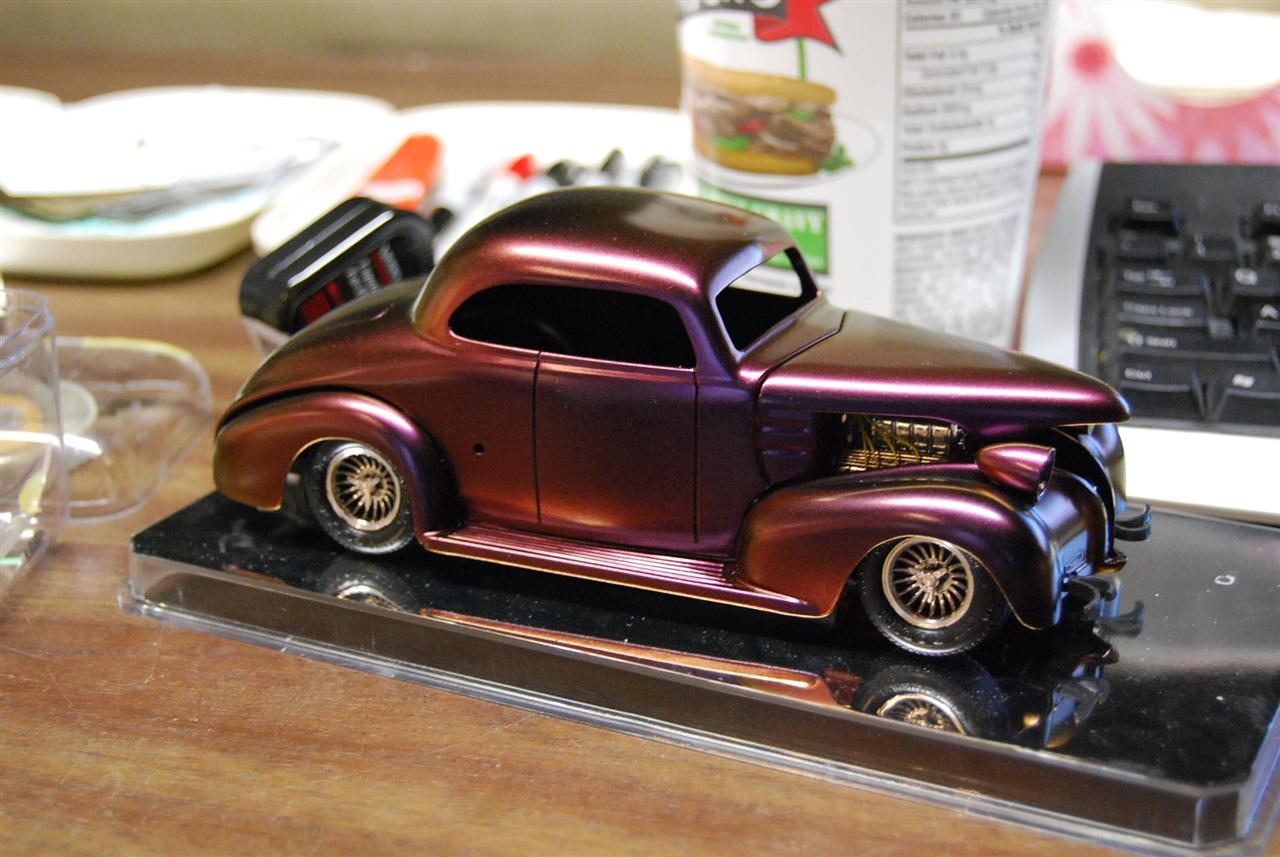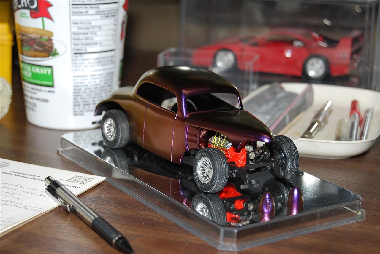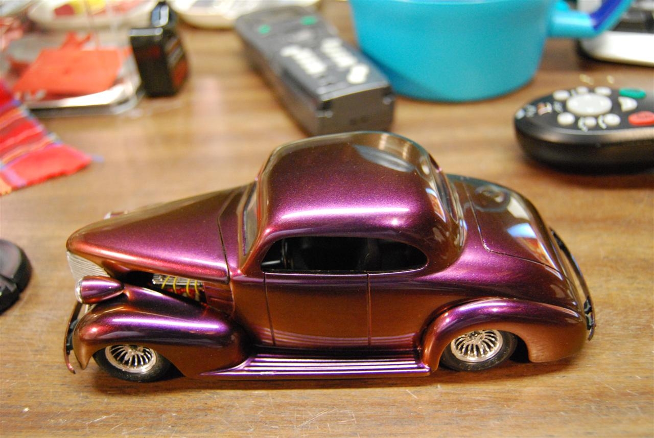 The comparison shot reveals most of the changes. I used ’65 Corvette wheels. I chopped the suspension as far as it would go. I then cut out the pillar creating a “coupe”. I also cut out the bar in the front window. Using body filler, I filled in all of the trim around the windows to make a very clean edge. I also scribed door lines which go well with the pillar-less look. The color is a “flip flop” that we carried at the hobby shop several years ago.
