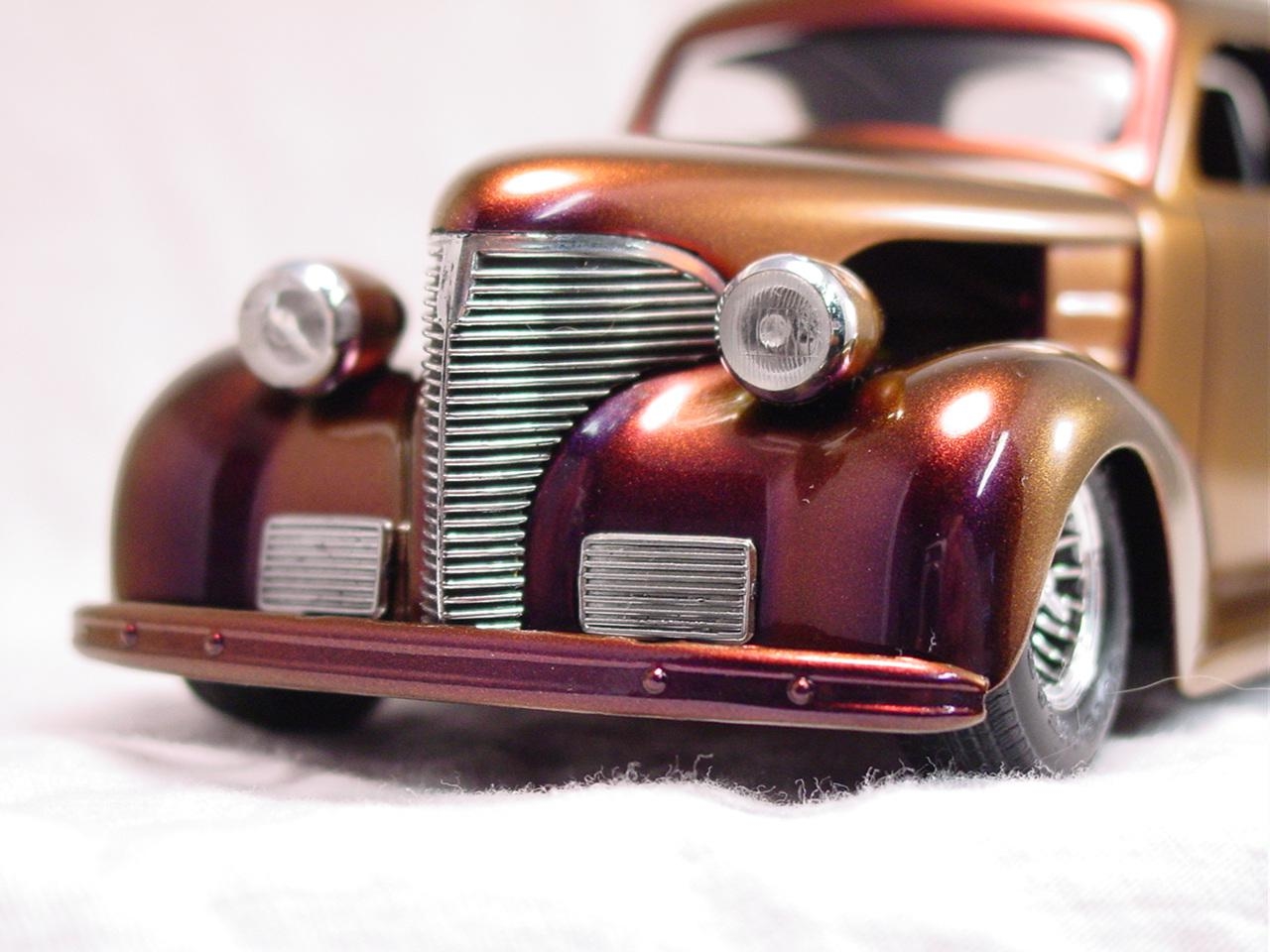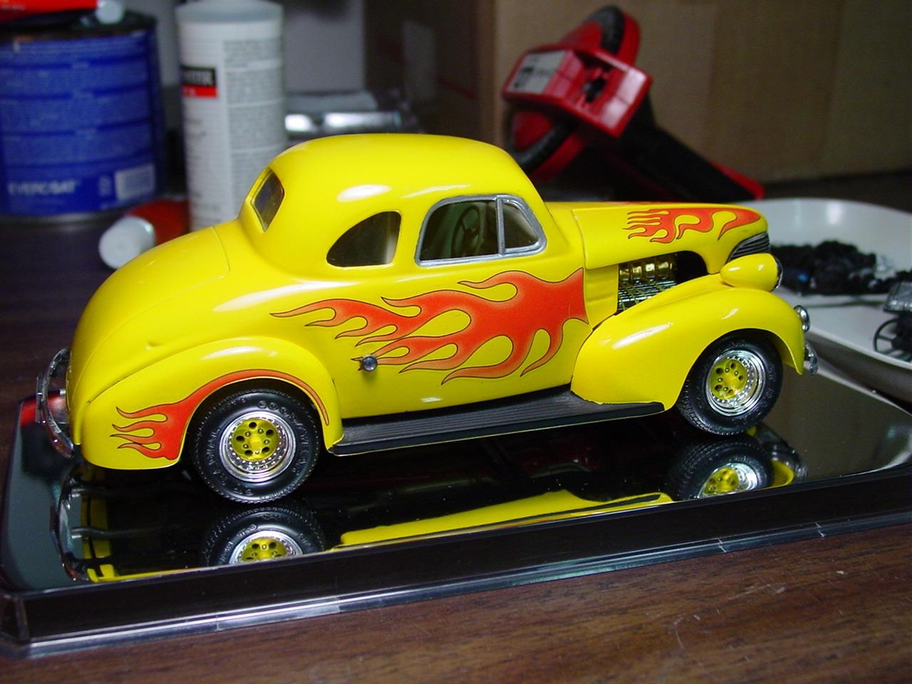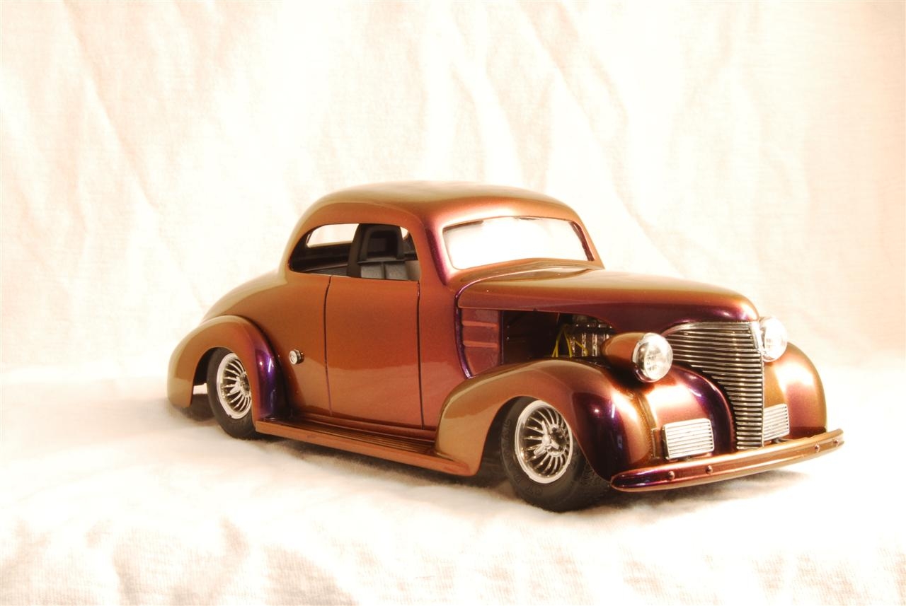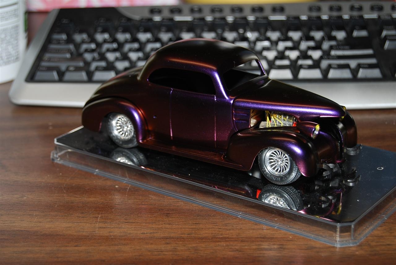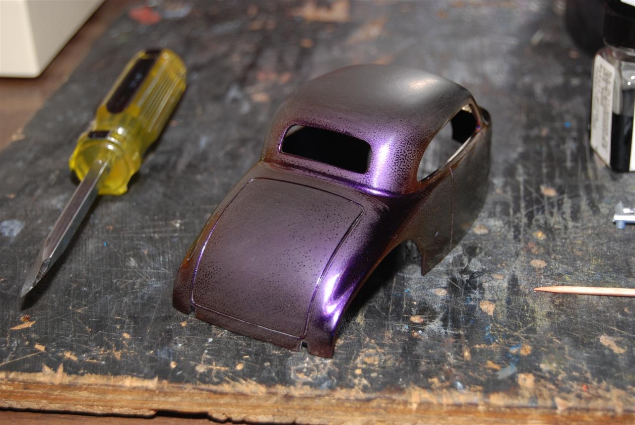 The comparison shot reveals most of the changes. I used ’65 Corvette wheels. I chopped the suspension as far as it would go. I then cut out the pillar creating a “coupe”. I also cut out the bar in the front window. Using body filler, I filled in all of the trim around the windows to make a very clean edge. I also scribed door lines which go well with the pillar-less look. The color is a “flip flop” that we carried at the hobby shop several years ago.