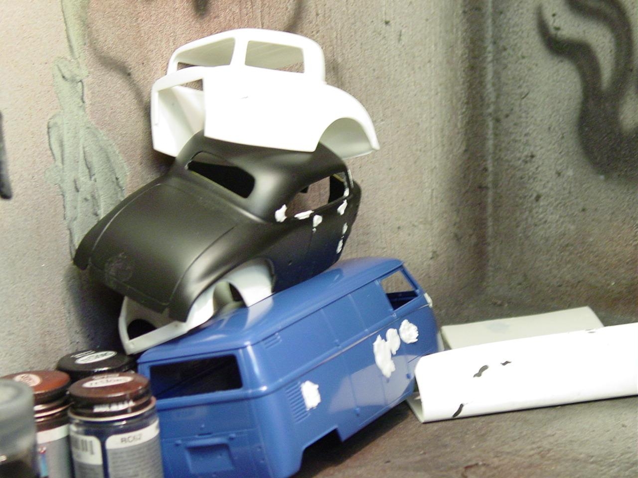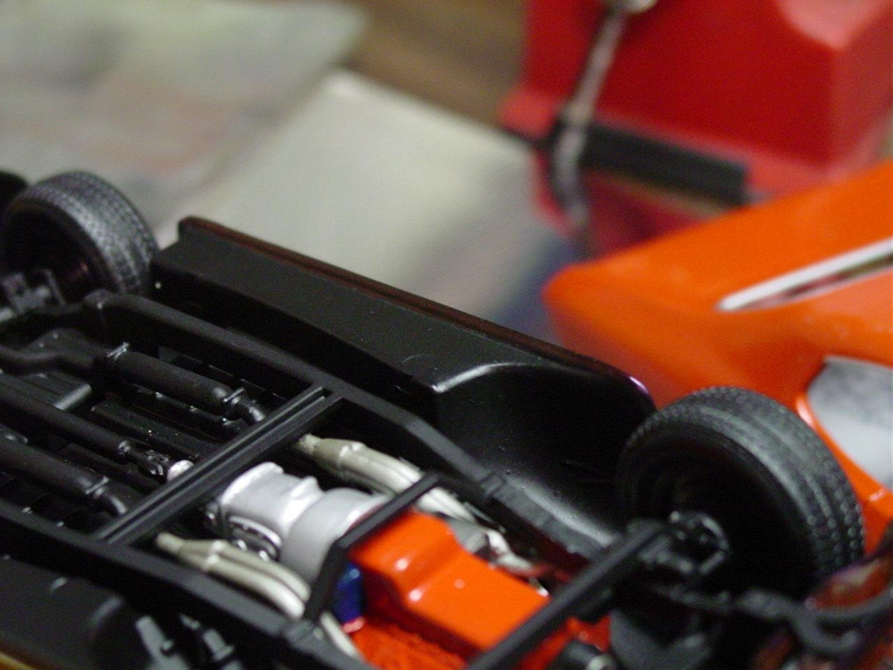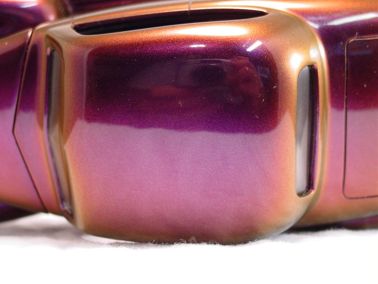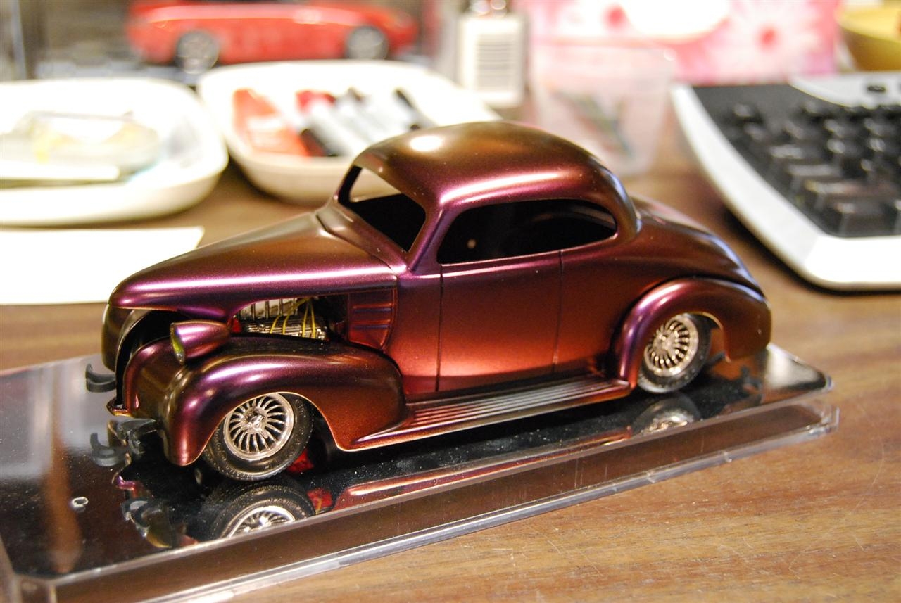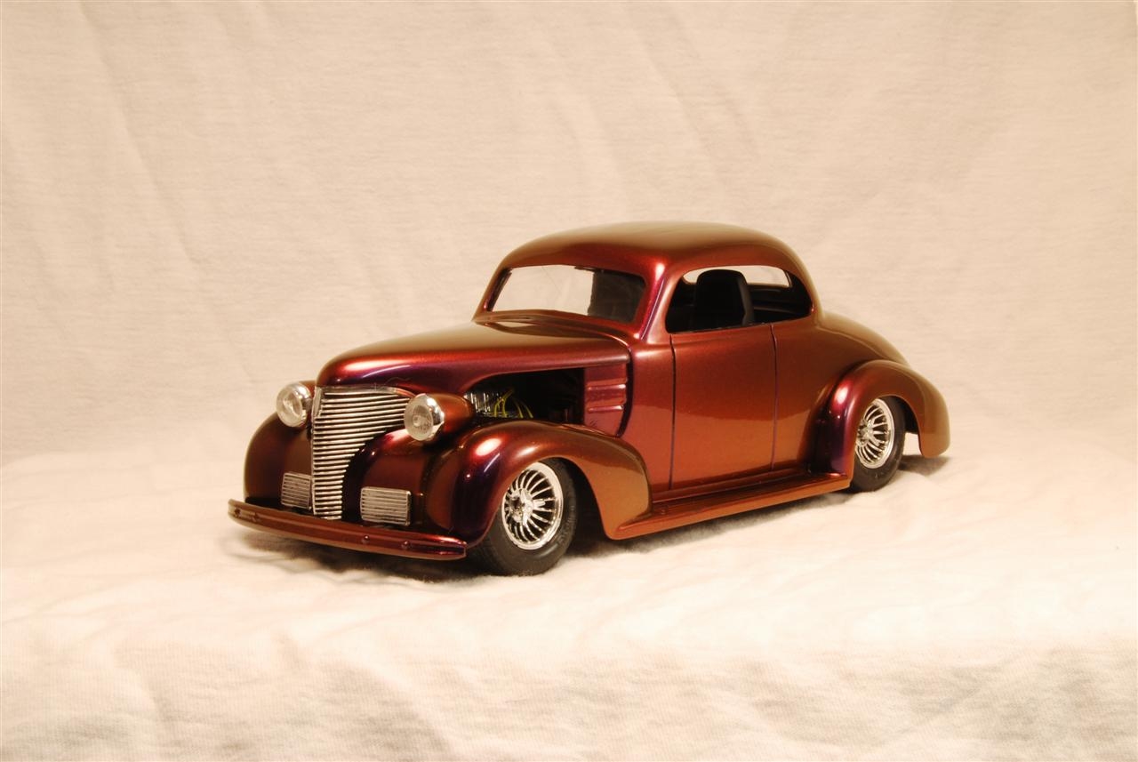 The comparison shot reveals most of the changes. I used ’65 Corvette wheels. I chopped the suspension as far as it would go. I then cut out the pillar creating a “coupe”. I also cut out the bar in the front window. Using body filler, I filled in all of the trim around the windows to make a very clean edge. I also scribed door lines which go well with the pillar-less look. The color is a “flip flop” that we carried at the hobby shop several years ago.