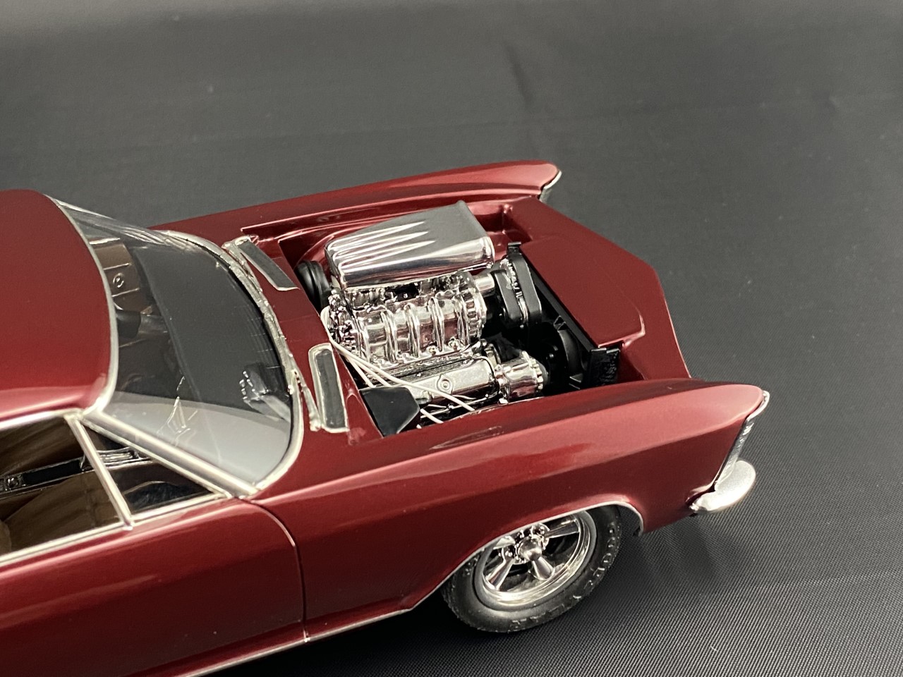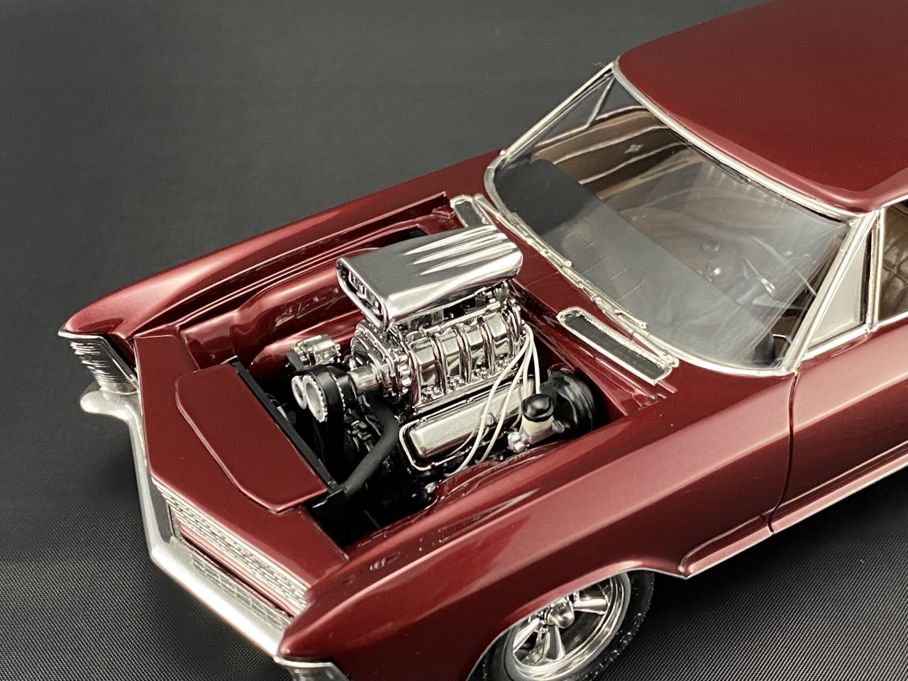 While planning this build, I realized the most important part of the model would be the engine bay. I wanted to be a bit rowdy and install a blown big block Chevy. I raided my spares and found a big block from a ’69 Camaro and used the blower from a ’79 Camaro. Every part was stripped and seams filled as necessary. All chrome parts were finished with Spaz Stix chrome paint over Testors enamel gloss. The block itself was painted Tamiya gunmetal.