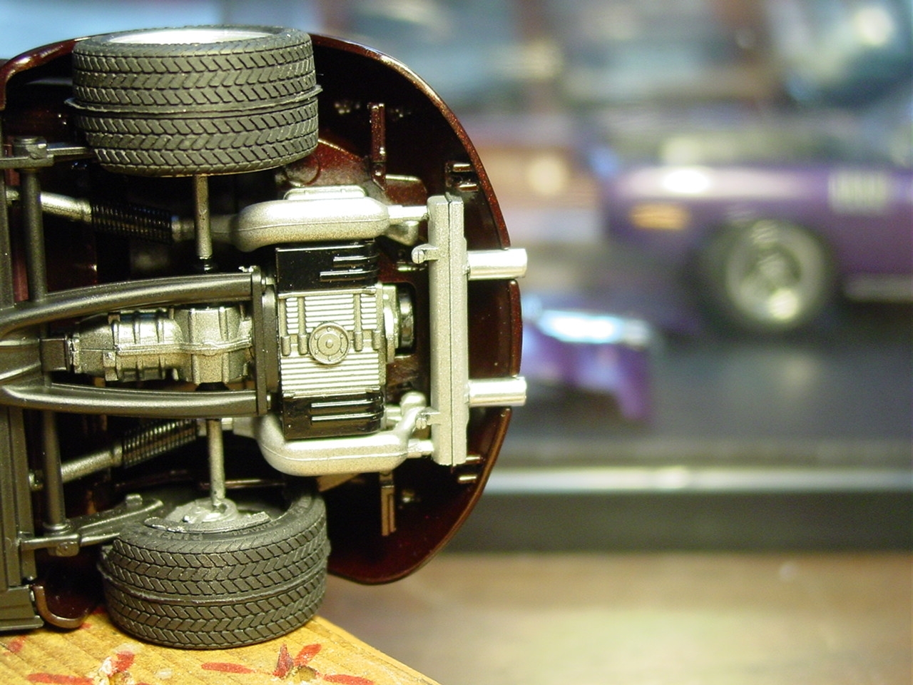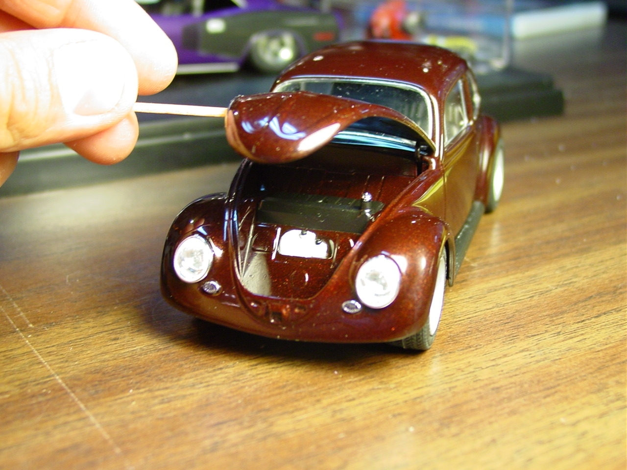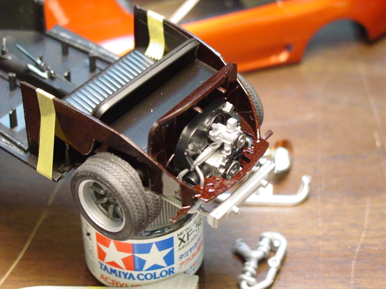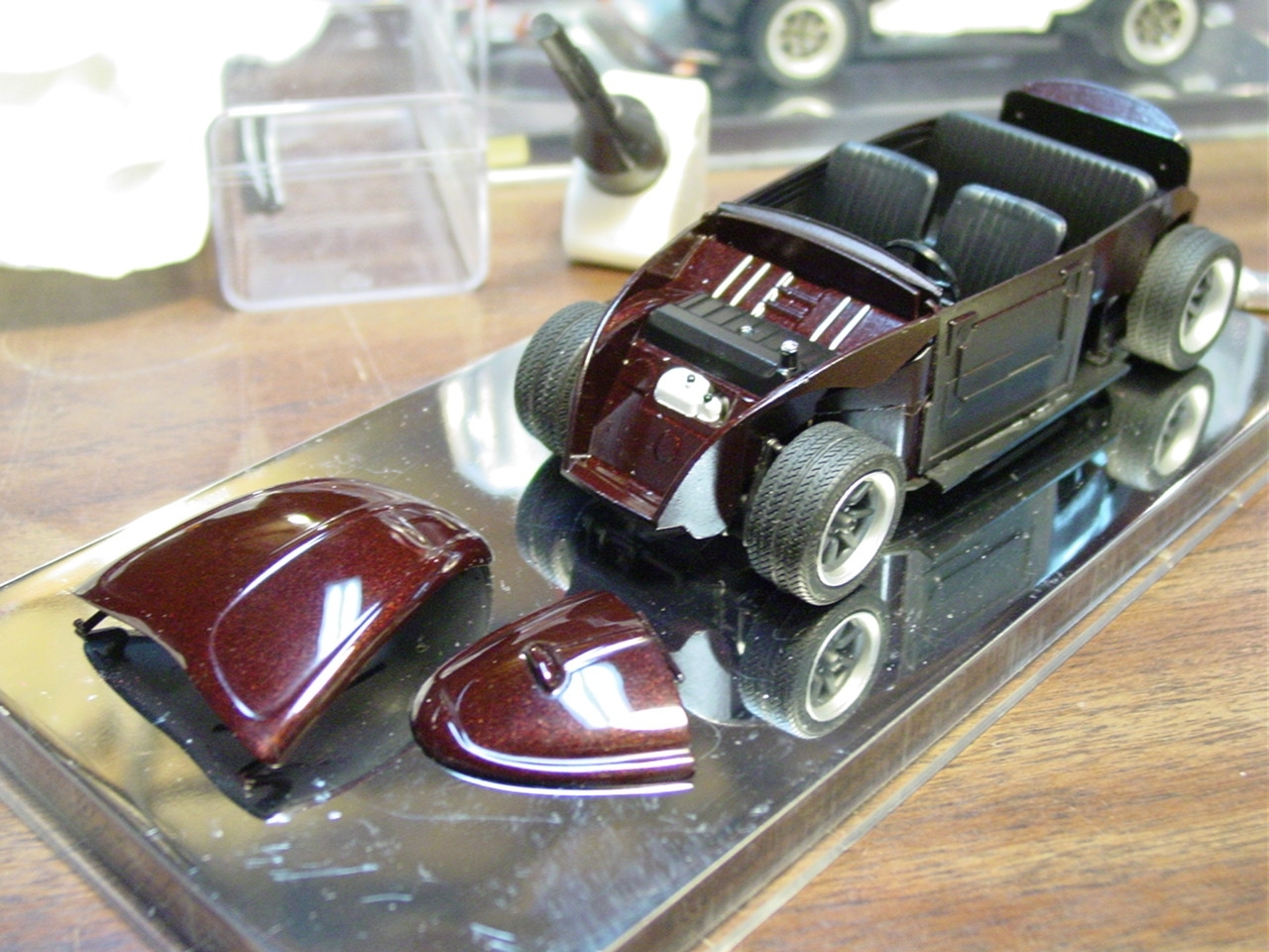 Fundamentally, there was nothing wrong with this kit.  It turned out really well.  As with most restoration and rebuild projects, I will find a way to make it even better.  My original intention with this kit was to detail paint the wheels.  Since the wheels were glued in place, I was gong to have pull the kit apart.  While pulling it apart, I realized that I never painted the trim on the windows.  As I was popping out the windows, I chipped the paint.  Rather than touch up the paint and move on, I elected to respray the kit.  I eventually decided to add more detail to the kit by painting more of the interior and under hood/engine cover details.  The paint is Testor’s Metallic Red with a black base coat.  The black base gives the metallic red the black cherry look.  This will also be my first project to include bare metal foil for window trim.
