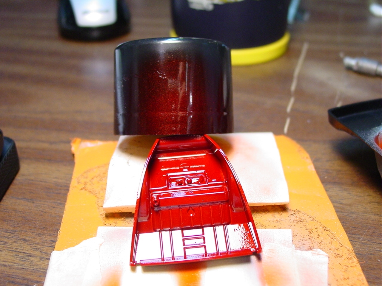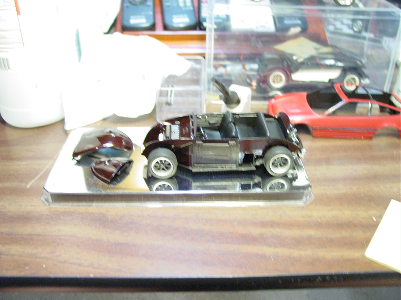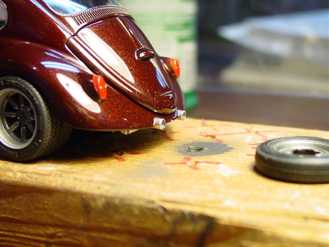 Fundamentally, there was nothing wrong with this kit.  It turned out really well.  As with most restoration and rebuild projects, I will find a way to make it even better.  My original intention with this kit was to detail paint the wheels.  Since the wheels were glued in place, I was gong to have pull the kit apart.  While pulling it apart, I realized that I never painted the trim on the windows.  As I was popping out the windows, I chipped the paint.  Rather than touch up the paint and move on, I elected to respray the kit.  I eventually decided to add more detail to the kit by painting more of the interior and under hood/engine cover details.  The paint is Testor’s Metallic Red with a black base coat.  The black base gives the metallic red the black cherry look.  This will also be my first project to include bare metal foil for window trim.