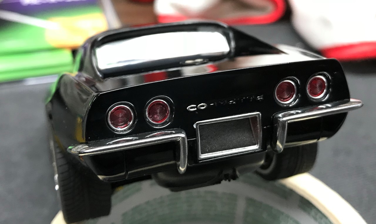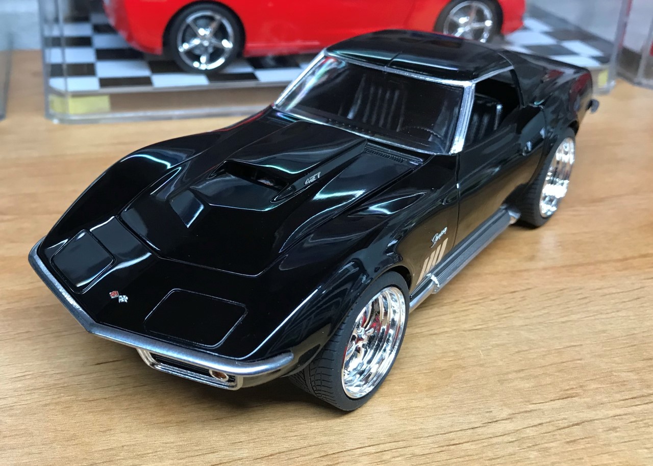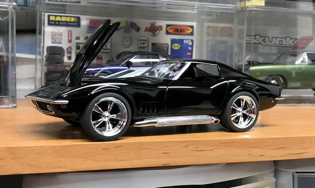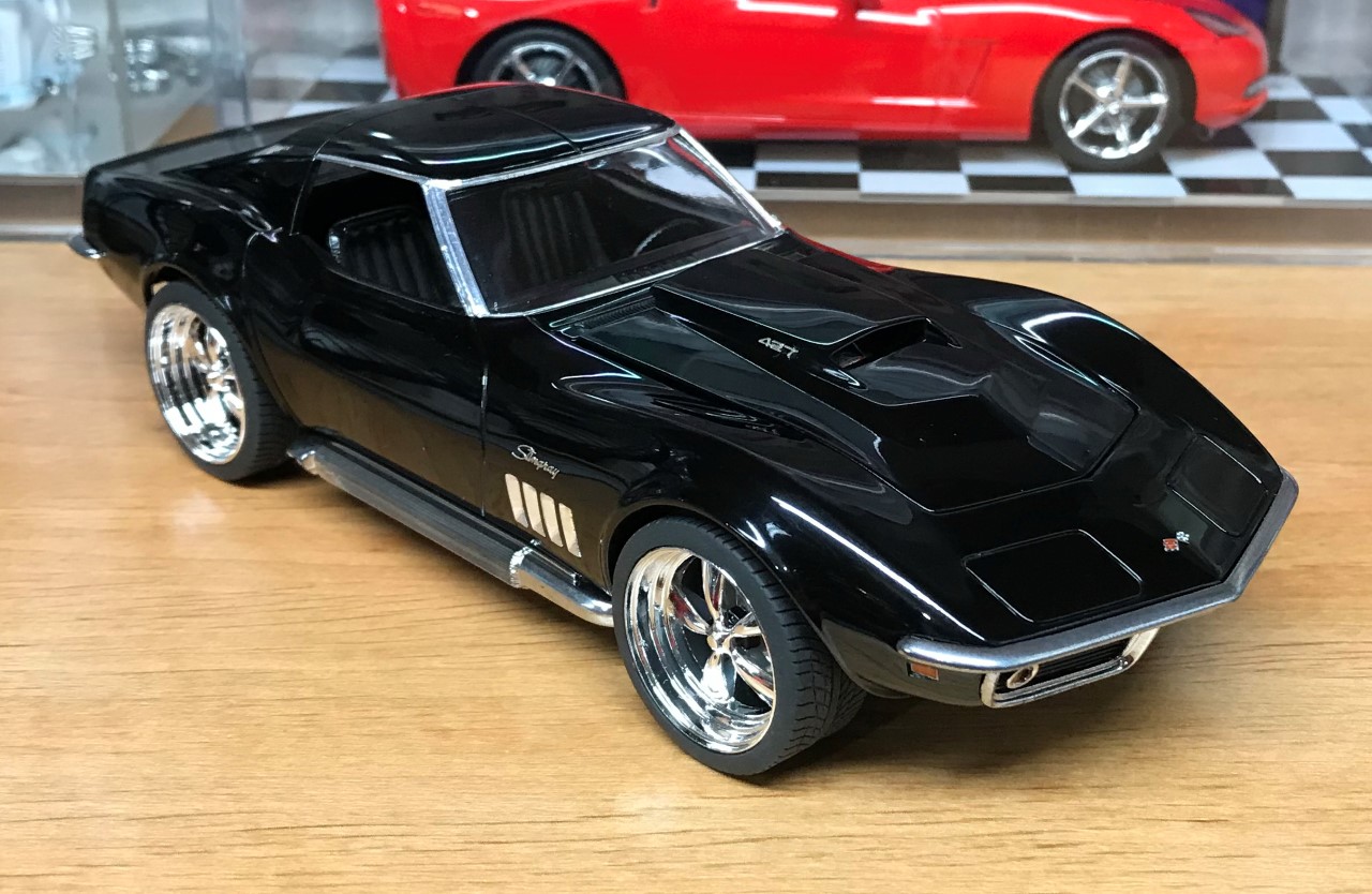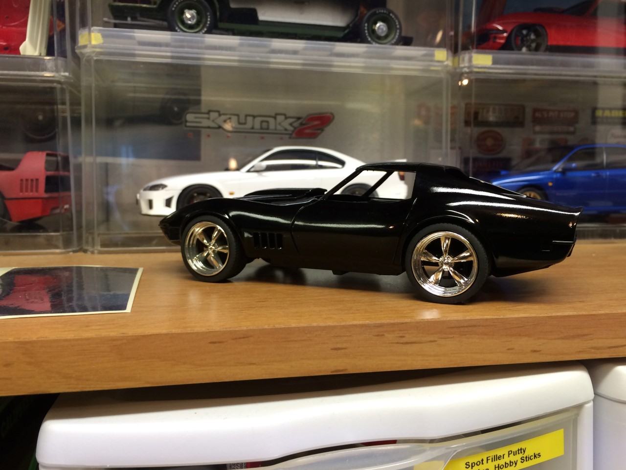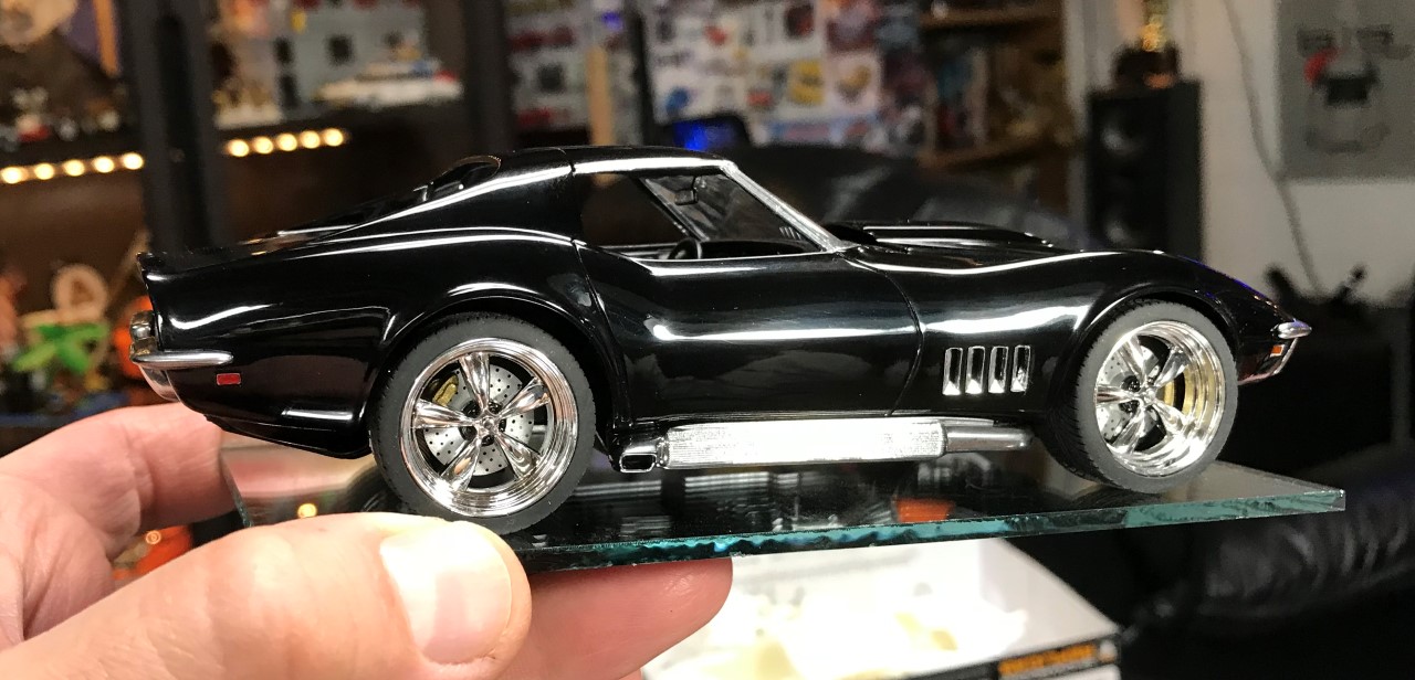 I found a picture online of this Vette painted in black with black ralley wheels. I tried finding Chevy ralley wheels without center caps but didn’t have any luck. I decided to stick with the Pegasus wheels and black for the color.
