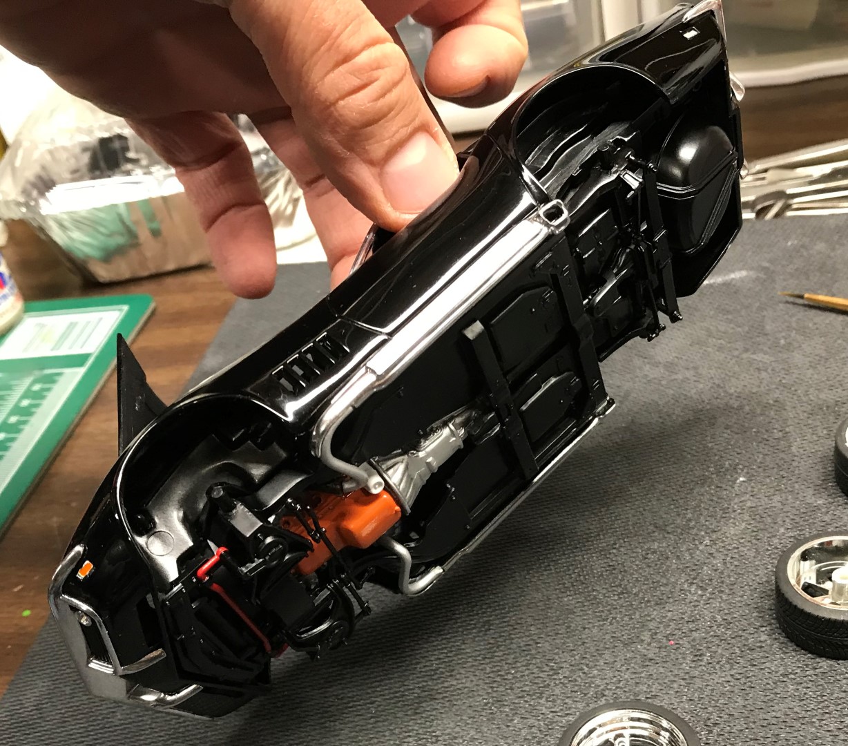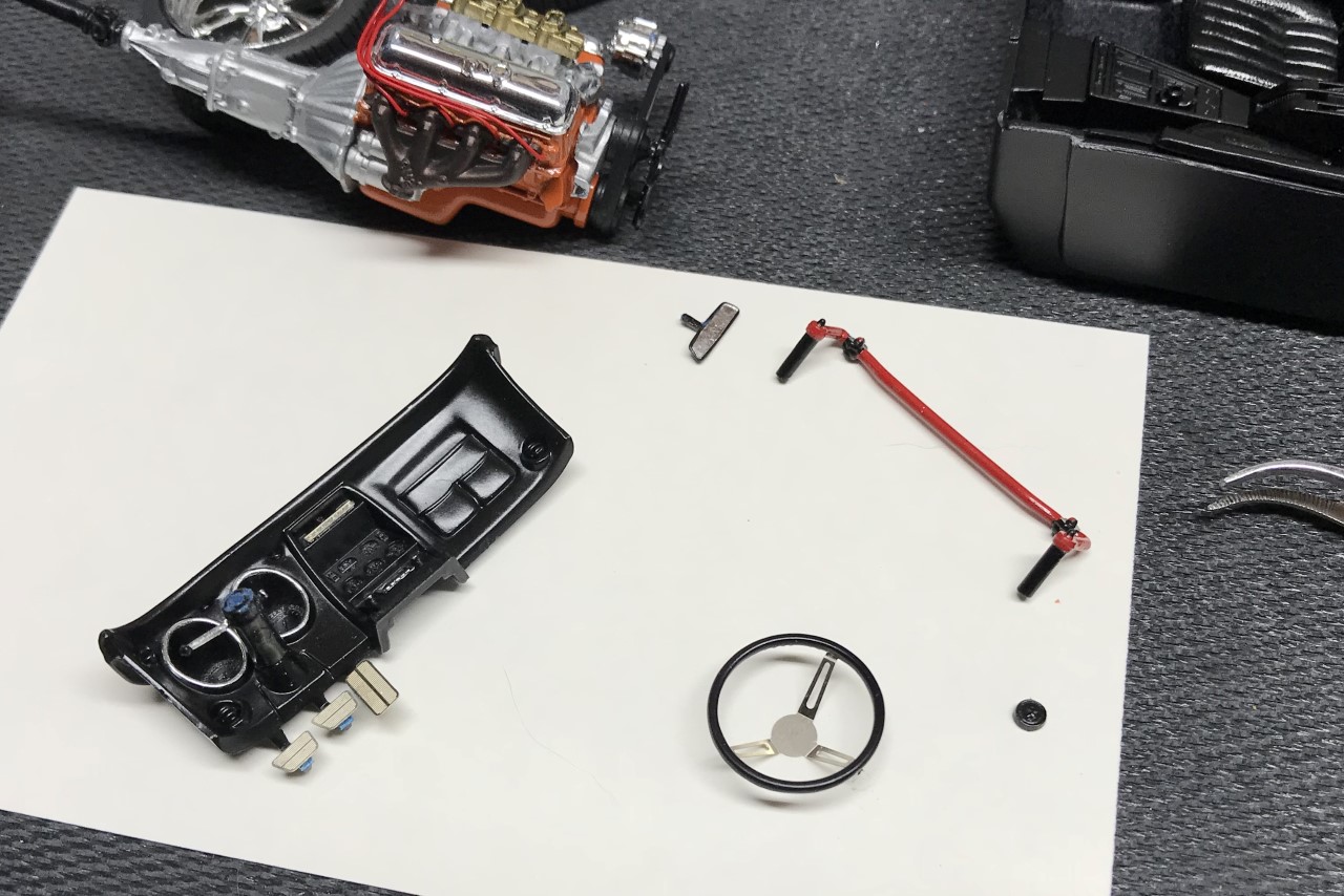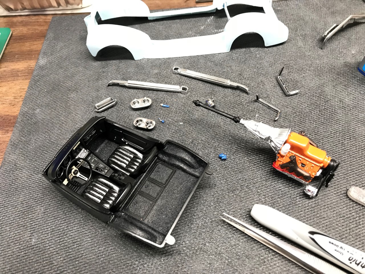 Once the body was painted, I moved on to finishing the interior with flocking, and photoetch parts. I really enjoyed modifying the steering wheel with photo etch spokes. For the chassis and suspension, I noticed that I needed to respray for a few different reasons. Once that was complete, I was able to finish the engine and chassis assembly.