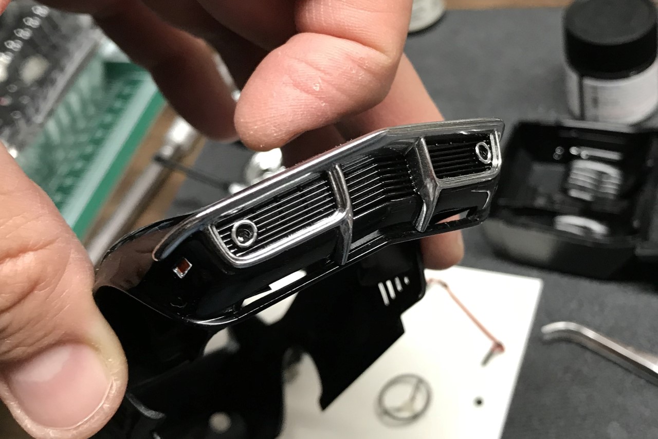 As intimated as I was by the black paint, the detail work was eve more so. I realized that the gills in the front fenders had to be chrome. I couldn’t decide if I wanted to try Molotow chrome or bare metal foil for work. In the end, I used both. It was a huge pain but it turned out really well. I had to strip and re-chrome all of the kit’s chrome parts. The chrome was transparent in some places or the parts had obvious mold lines and flashing. I stripped them, sanded all of the imperfections and finished them with gloss black and alcald chrome. Once that was done, it was time to move onto the photo etch. I was pleasantly surprised at how easy they were to use. I bought wax tipped sticks to hold the pieces and then used Tamiya acrylic gloss clear as the adhesive. I took the time to paint the flag emblems and I’m thrilled by the results.