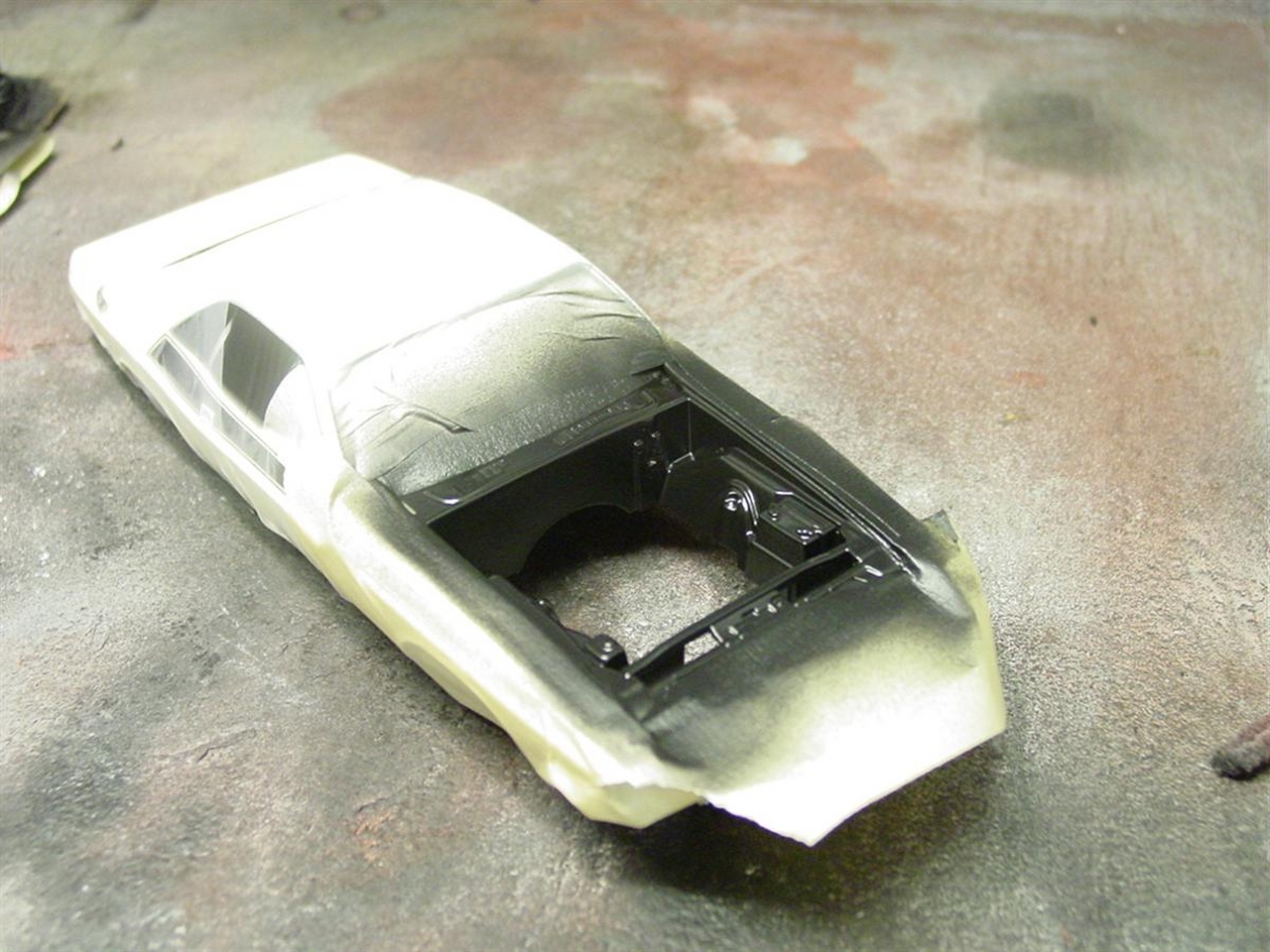 The original set of wheels used on this kit were the “torque” wheels from the 1970 GTX kit. I decided to pilfer them for my ’70 Mustang. While I was preparing a new set of wheels for the Challenger, I decided to paint the interior black along with the engine bay. Also, before my days of using body filler to shave just about anything, I would leave side indicators unpainted. With my improved skills and quite a bit of parafilm, I masked everything and airbrushed the side markers.