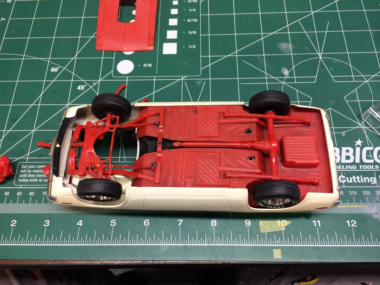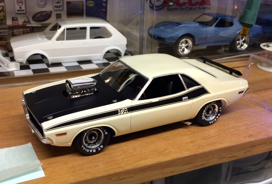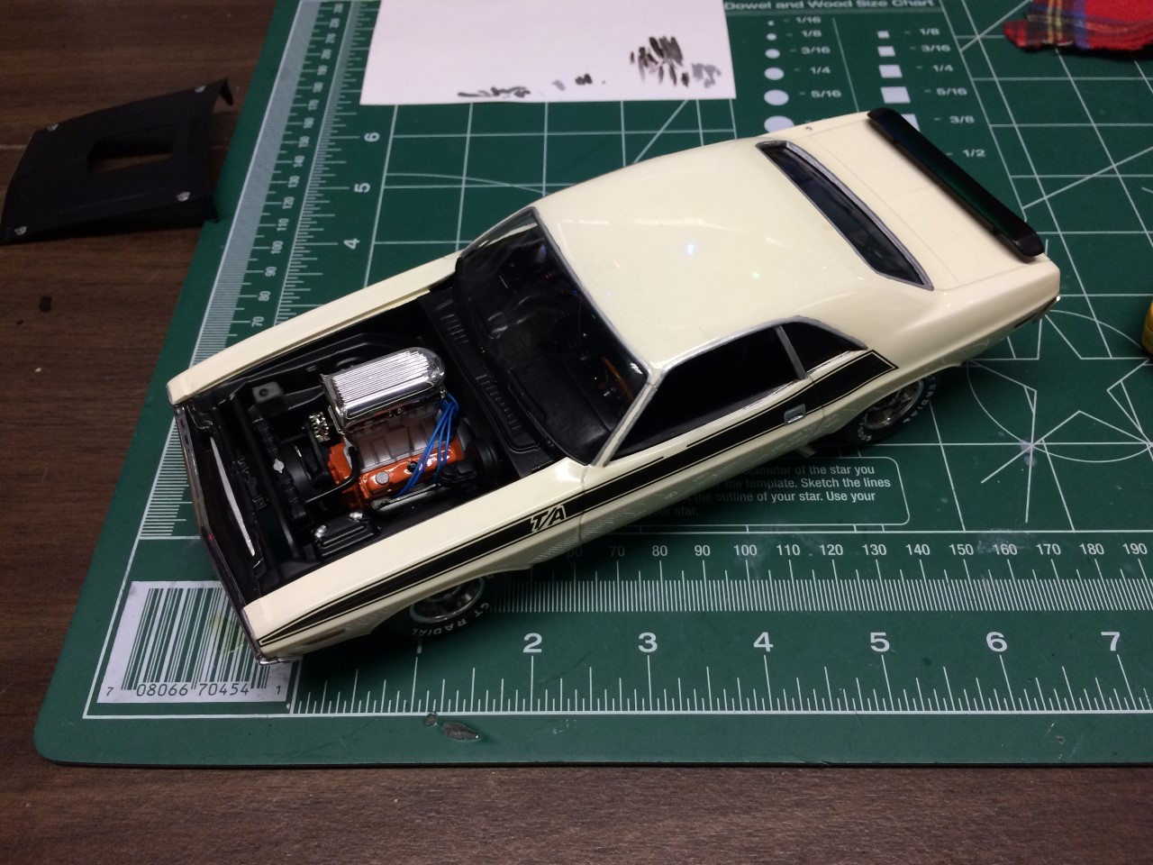 …Down the road came in 2014. I have to admit that in recent years, this kit had lost its luster. It was my first experience with Testors clear over white. It drastically yellowed the paint. The ’70 GTX parts didn’t fit. I used the wider suspension to help fill the wheel wells. Looking at it now, it is too wide and the modifications I made over 10 years ago to make it all fit were ridiculous. I thought about once again changing the wheels to change the look. However, I decided to pull a virtually un-painted ’70 challenger and swapped the chassis. I also added tires with white lettering and detail painted rally wheels. The impact of the change was profound. I thought about scrapping this kit altogether and building the unpainted model, but the novice mistakes I made on the older kit were irreversible. I chose to strip all of the paint off of the older kit’s contribution, the chassis, suspension, and engine. I will also use the 340 engine with tunnel ram intake.