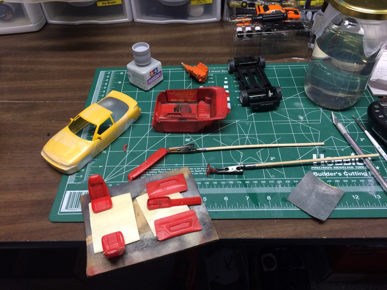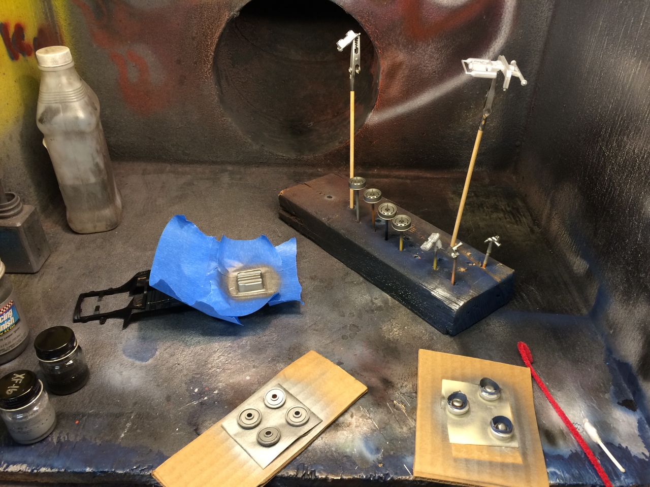 I knew I wouldn’t be able to match the discolored white paint and in reality, I wanted this project to go quickly. With that in mind, I painted the chassis and suspension parts satin black and highlighted brake and fuel lines with sharpie markers. I finished the chassis by painting the gas tank. I finished painting the wheels and worked on smoothing out the seams on the engine.