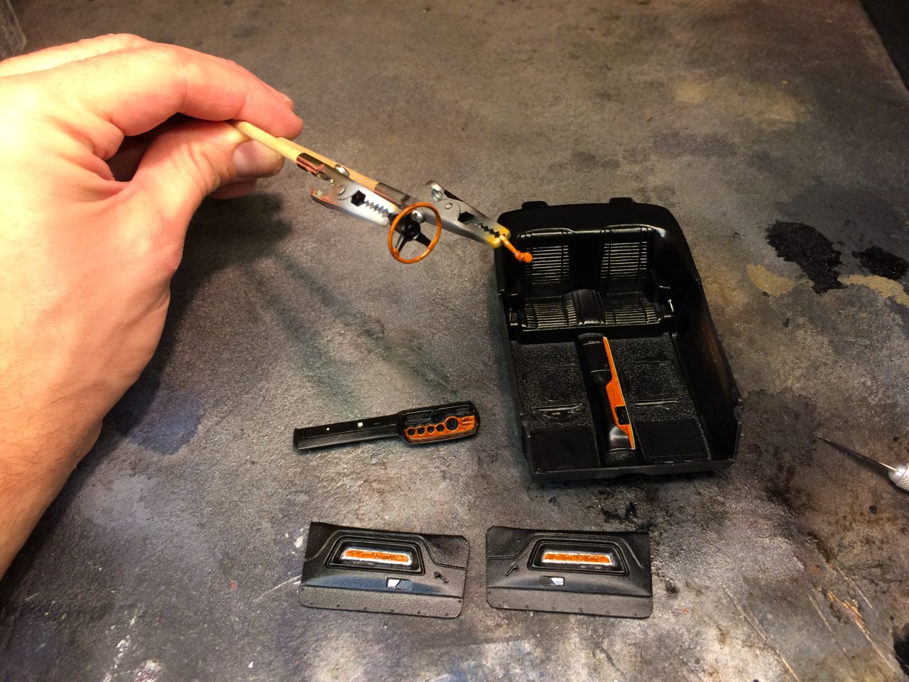 When I came back to the project a few months later, I decided that I wanted a fresh interior as well. Using the recently stripped interior from the donor kit, I sprayed it satin black, used bare metal foil for the trim on the door panels and painted the wood grain. I have to say that the technique doesn’t start out looking that great. If you stick with it from start to finish, the wood grain turns out really well.
