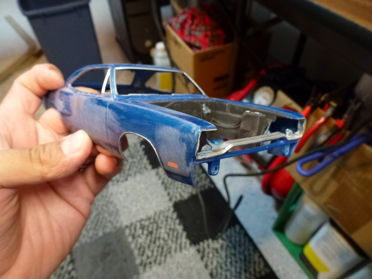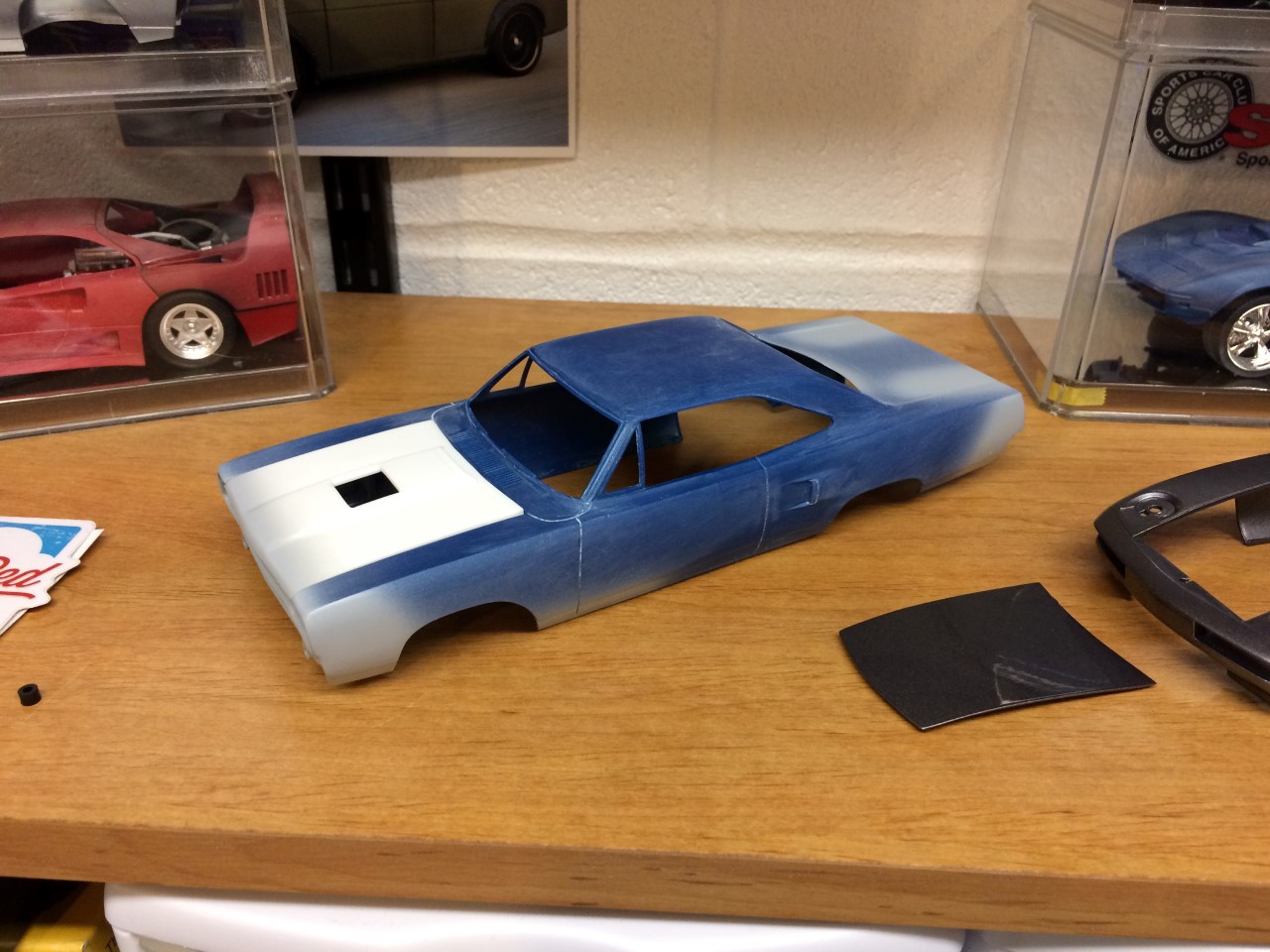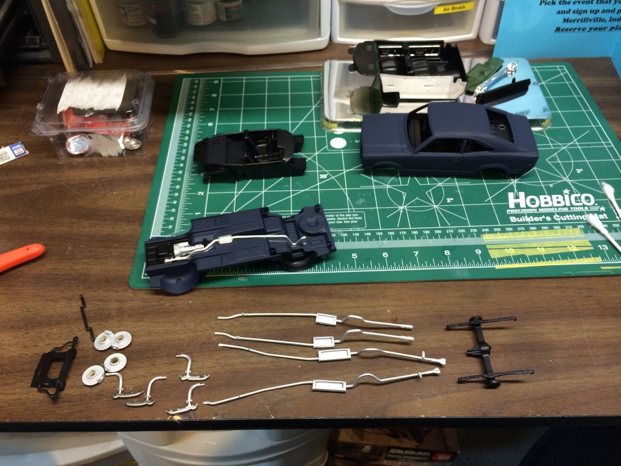 I bought this kit nearly 20 years ago and started building it. The original idea was to paint it true blue pearl but I used the wrong base and it didn’t turn out well. To make matters worse, the body was warped. I stuffed everything back into the box and set it aside. While eyeballing the completed, but unpainted GTX on my shelf, I decided to tear it apart and use the body to replaced the warped mess that came with this kit. This happened some time in 2005. While I started preparing the body, I ground down the door handles and side markers…which unfortunately, was my standard operating procedure at the time. I tended to grind away details that I struggled to finish. Regardless, I started the work and once again, stuffed all of the parts back in the box.
