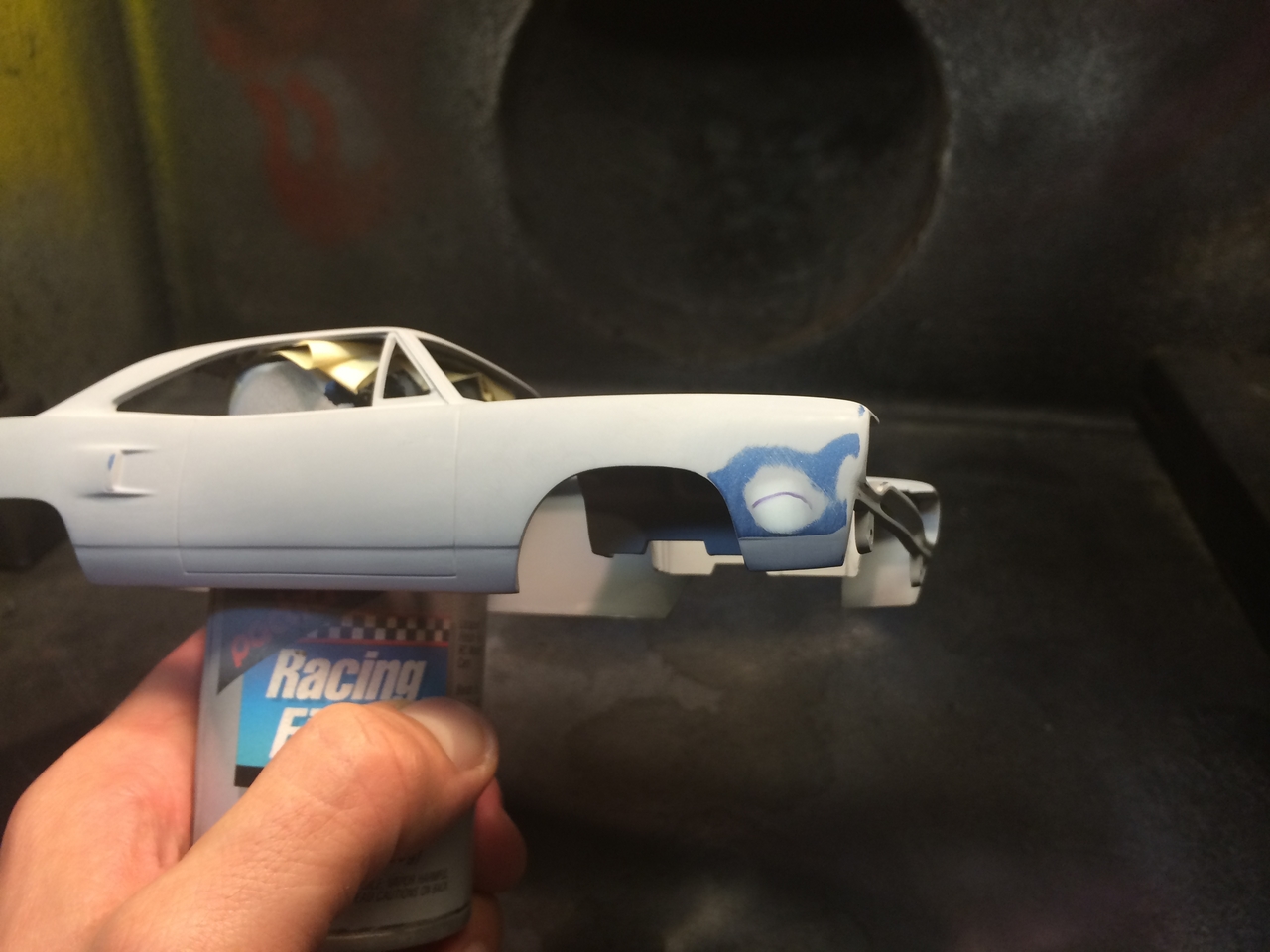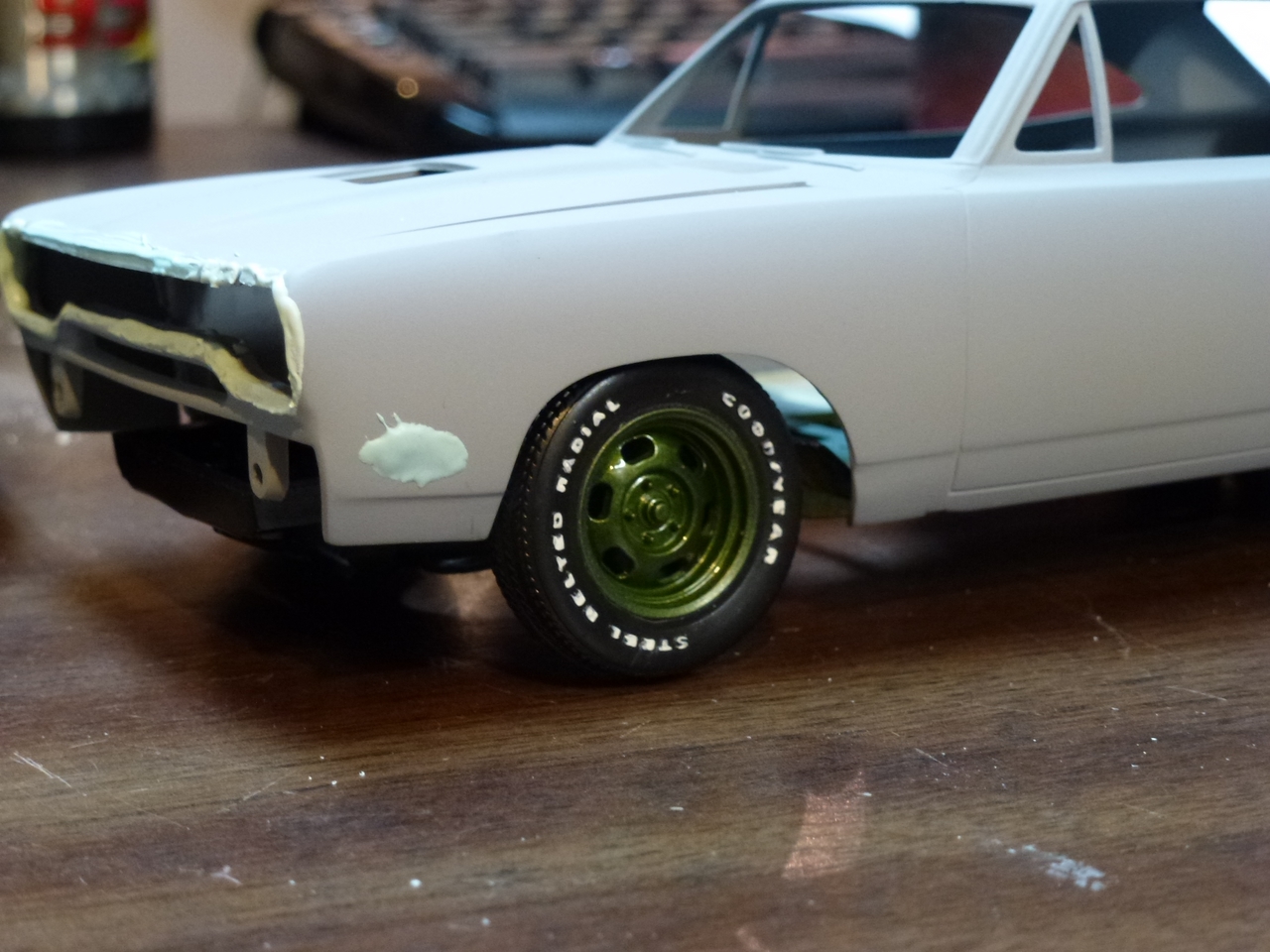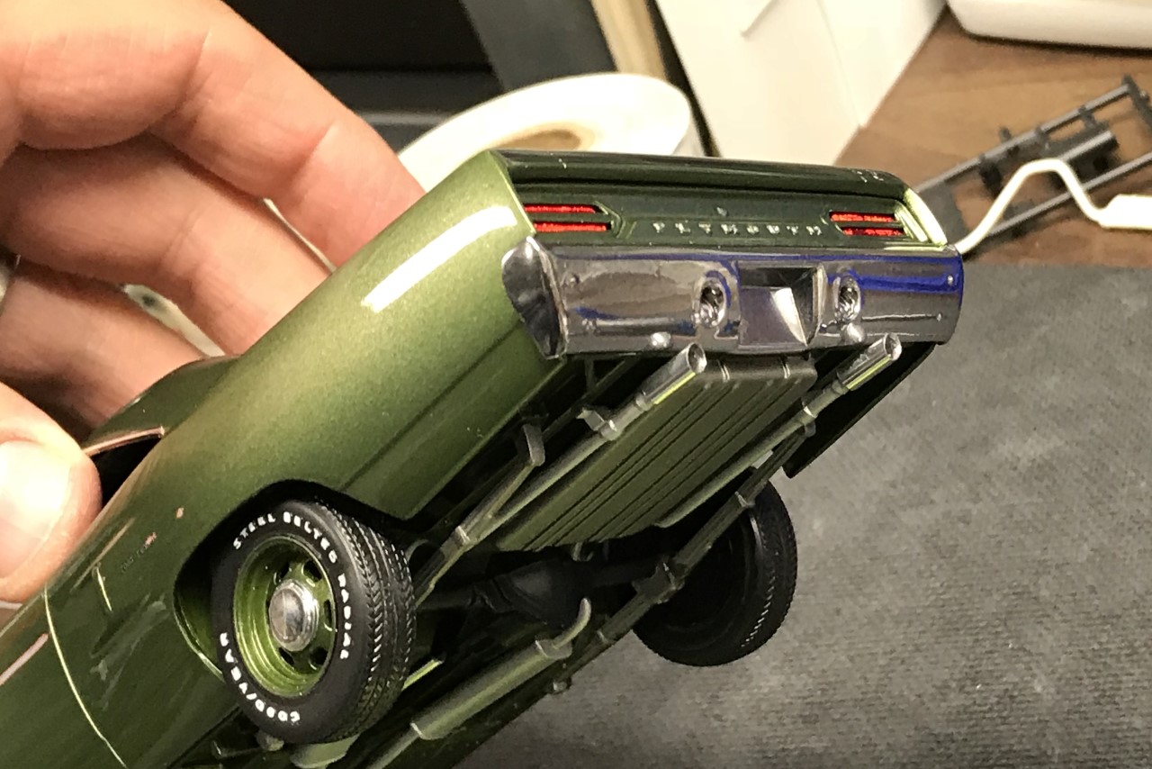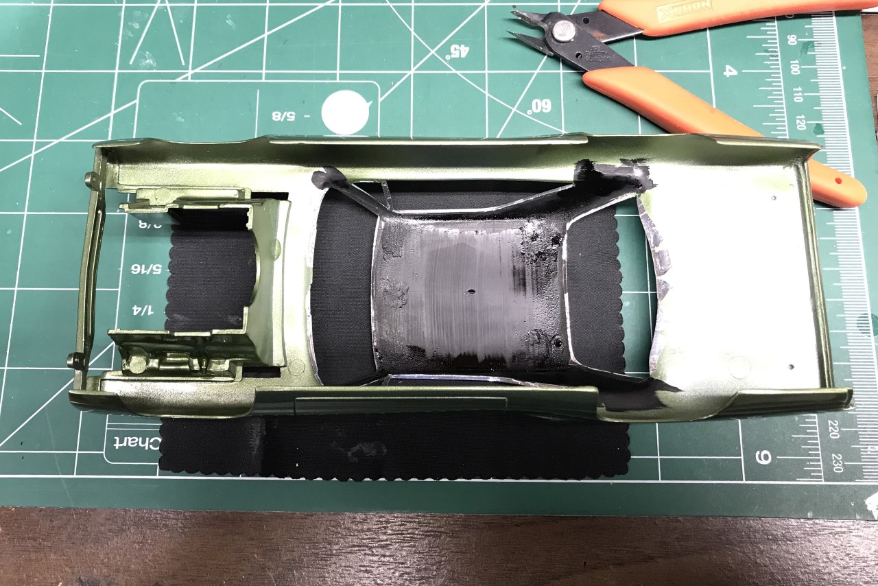While prepping the body, I decided to eliminate some of the chrome trim. I found 1:1 examples where the same had been done and on the same color! I thought it cleaned up the look of the car and set to work on the body. I ground off the trim around the grill opening, wheel wells and the back of the car. I also finished removing all of the GTX markings and smoothing out the shaved side markers and door handles.