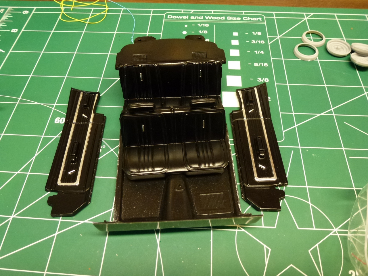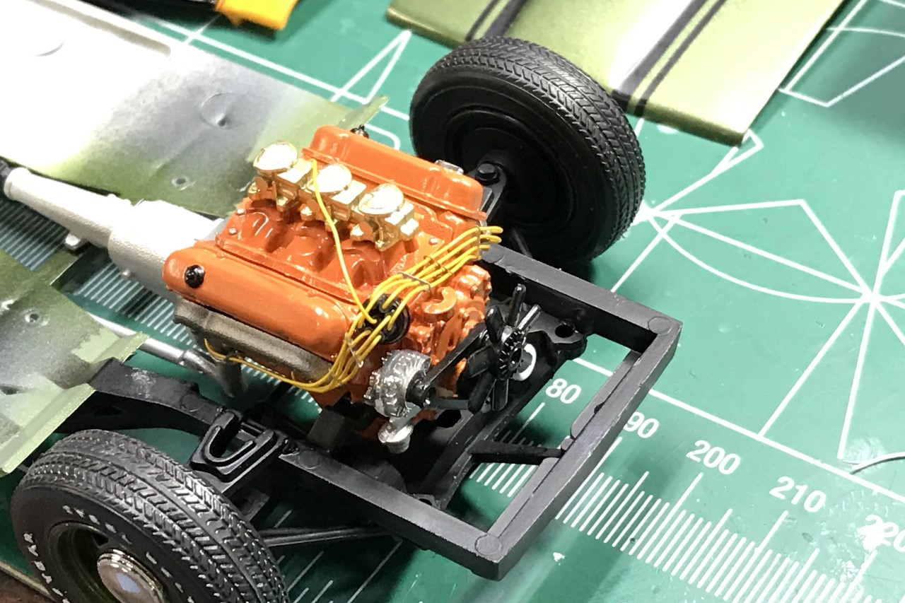 Finishing the detail, I used a Detail masters distributor kit to wire the engine. I used tiny magnets in the wheels to make the hub caps removable, bare metal foil for the exterior trim, I stripped the chrome bumpers and chromed them with Alclad and stripped the grill and did my best to recreate the correct colors of the 1:1 version. In the interior, I used embossing powder for carpet, bare metal foil for trim details, wood grain paint for the steering wheel and shifter, and dashboard details with a Molotow chrome pen. As a personal touch, I painted what is normally white seat trim, body color with clear semigloss.