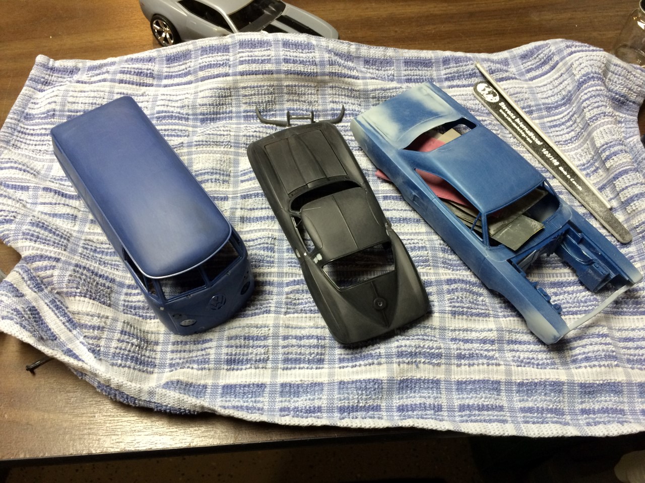Prior to painting the body, I finished painting the chassis and wheels. The paint was somewhat transparent and I struggled to spray it correctly. I managed to get good coverage on the chassis and wheels but by the time I was ready to paint the body, I was running low on paint and rushed through the spraying. The end result was paint that had pulled away from the edges of the doors, trunk, etc. I rushed into spraying clear coat and made it worse. I had a body that looked back and there was no way to correct the mistake without stripping…so that’s what I did.
