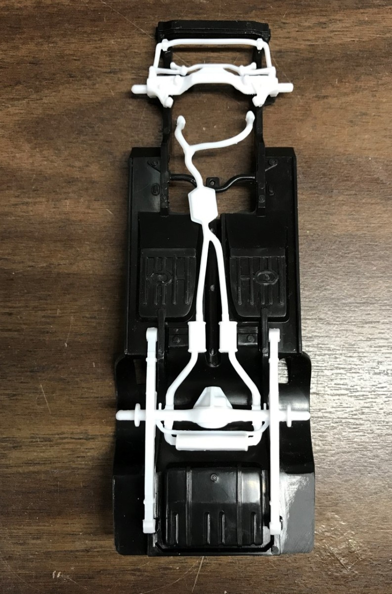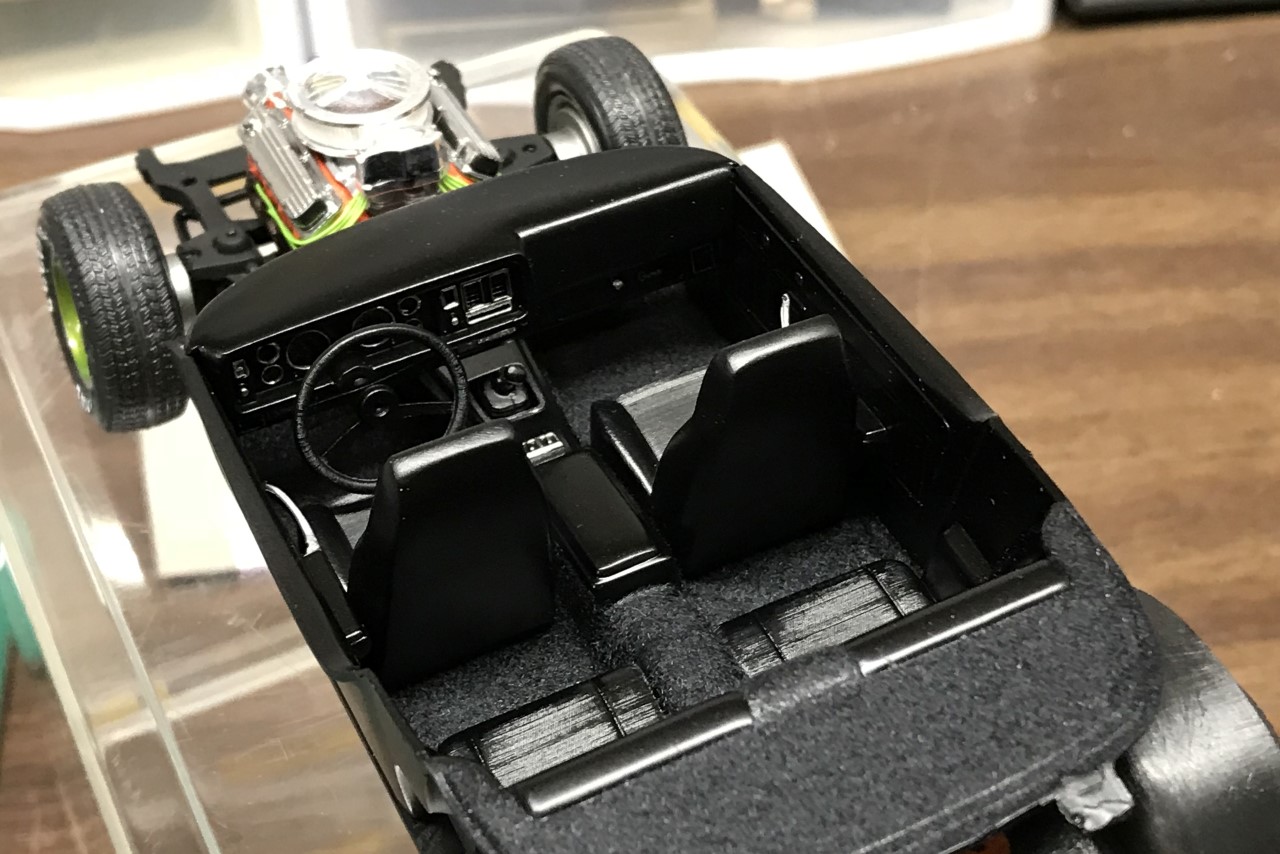 Once the interior was complete, I pulled everything together and glued the body to the chassis. I finished painting the tail lights and glued them in place along with the bumper.