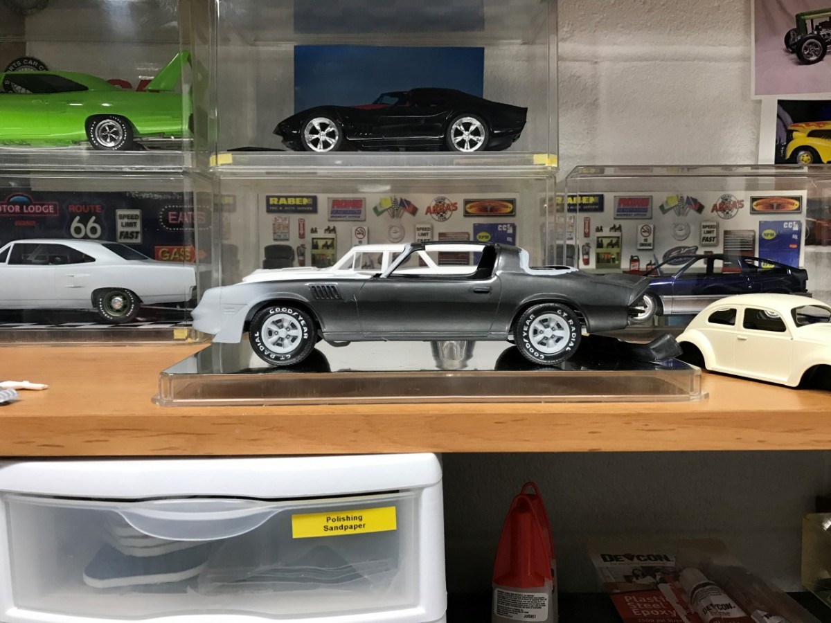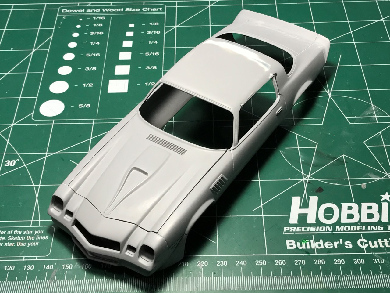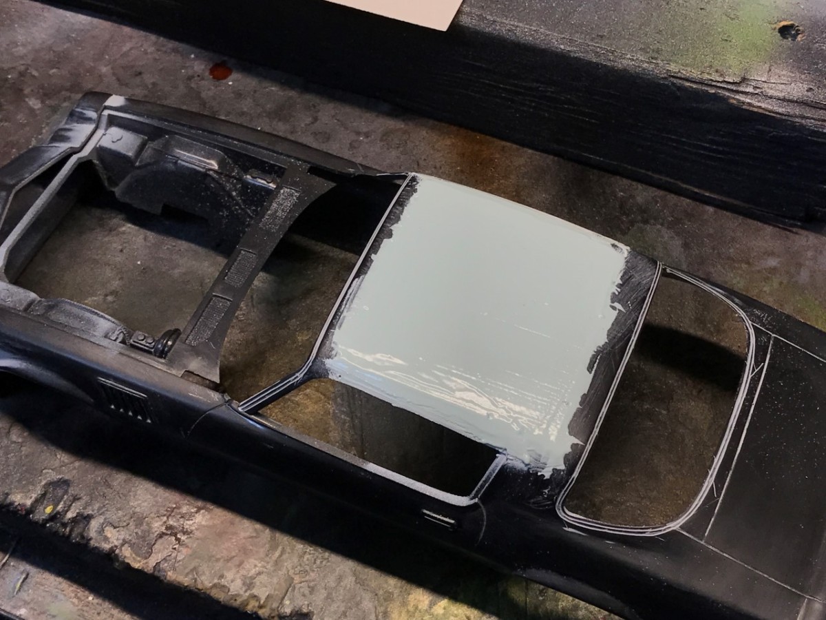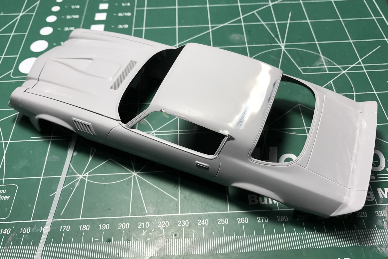 Once I received the new donor kit, I quickly glued the t-tops in place and started the process of filling and sanding to make the t-top disappear. Considering the fact that the roof is one continuous bubble shape, I was really impressed by how well the roof looks. When I applied the body filler, I pulled a note card over the wet filler to try and start the shaping process. I managed to accomplish the work after one application of filler!