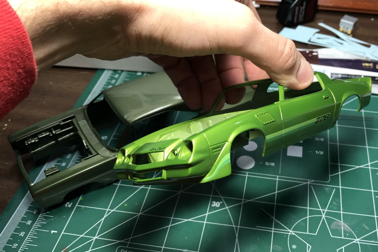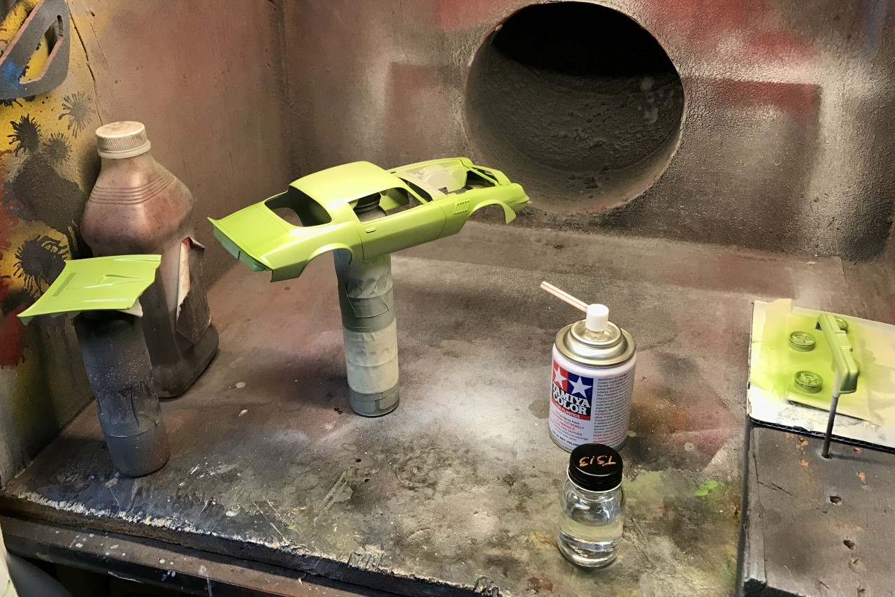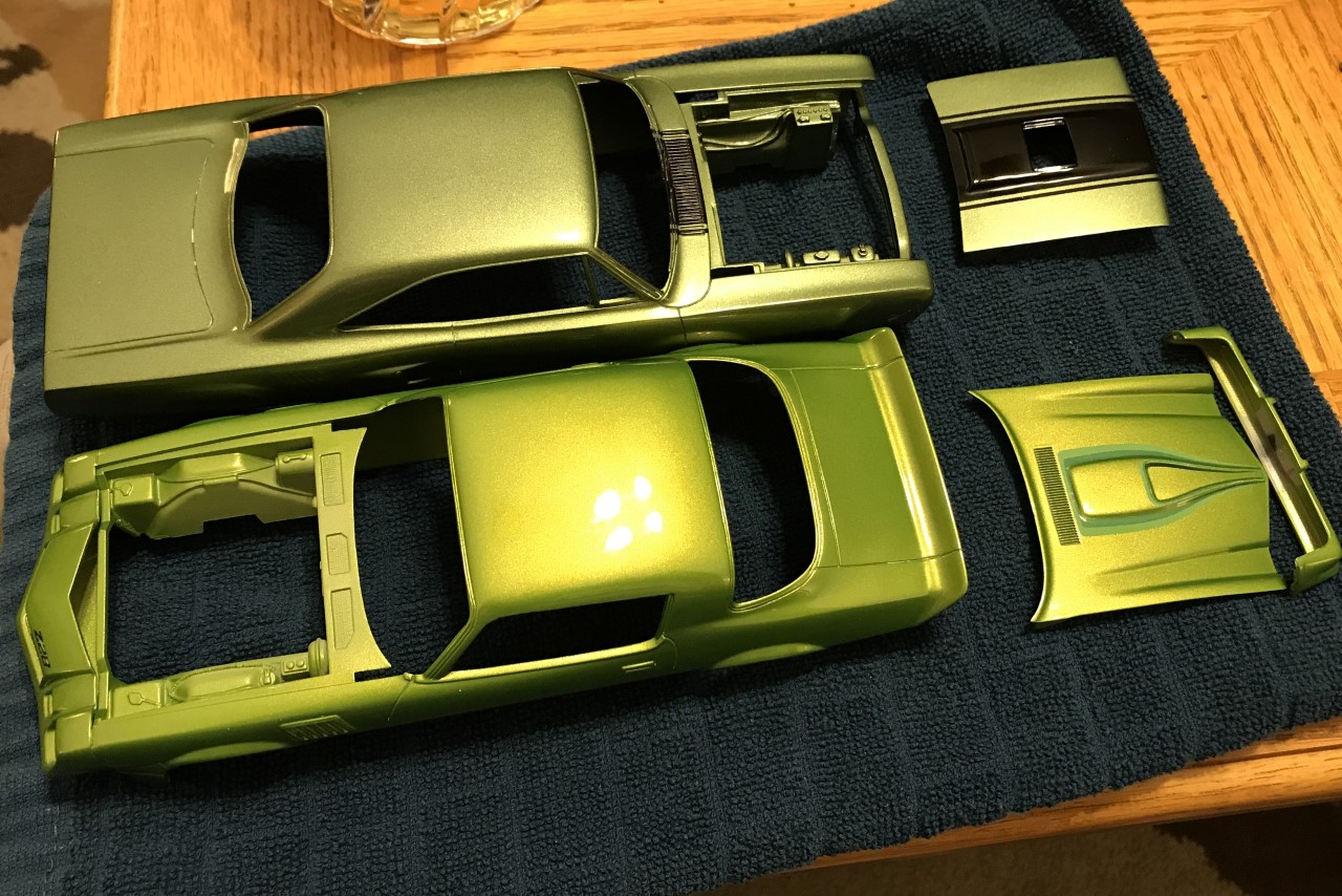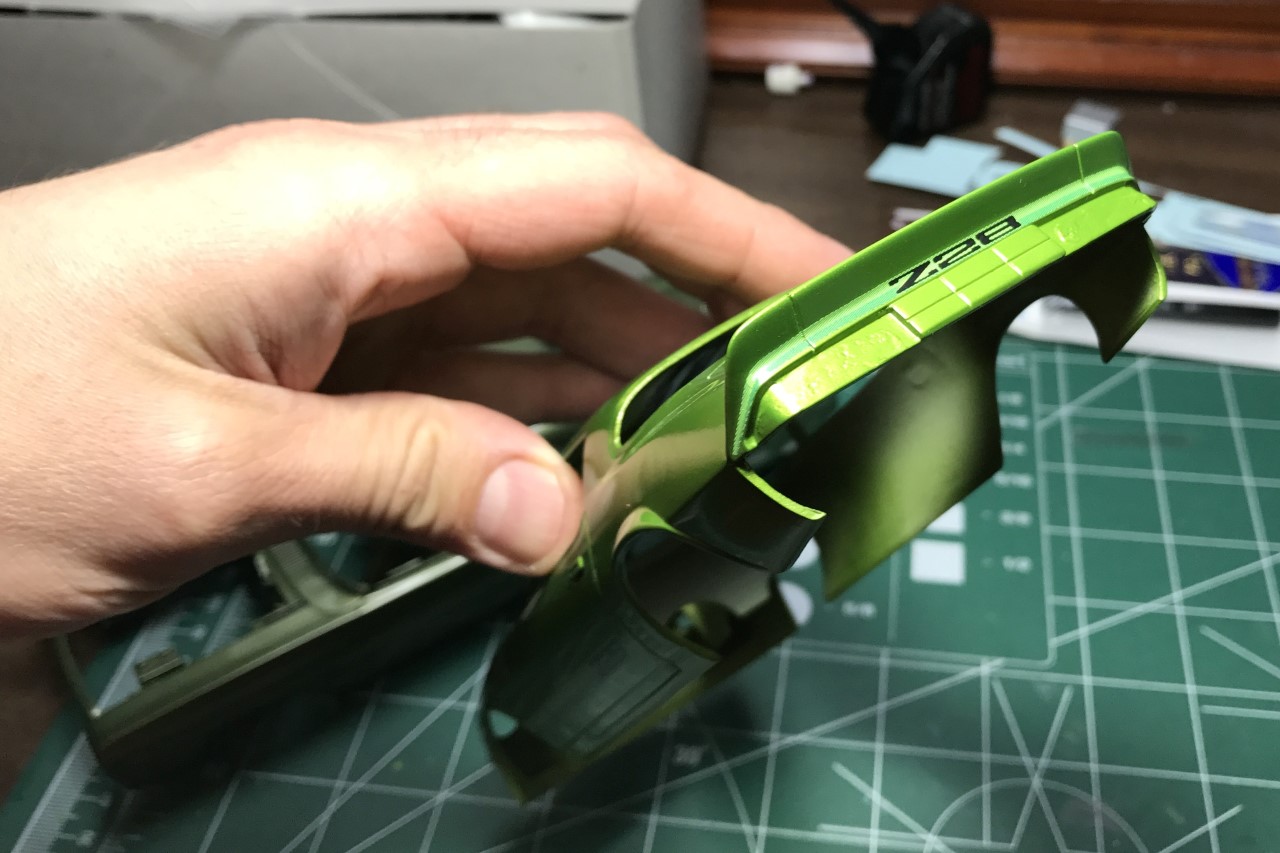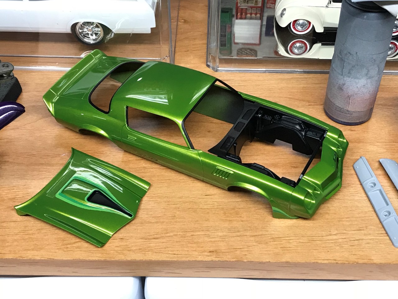 With the body work complete, I covered the entire body in primer, made minor corrections to the roof as well as the rest of the body and then sprayed the final layer of primer. I used Testors lime green pearl thinned with lacquer thinner. I sprayed two light dust coats, about 15 minutes apart, then sprayed two wet coats about 3 hours apart. The finish was very smooth and the color consistent!