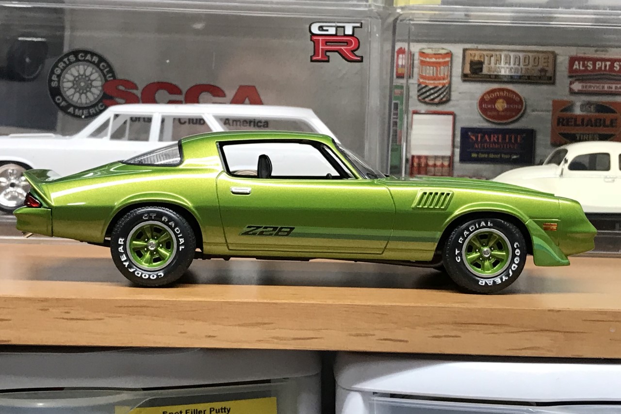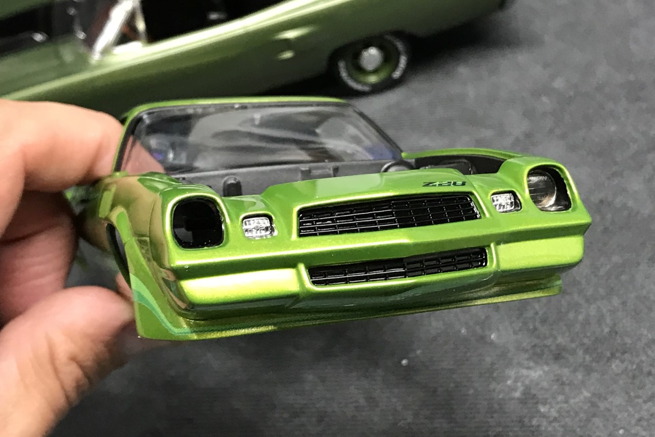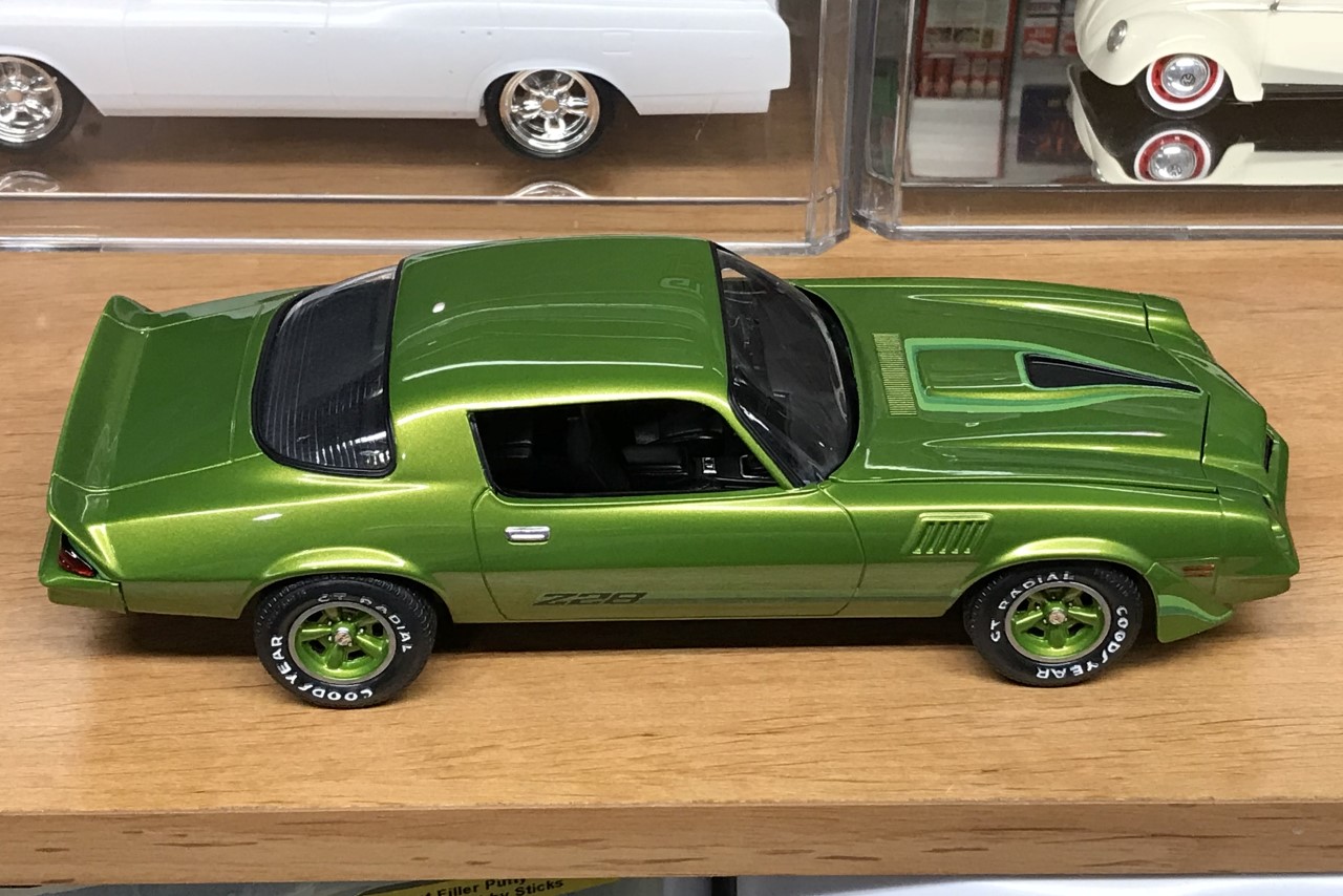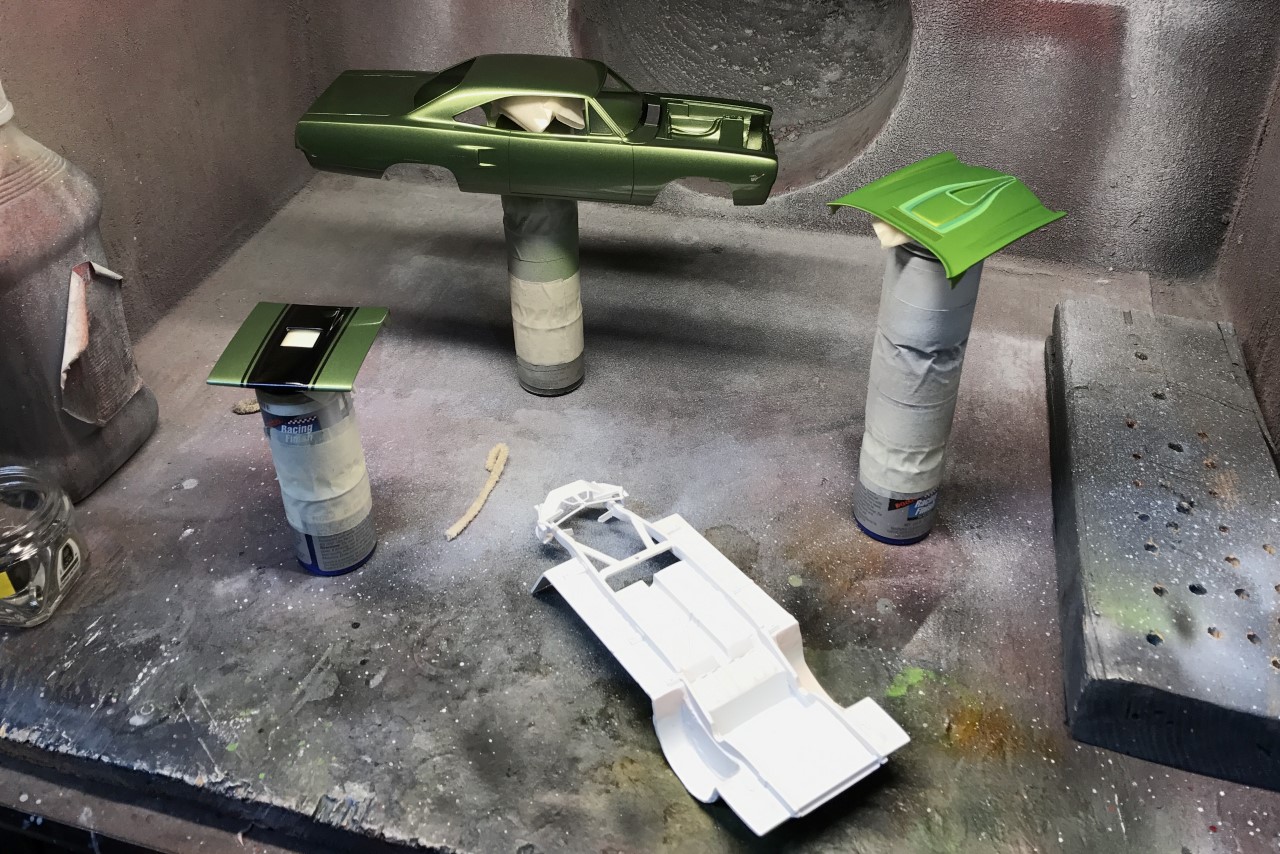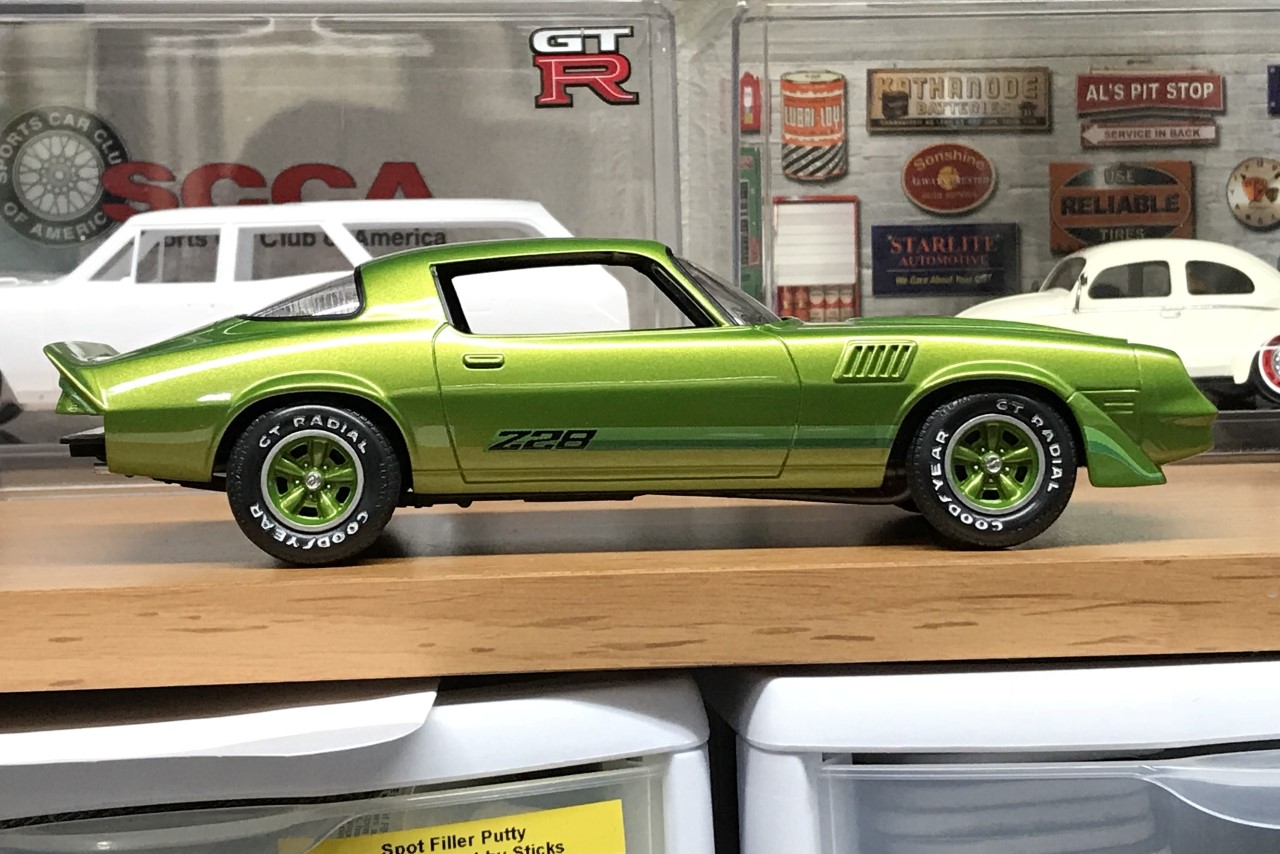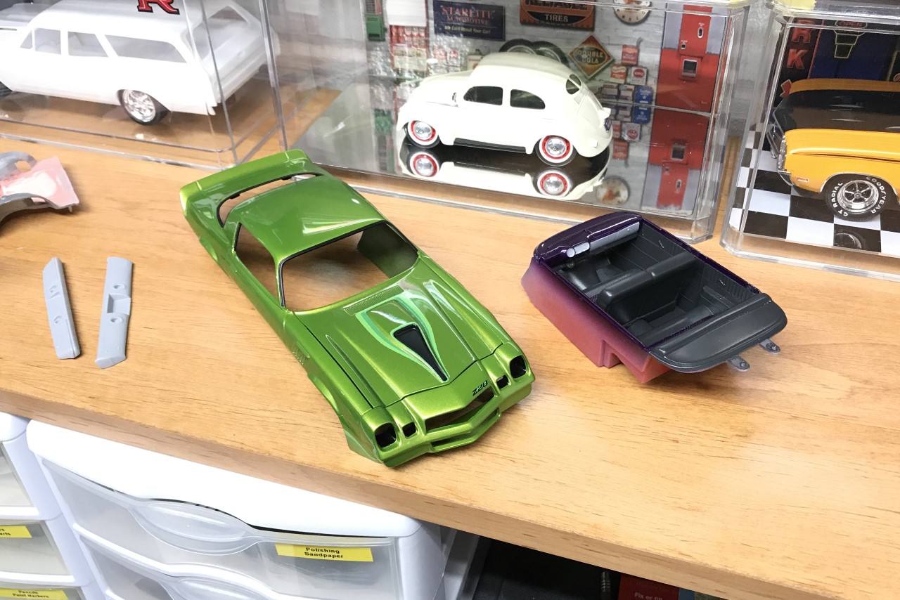 With the body work complete, I covered the entire body in primer, made minor corrections to the roof as well as the rest of the body and then sprayed the final layer of primer. I used Testors lime green pearl thinned with lacquer thinner. I sprayed two light dust coats, about 15 minutes apart, then sprayed two wet coats about 3 hours apart. The finish was very smooth and the color consistent!