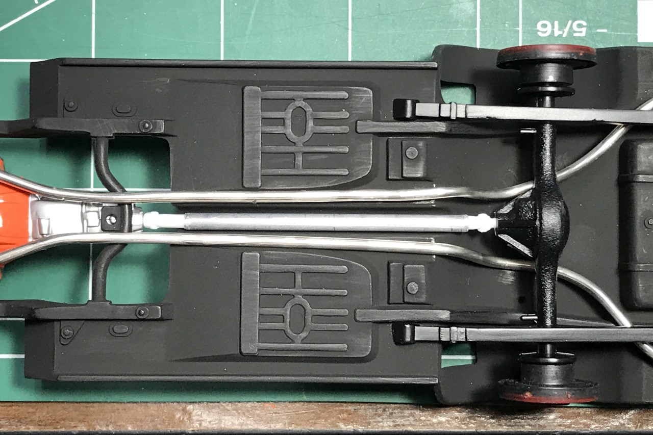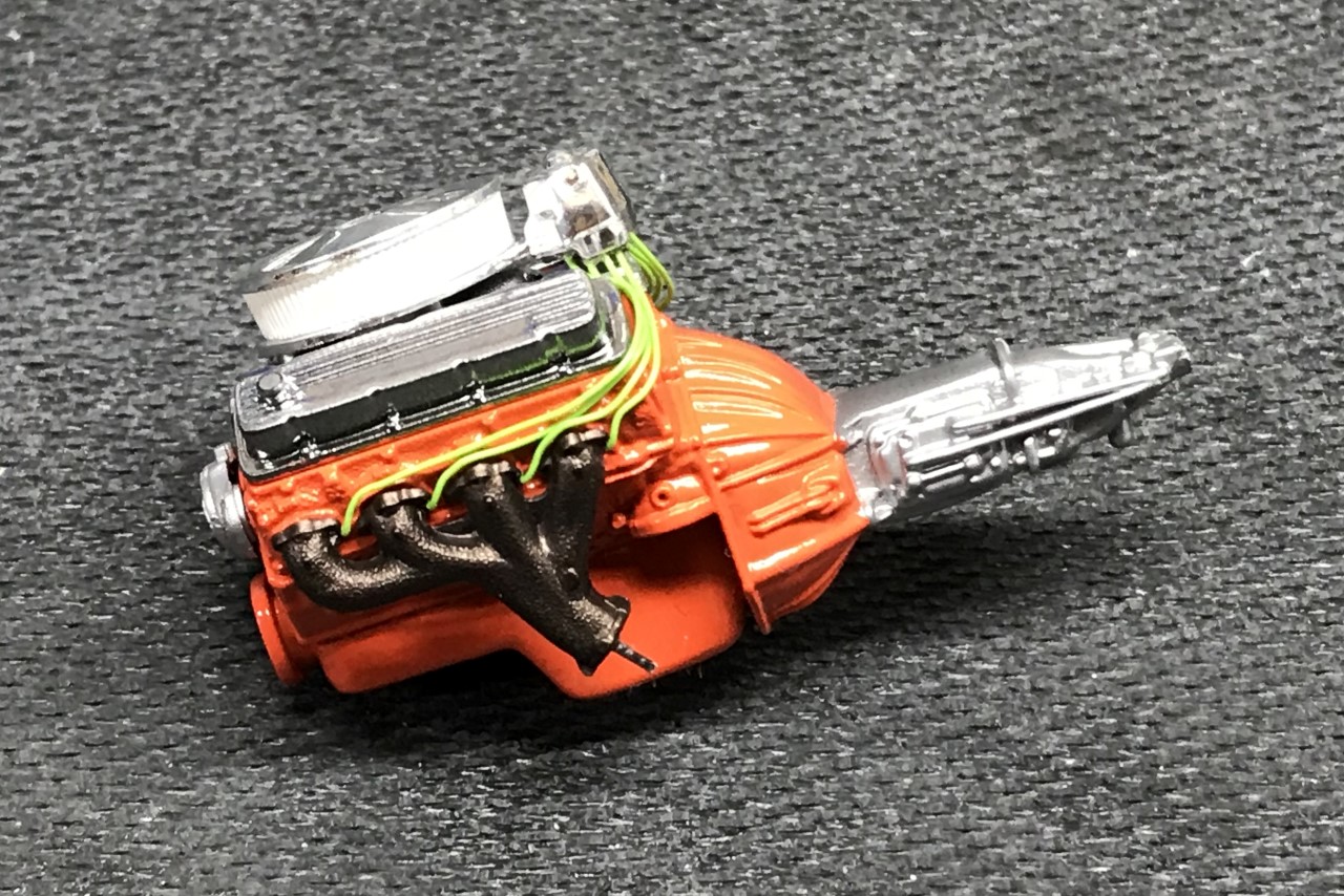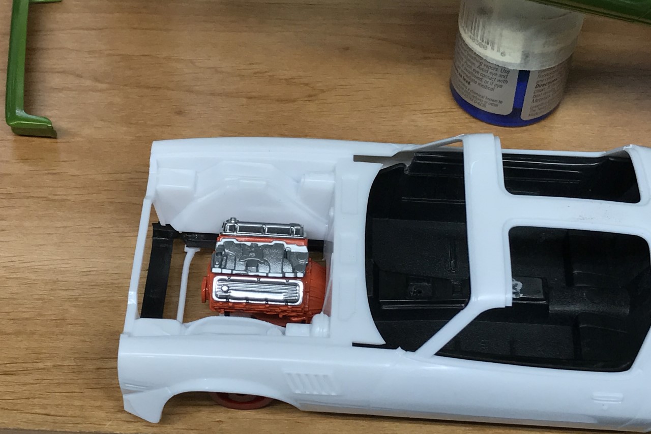 Once the body was sanded and polished, I worked on completing the rest of the kit. I sprayed the window trim, engine bay and head light pockets. Since I was adding a pre-emissions big block engine, the original emissions single exhaust had to be replaced! I used plumbers solder to create a new exhaust. I used aluminum tubing to finish the tips. I had to cut and reposition the engine mounts as well as extend the driveshaft which I accomplished with an aluminum tube. Once all of the parts were built, I painted them and glued them in place.