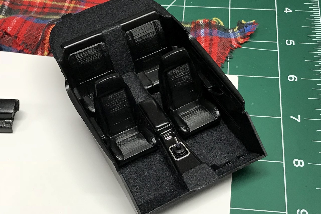 The interior was completed after smoothing out seams and lines. I added flocking to simulate carpet and used my Molotow chrome pen to pick out dashboard details.