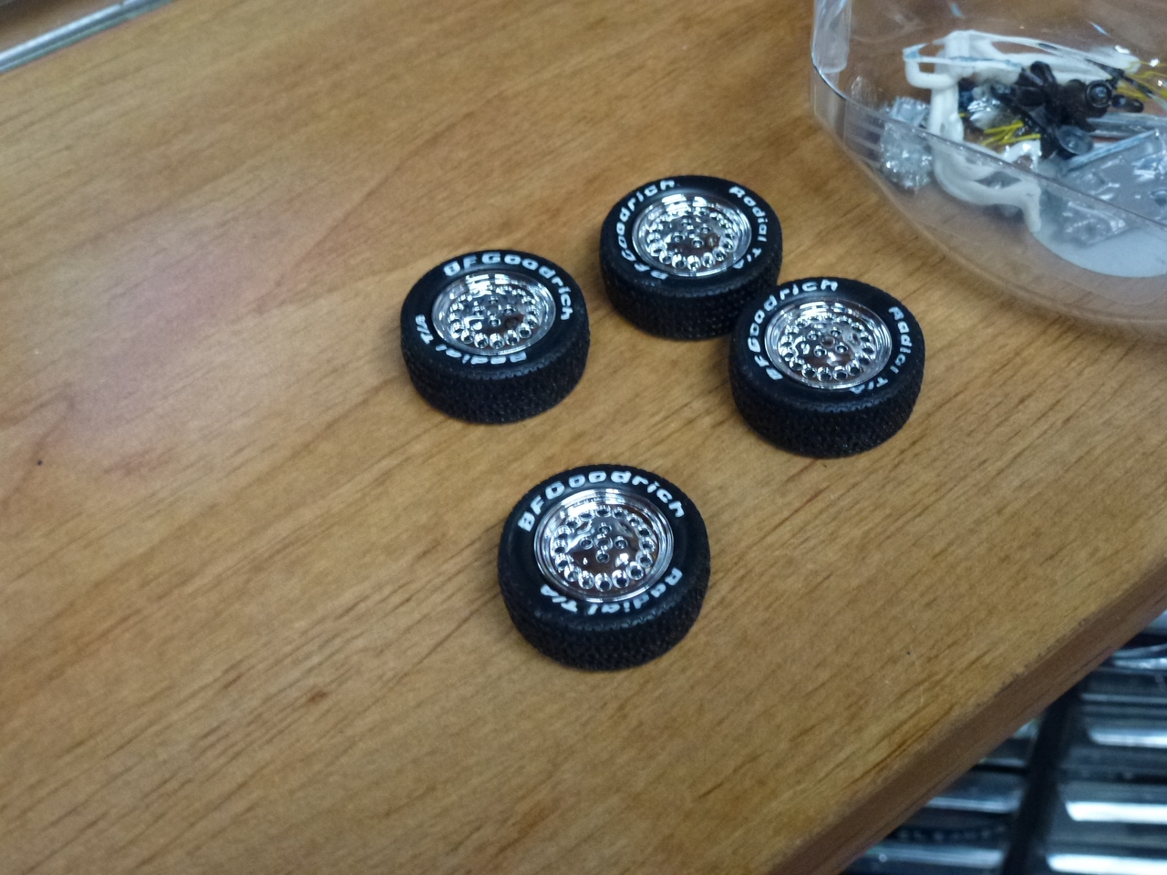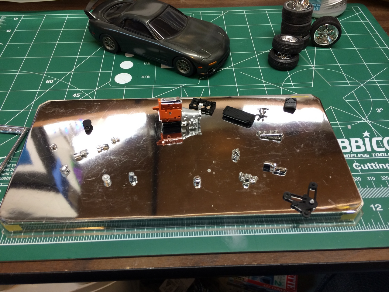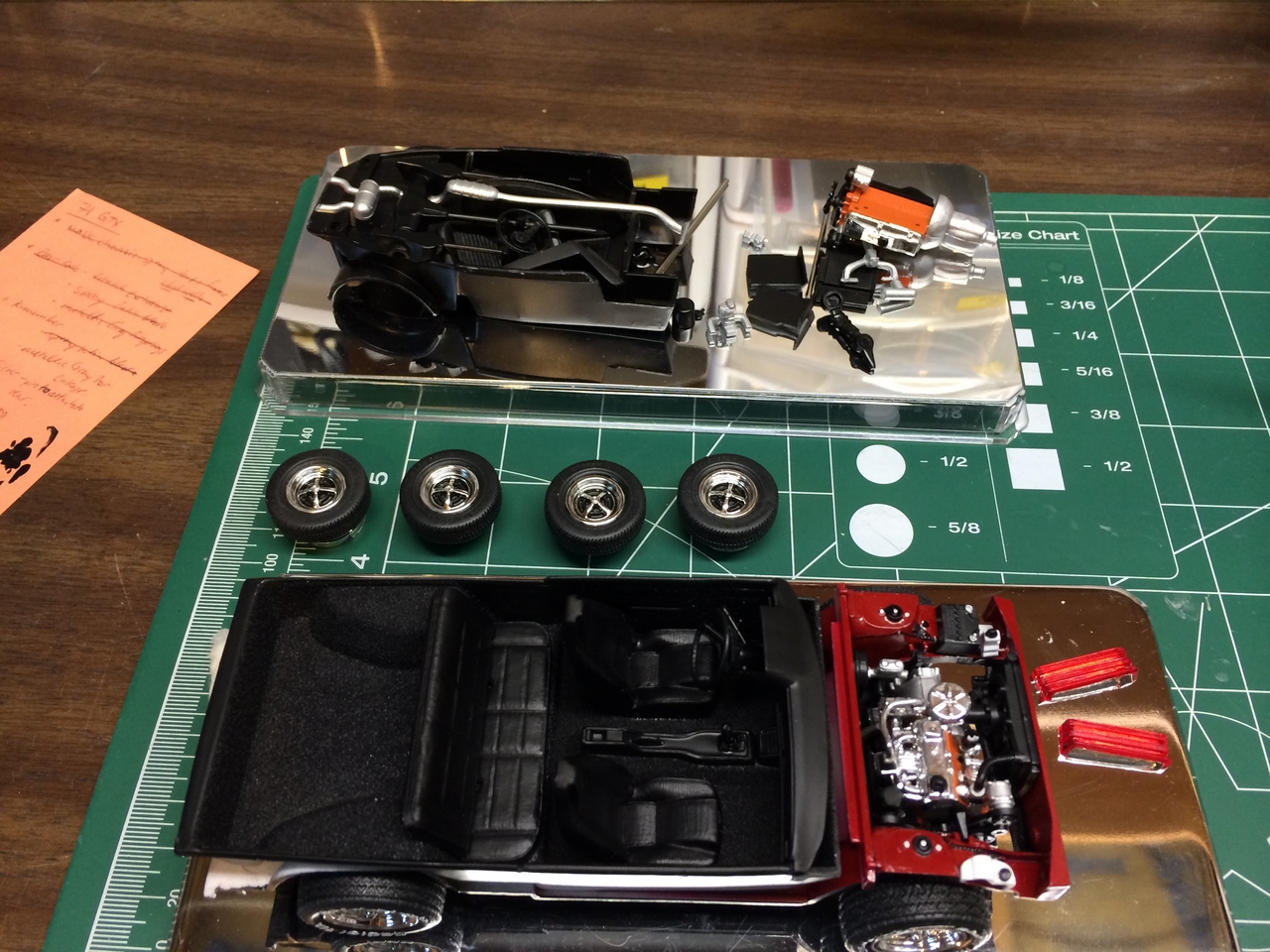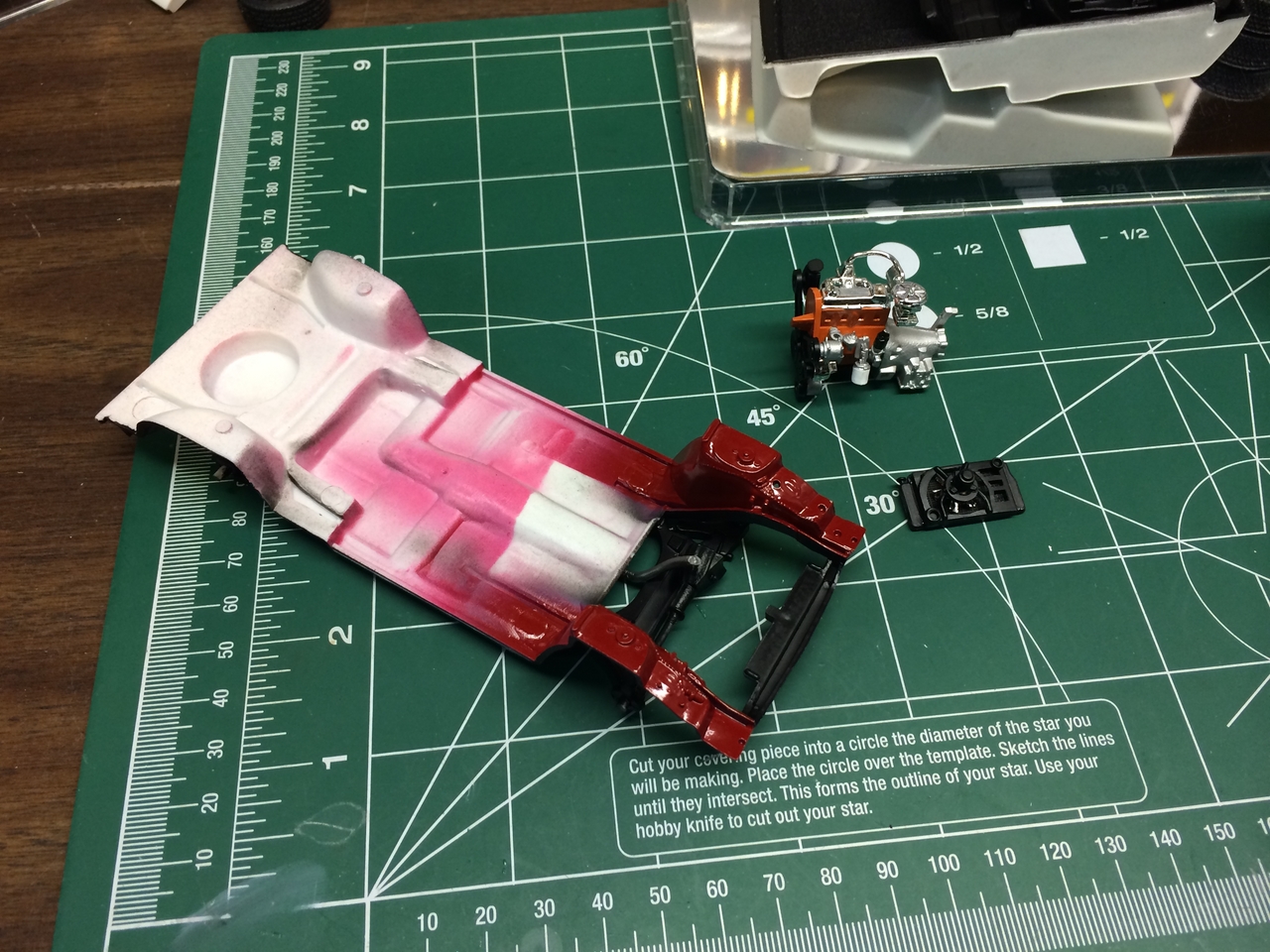 This kit contained an astonishing number of parts. Quite a bit more than I think it really needed in my opinion. I found that attaching all of the additional body parts prior to paint greatly simplified the final assembly. The suspension and chassis proved to be a rather large challenge. Unmodified, the wheels stuck out by over 1/8″. The front also rode rather high. I spent quite a bit of time grinding away the suspension to try and make everything fit. In the end, I hacked quite a bit of the rear suspension and used wire to recreate the mounting pins. Up front, I had to hack the mounting pins, mill the back of the wheel and move them into position and held them in place with superglue. The end result turned out very well.