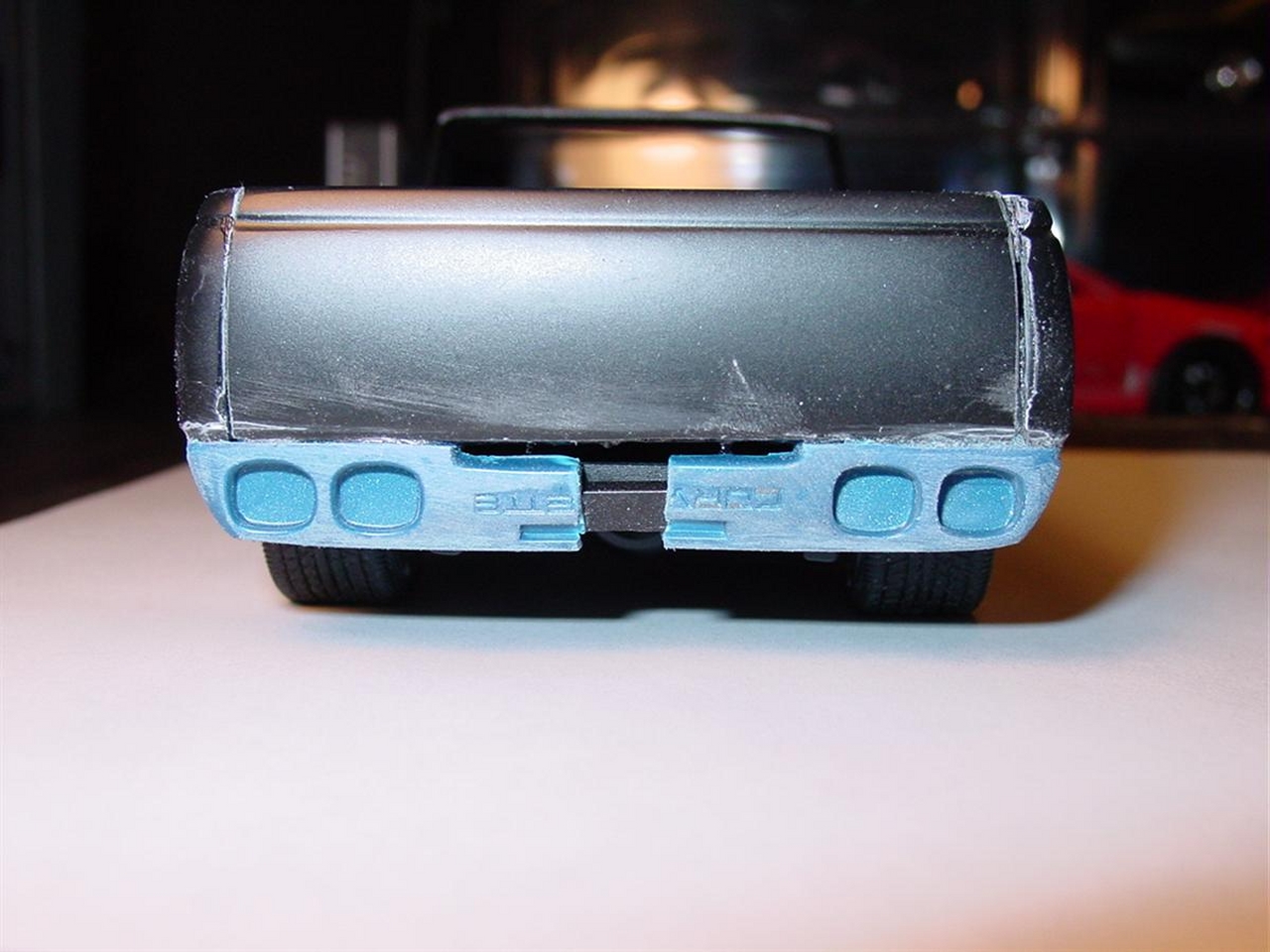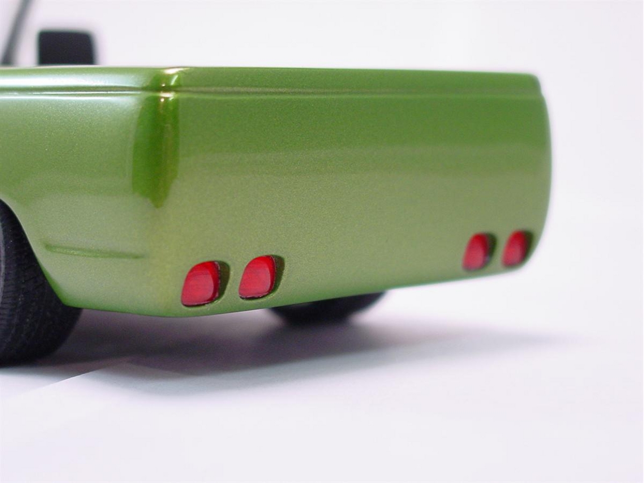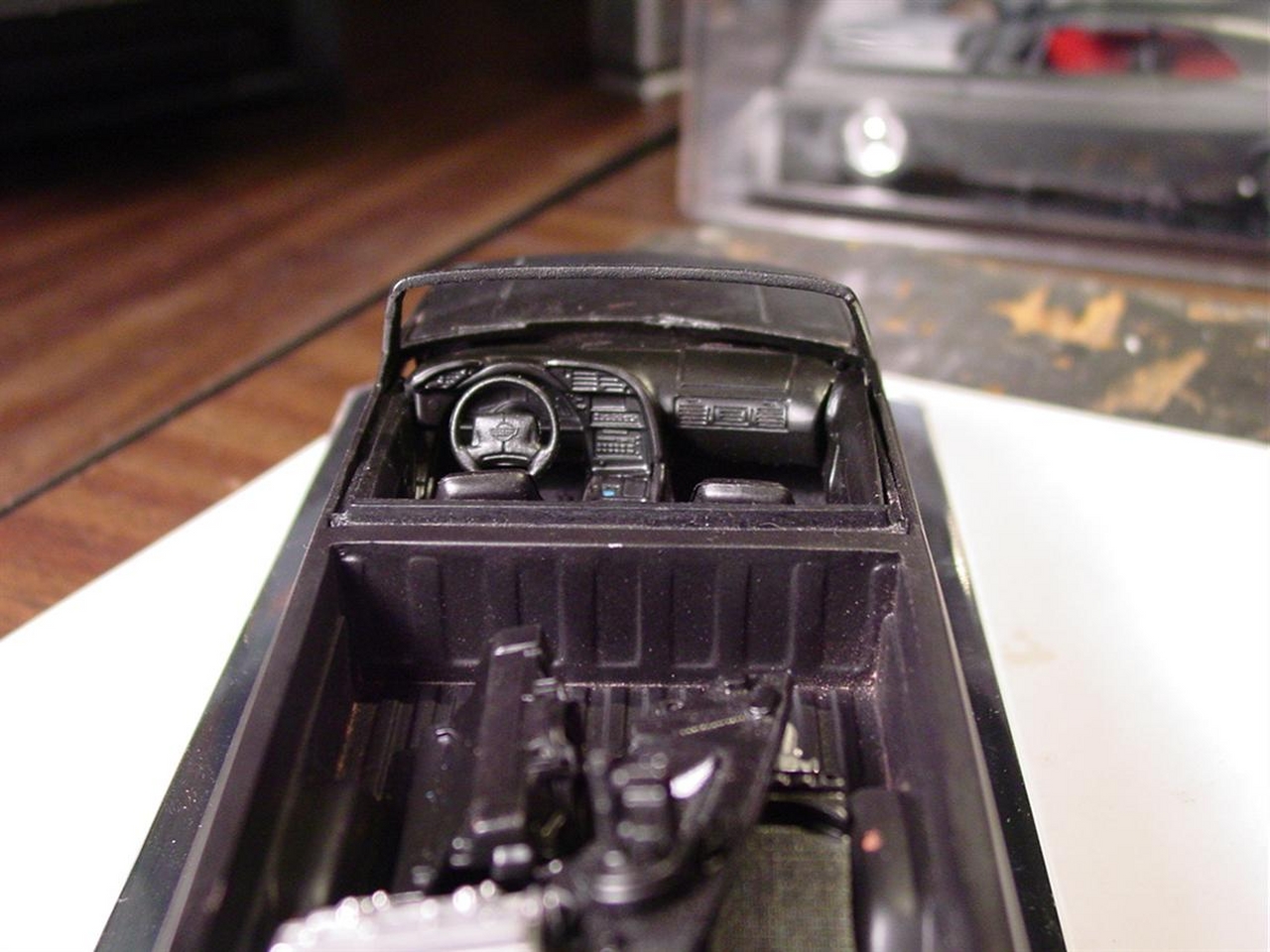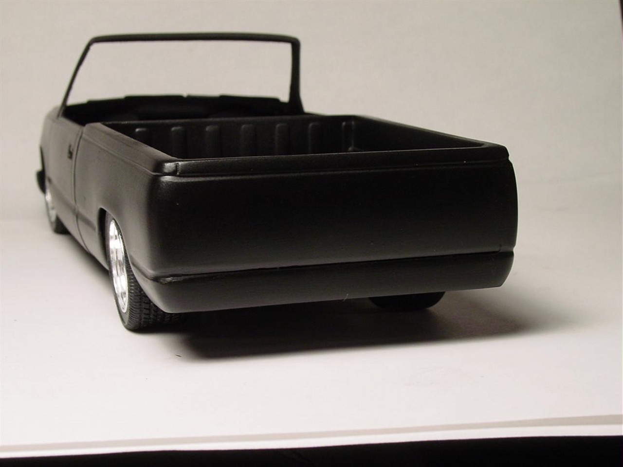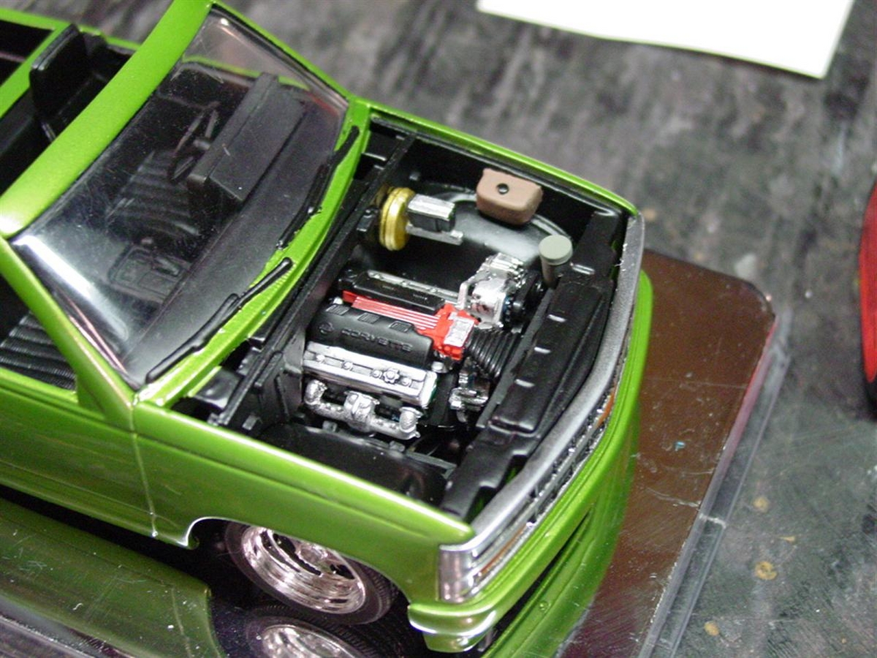 This was a labor of frustration! This kit weighs a lot! There is an incredible amount of body filler in this kit. I blended the cab into the bed. I blended the tail gate into the bed. I built up the area around the interior to make it look right. I later added corvette tail lights. They were sourced from a ’96 vette kit that I wasn’t going to build. I also used chezoom wheels, along with ’73 trans am front and rear suspension. I grafted in a transmission tunnel from a ’94 trans am kit. I used the engine from the Corvette kit. I also smoothed out quite a bit of the dash to give it a clean look.