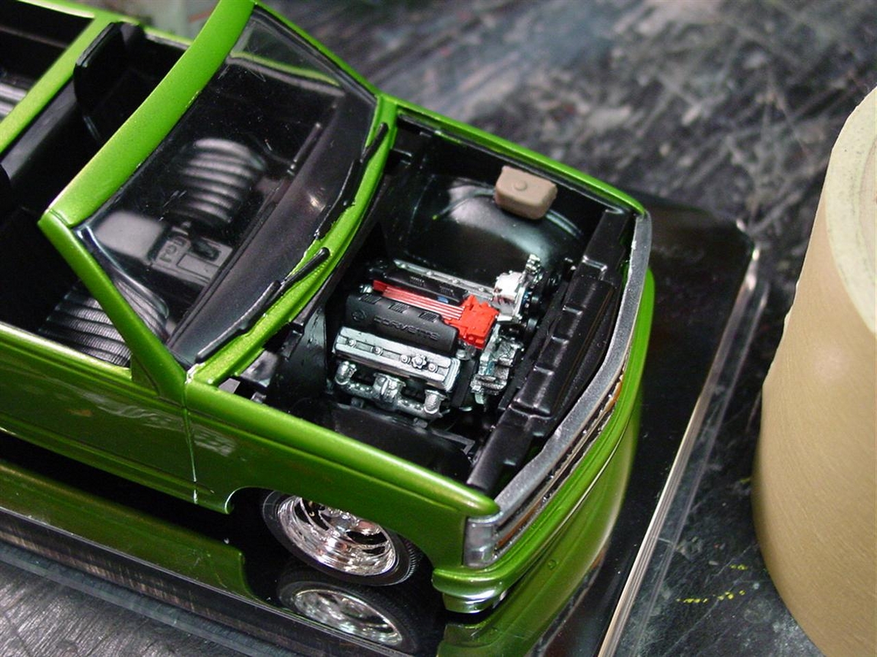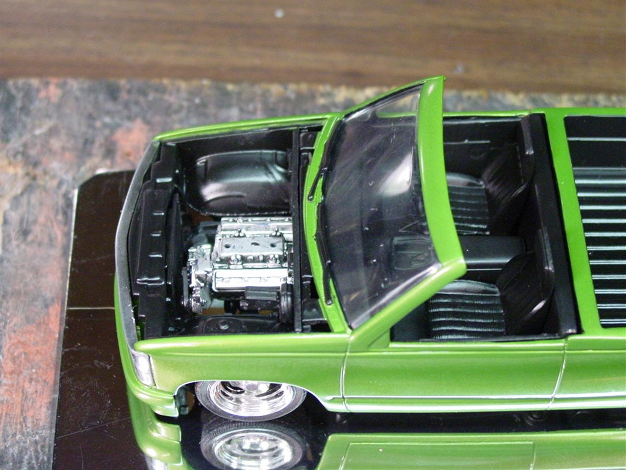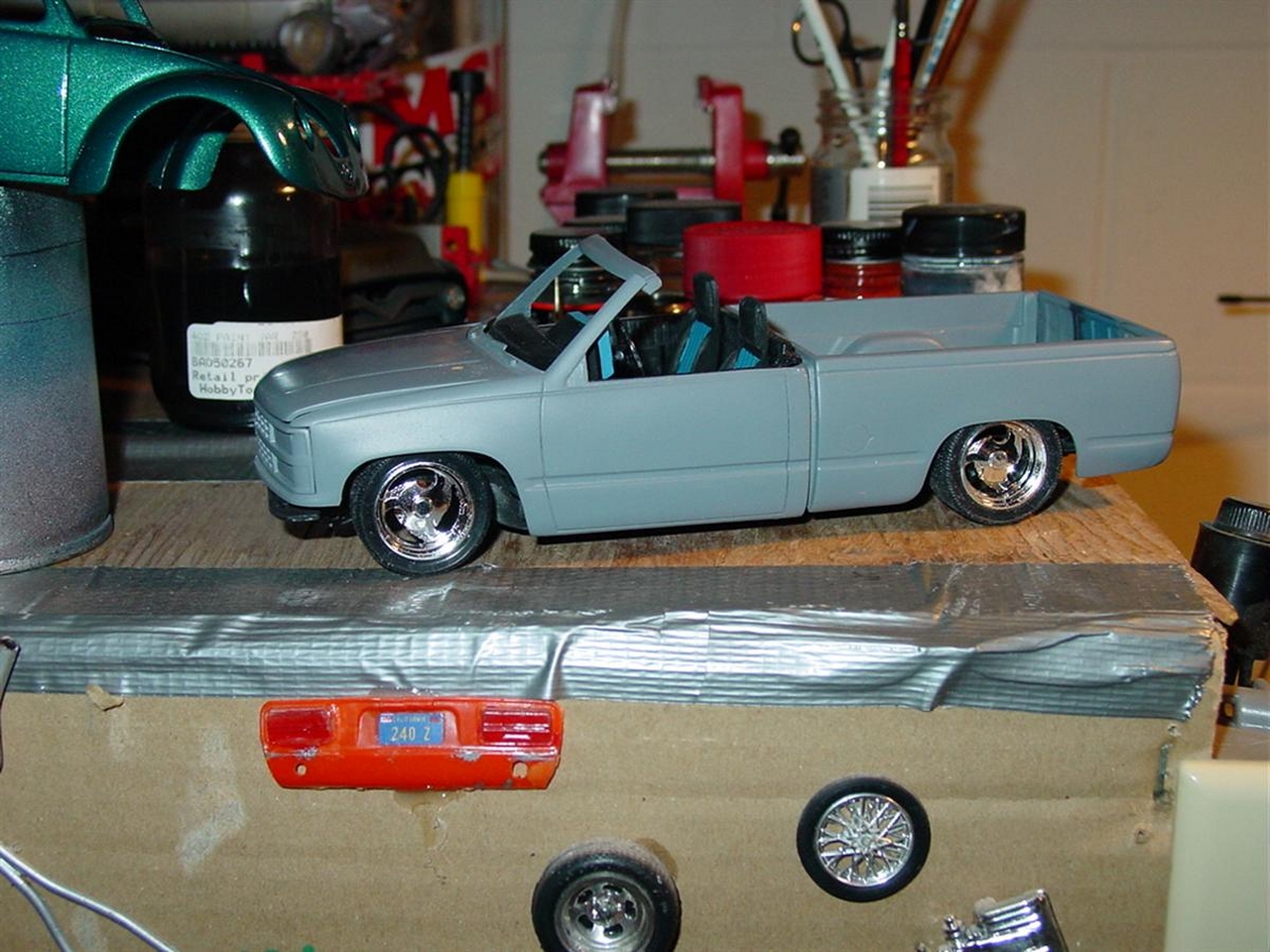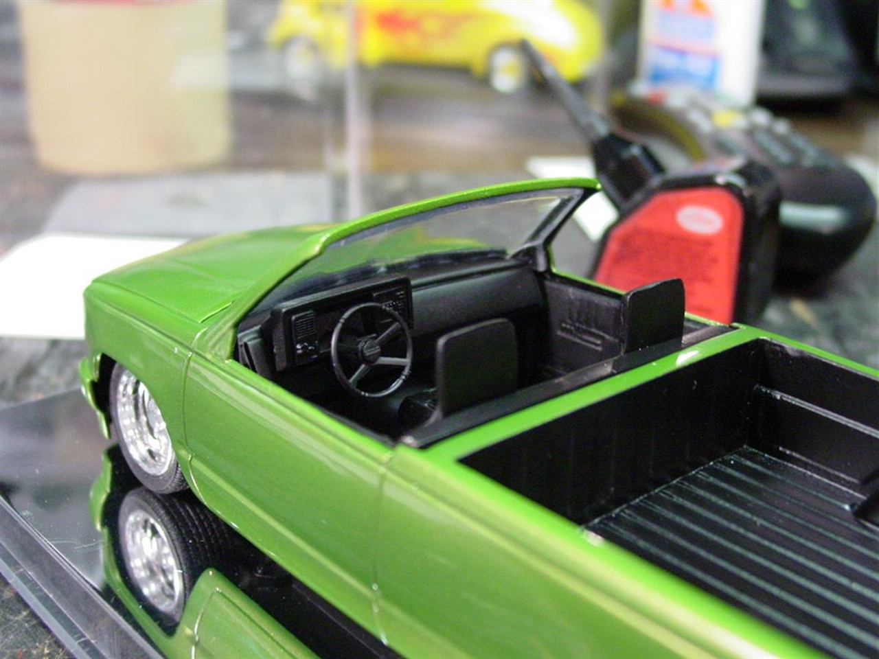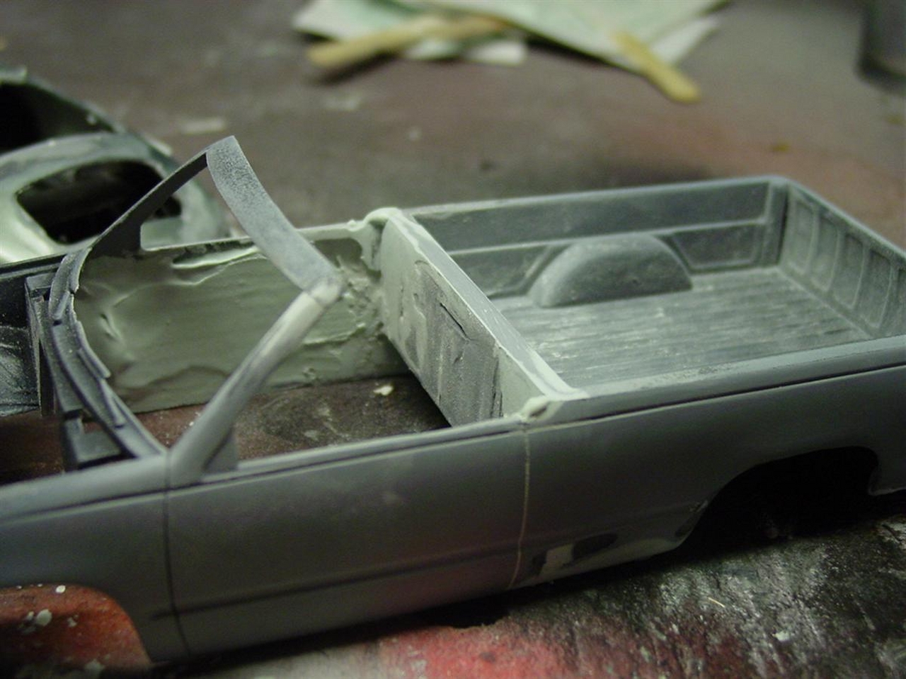 This was a labor of frustration! This kit weighs a lot! There is an incredible amount of body filler in this kit. I blended the cab into the bed. I blended the tail gate into the bed. I built up the area around the interior to make it look right. I later added corvette tail lights. They were sourced from a ’96 vette kit that I wasn’t going to build. I also used chezoom wheels, along with ’73 trans am front and rear suspension. I grafted in a transmission tunnel from a ’94 trans am kit. I used the engine from the Corvette kit. I also smoothed out quite a bit of the dash to give it a clean look.