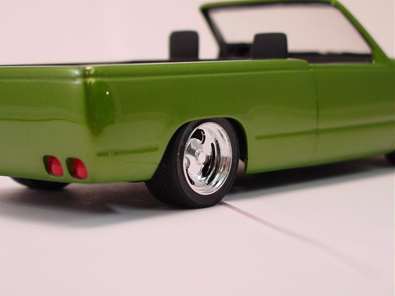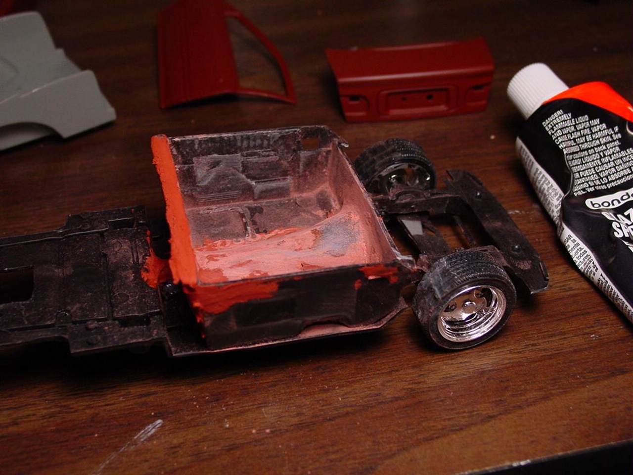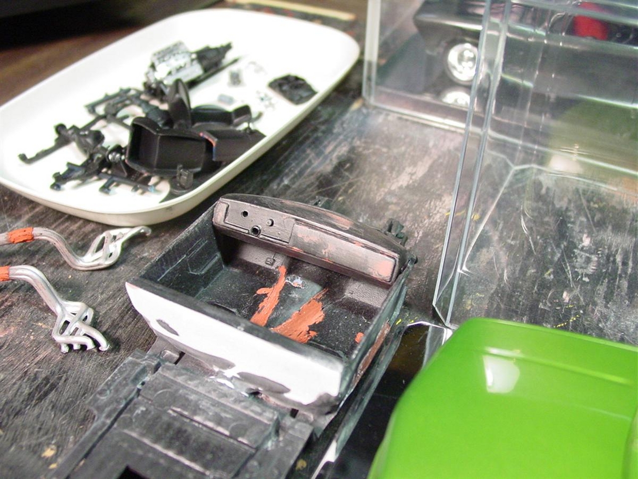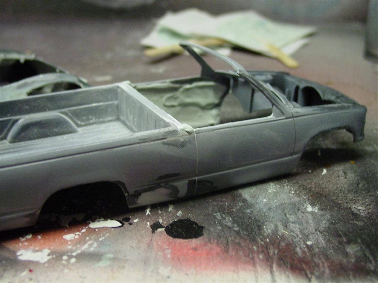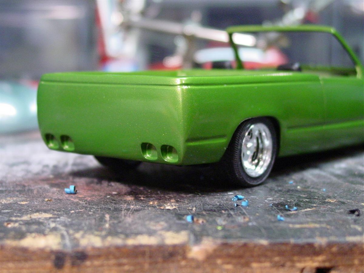 This was a labor of frustration! This kit weighs a lot! There is an incredible amount of body filler in this kit. I blended the cab into the bed. I blended the tail gate into the bed. I built up the area around the interior to make it look right. I later added corvette tail lights. They were sourced from a ’96 vette kit that I wasn’t going to build. I also used chezoom wheels, along with ’73 trans am front and rear suspension. I grafted in a transmission tunnel from a ’94 trans am kit. I used the engine from the Corvette kit. I also smoothed out quite a bit of the dash to give it a clean look.