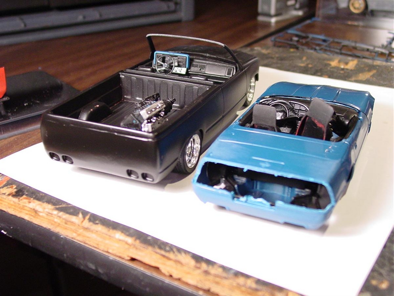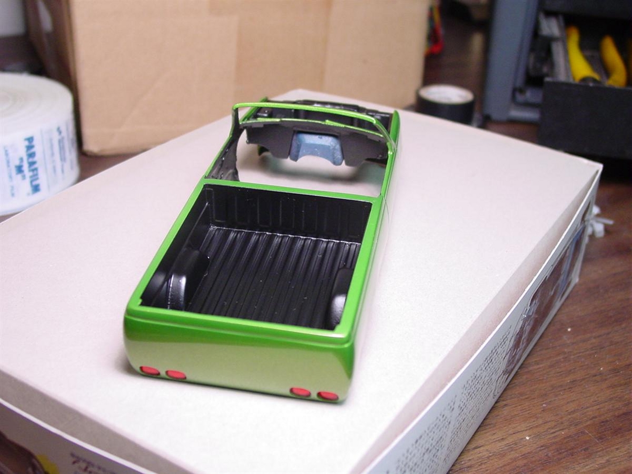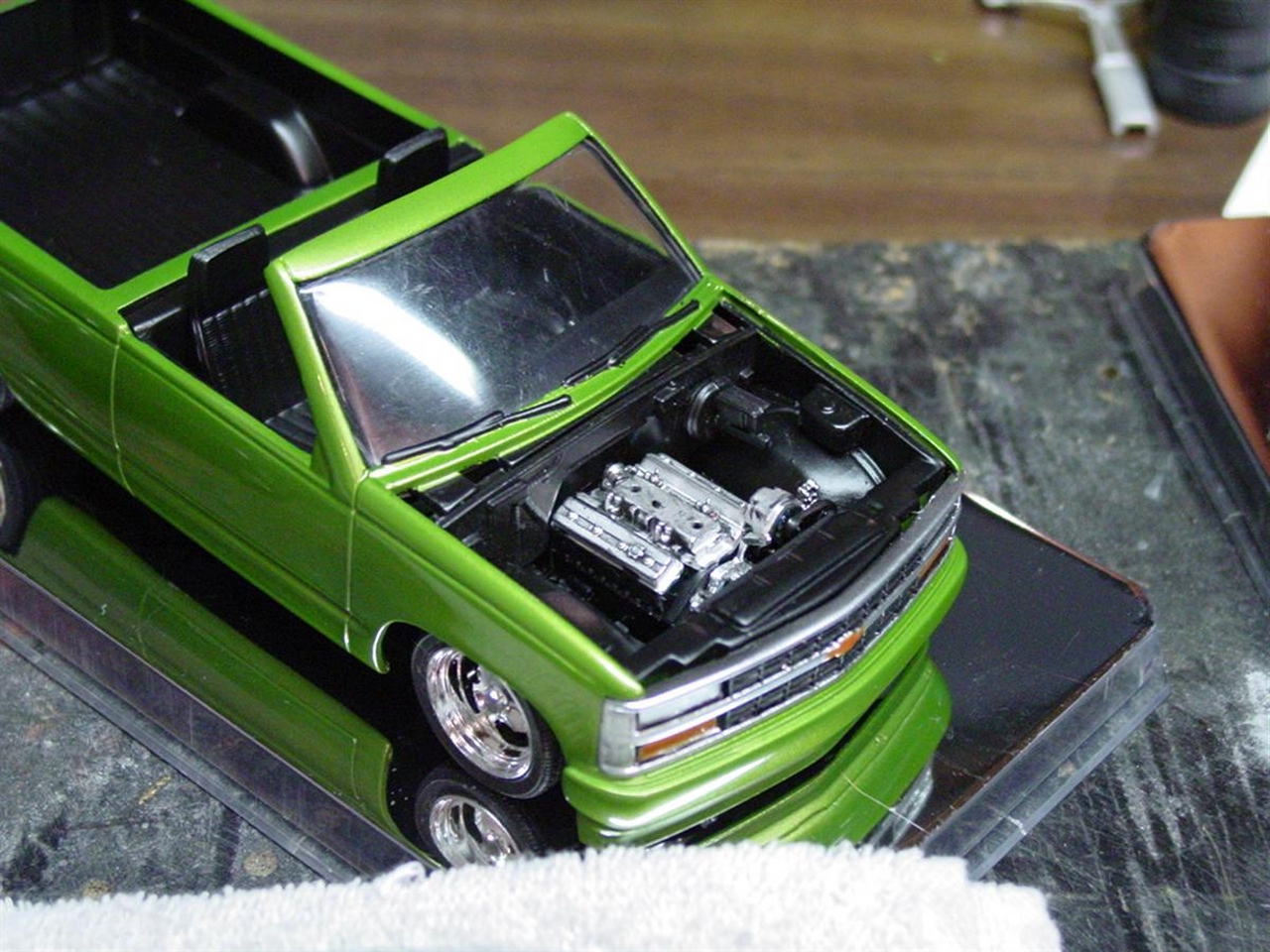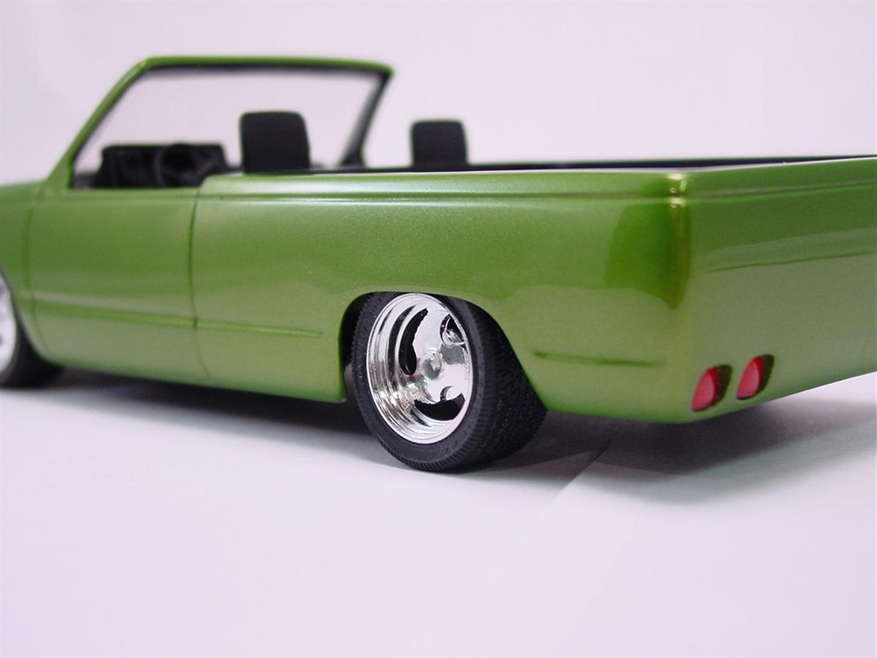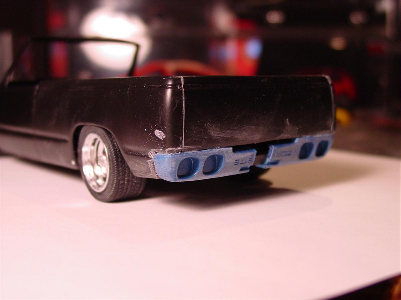This was a labor of frustration! This kit weighs a lot! There is an incredible amount of body filler in this kit. I blended the cab into the bed. I blended the tail gate into the bed. I built up the area around the interior to make it look right. I later added corvette tail lights. They were sourced from a ’96 vette kit that I wasn’t going to build. I also used chezoom wheels, along with ’73 trans am front and rear suspension. I grafted in a transmission tunnel from a ’94 trans am kit. I used the engine from the Corvette kit. I also smoothed out quite a bit of the dash to give it a clean look.
