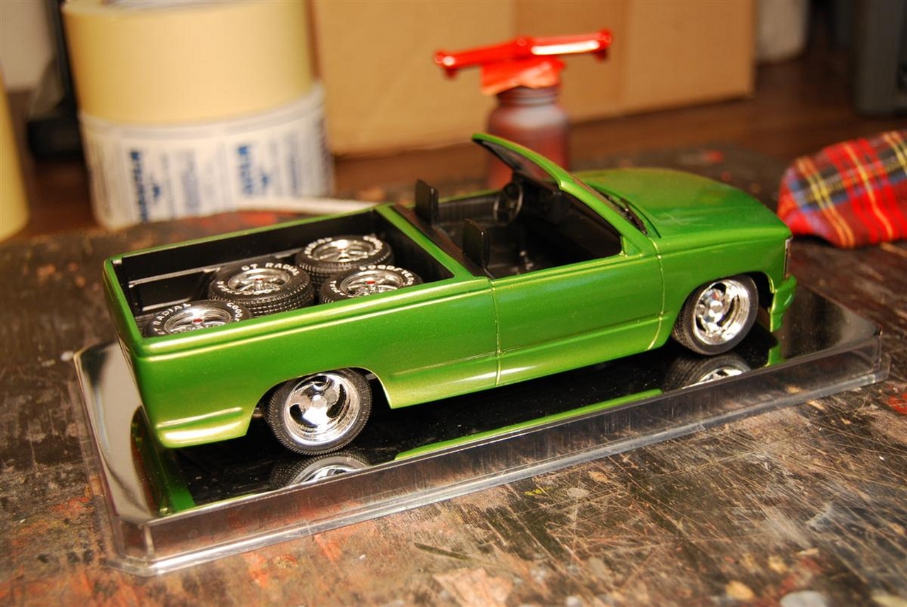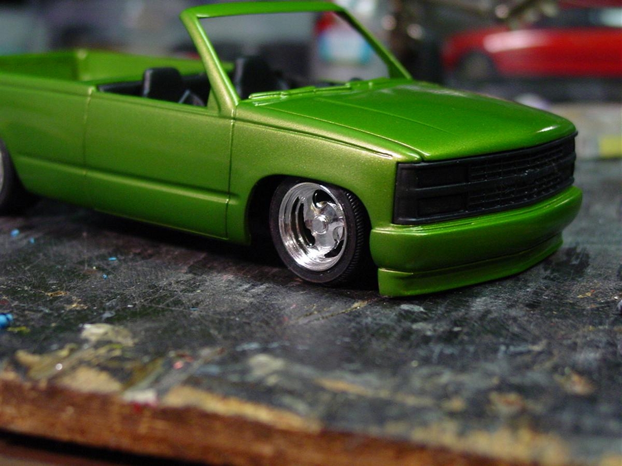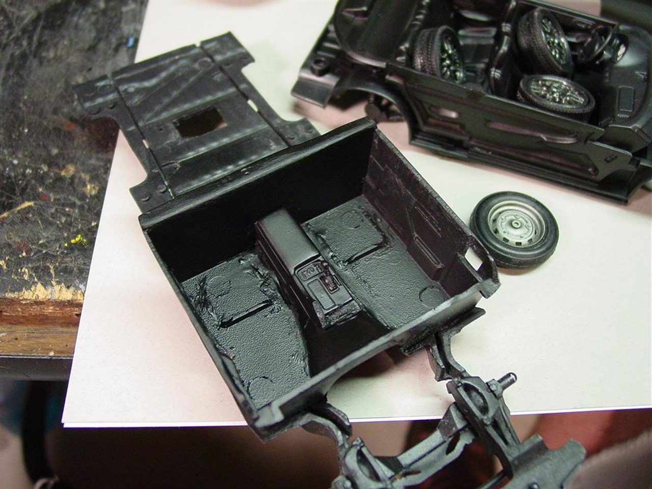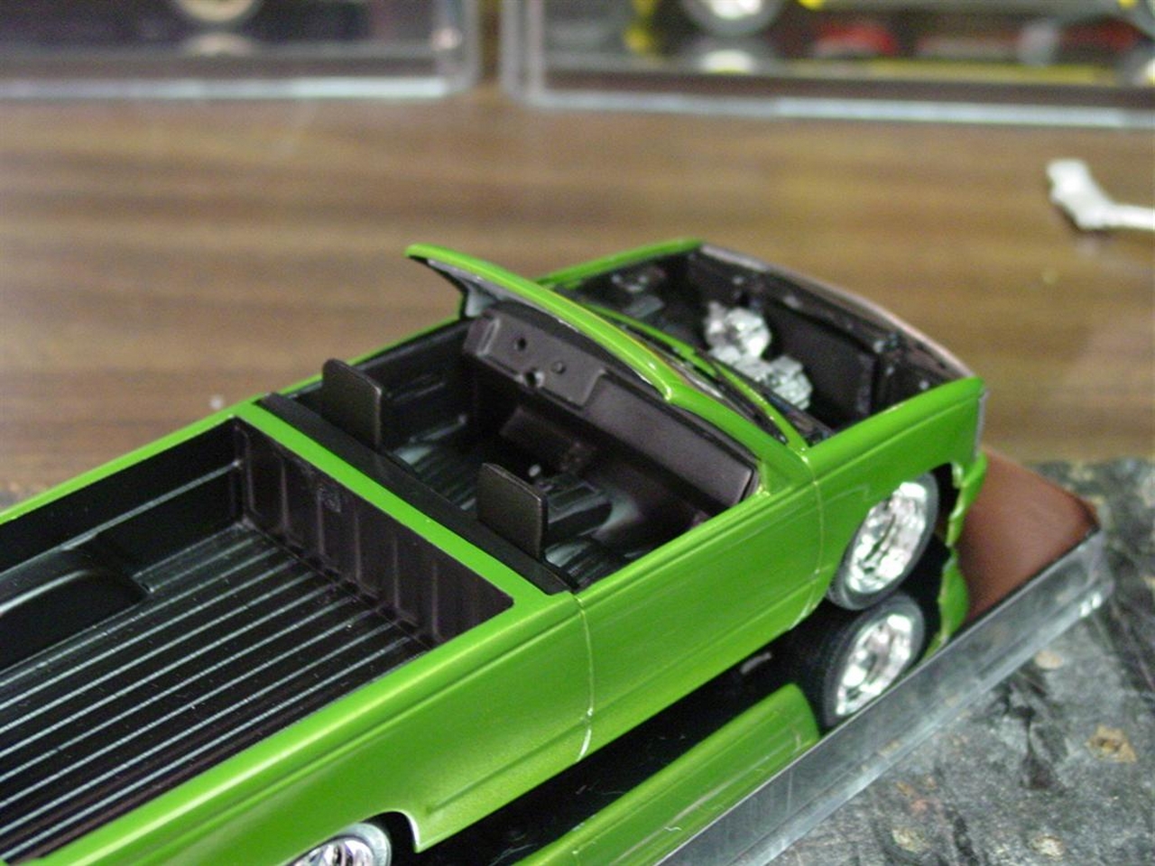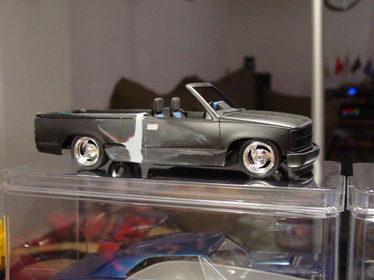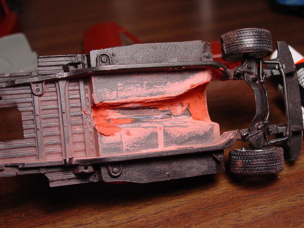 This was a labor of frustration! This kit weighs a lot! There is an incredible amount of body filler in this kit. I blended the cab into the bed. I blended the tail gate into the bed. I built up the area around the interior to make it look right. I later added corvette tail lights. They were sourced from a ’96 vette kit that I wasn’t going to build. I also used chezoom wheels, along with ’73 trans am front and rear suspension. I grafted in a transmission tunnel from a ’94 trans am kit. I used the engine from the Corvette kit. I also smoothed out quite a bit of the dash to give it a clean look.