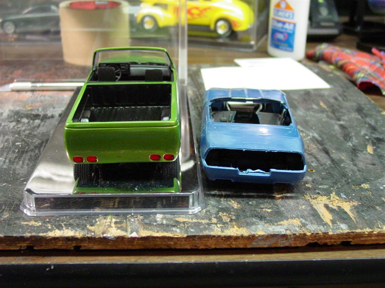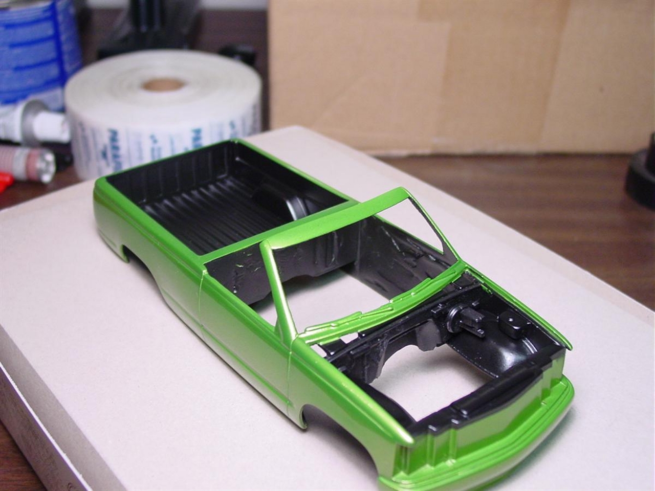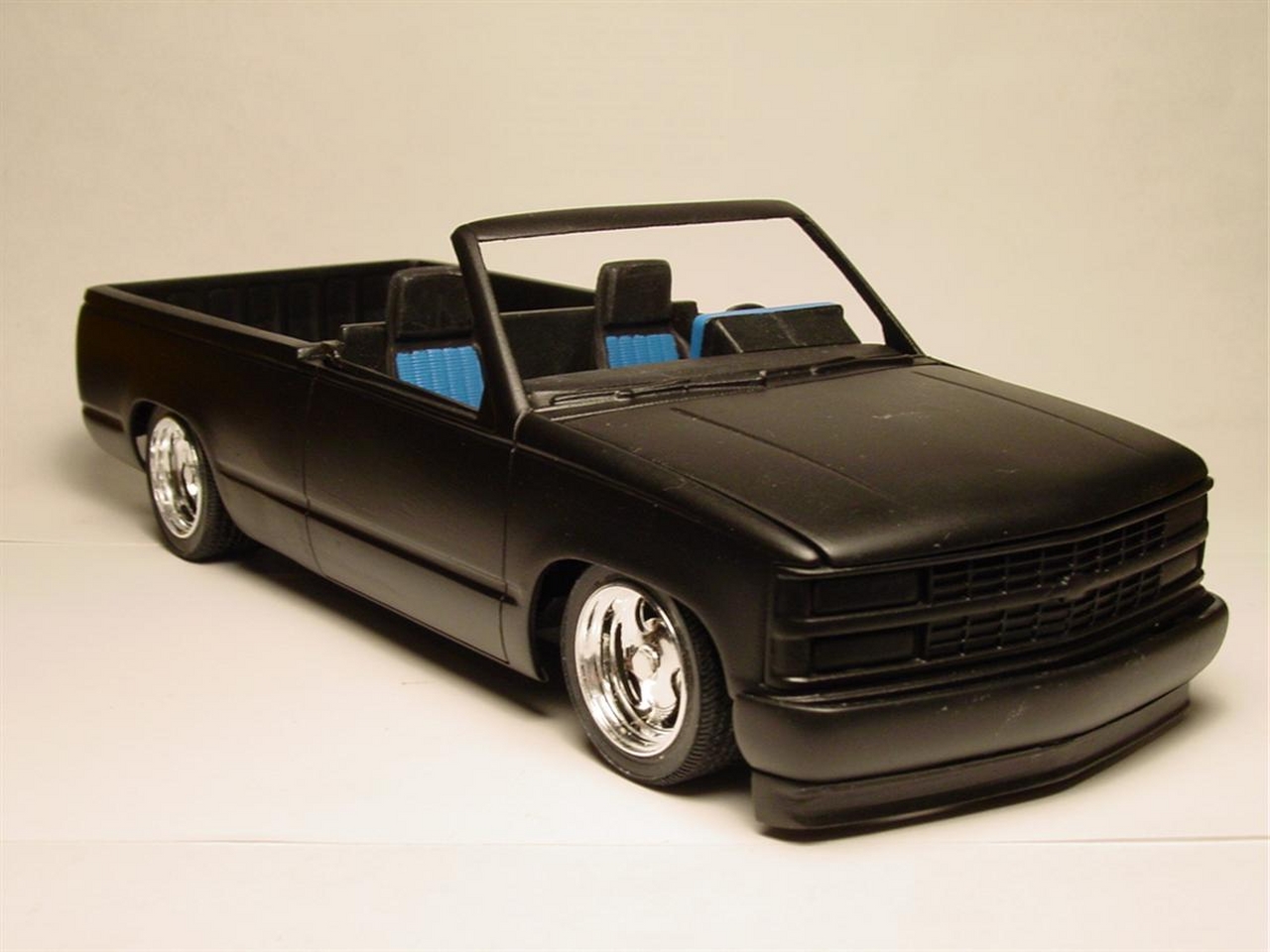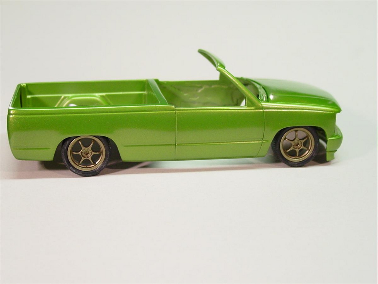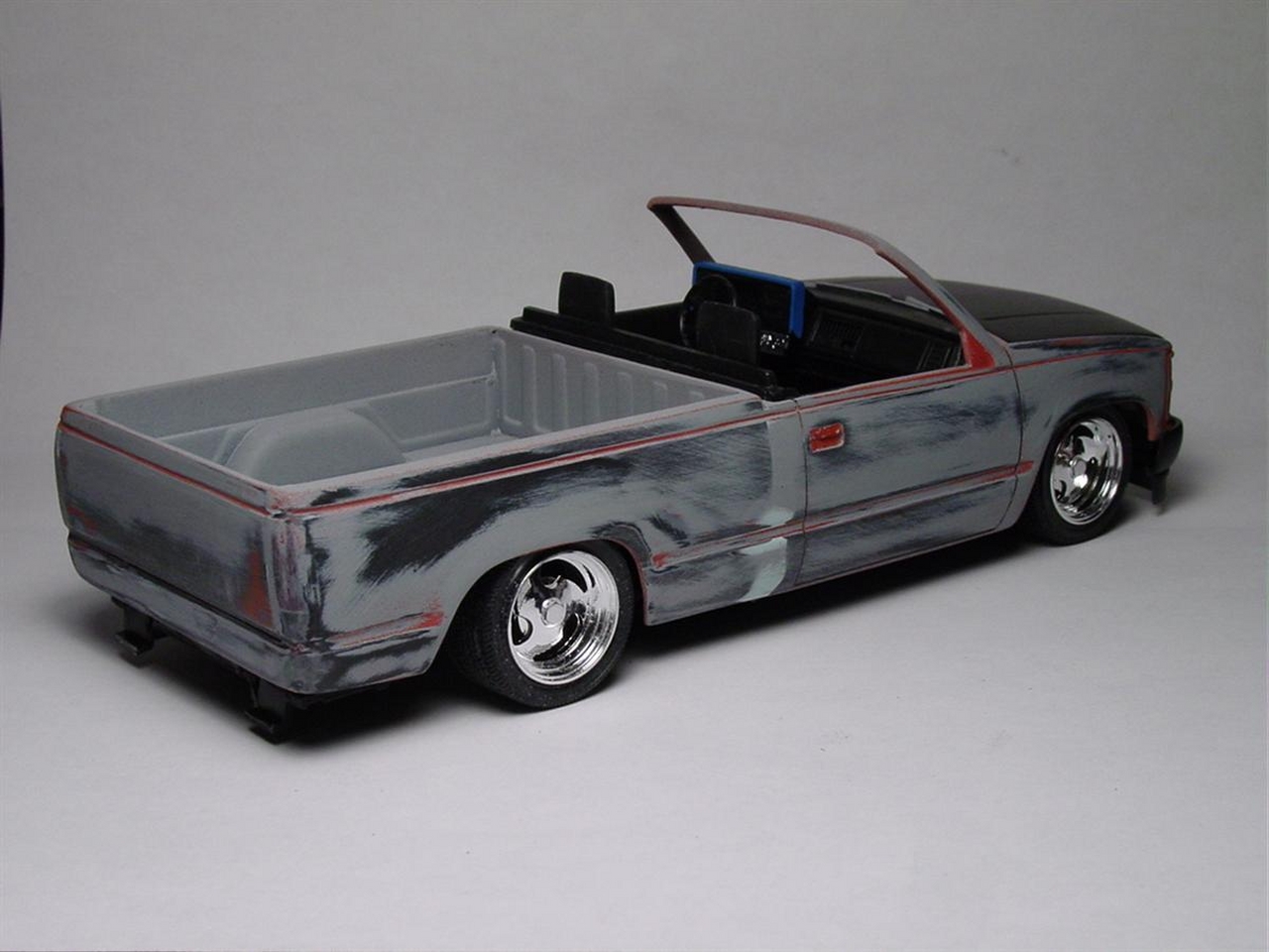 This was a labor of frustration! This kit weighs a lot! There is an incredible amount of body filler in this kit. I blended the cab into the bed. I blended the tail gate into the bed. I built up the area around the interior to make it look right. I later added corvette tail lights. They were sourced from a ’96 vette kit that I wasn’t going to build. I also used chezoom wheels, along with ’73 trans am front and rear suspension. I grafted in a transmission tunnel from a ’94 trans am kit. I used the engine from the Corvette kit. I also smoothed out quite a bit of the dash to give it a clean look.
