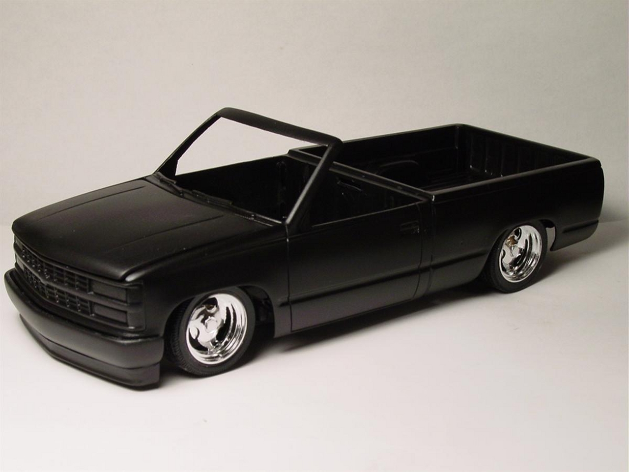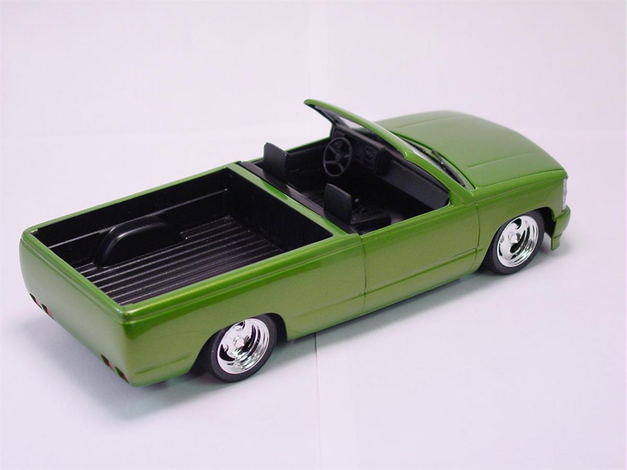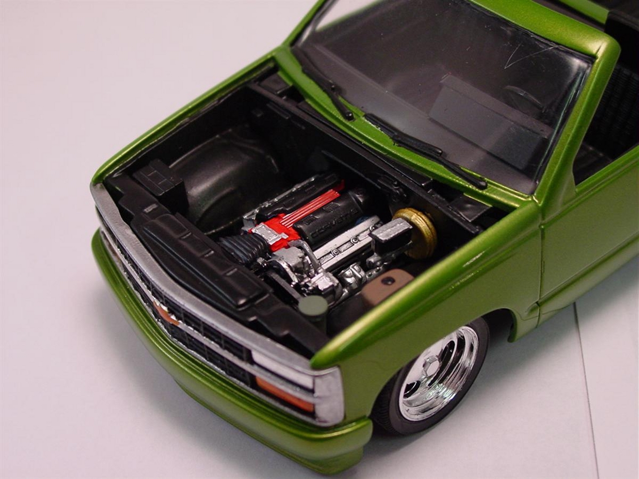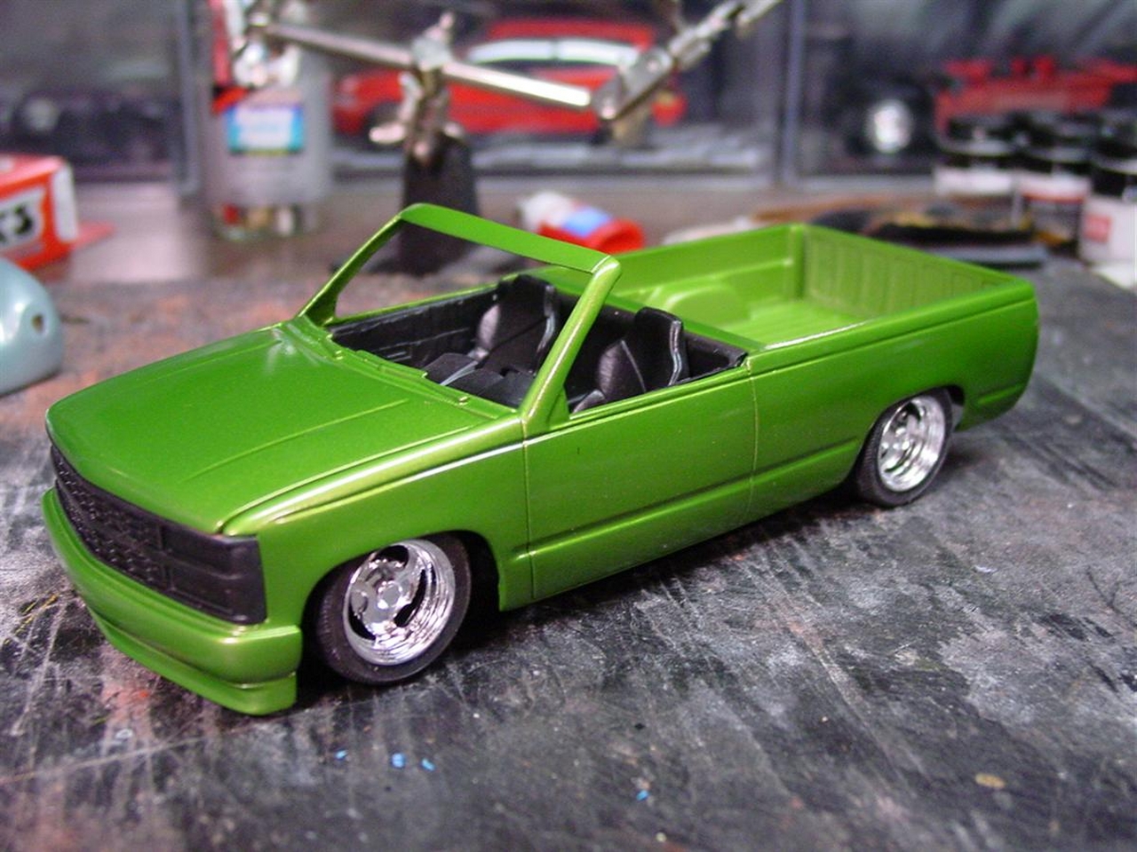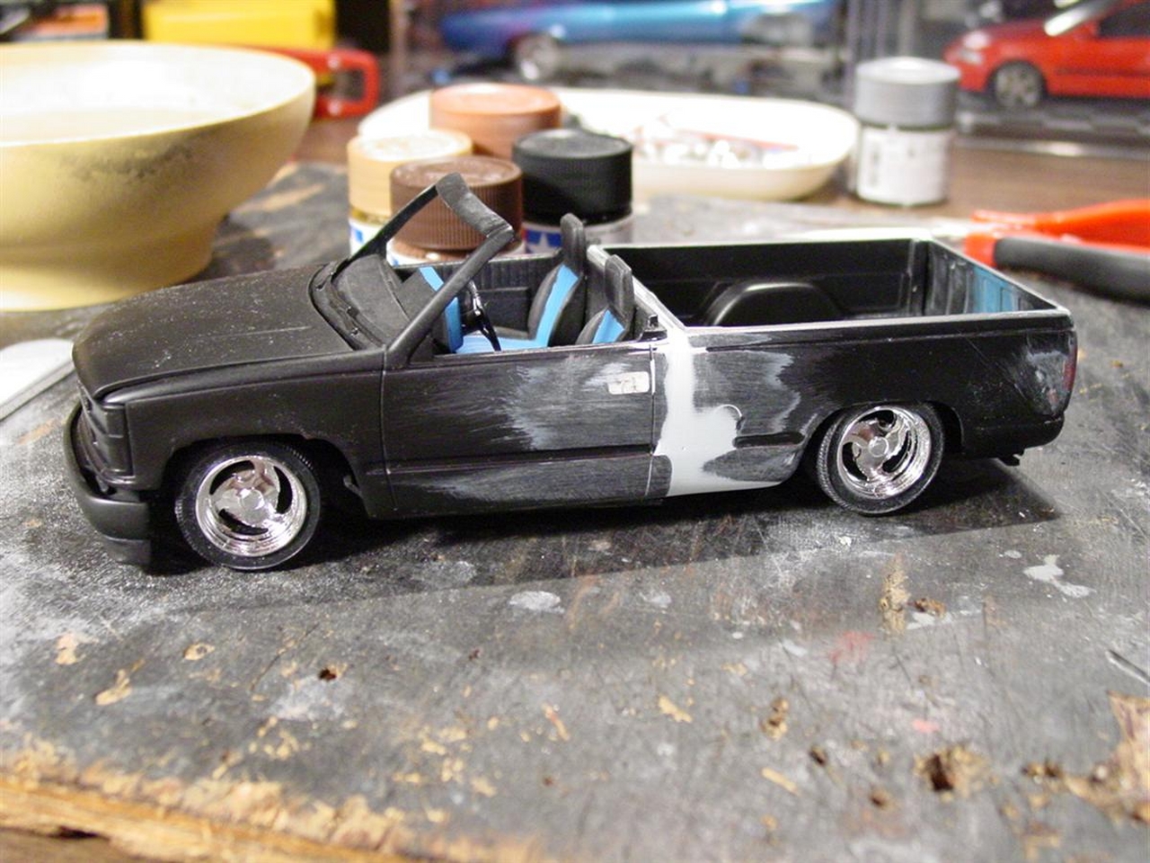 This was a labor of frustration! This kit weighs a lot! There is an incredible amount of body filler in this kit. I blended the cab into the bed. I blended the tail gate into the bed. I built up the area around the interior to make it look right. I later added corvette tail lights. They were sourced from a ’96 vette kit that I wasn’t going to build. I also used chezoom wheels, along with ’73 trans am front and rear suspension. I grafted in a transmission tunnel from a ’94 trans am kit. I used the engine from the Corvette kit. I also smoothed out quite a bit of the dash to give it a clean look.