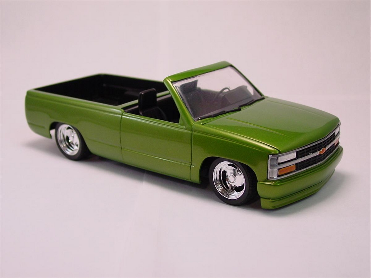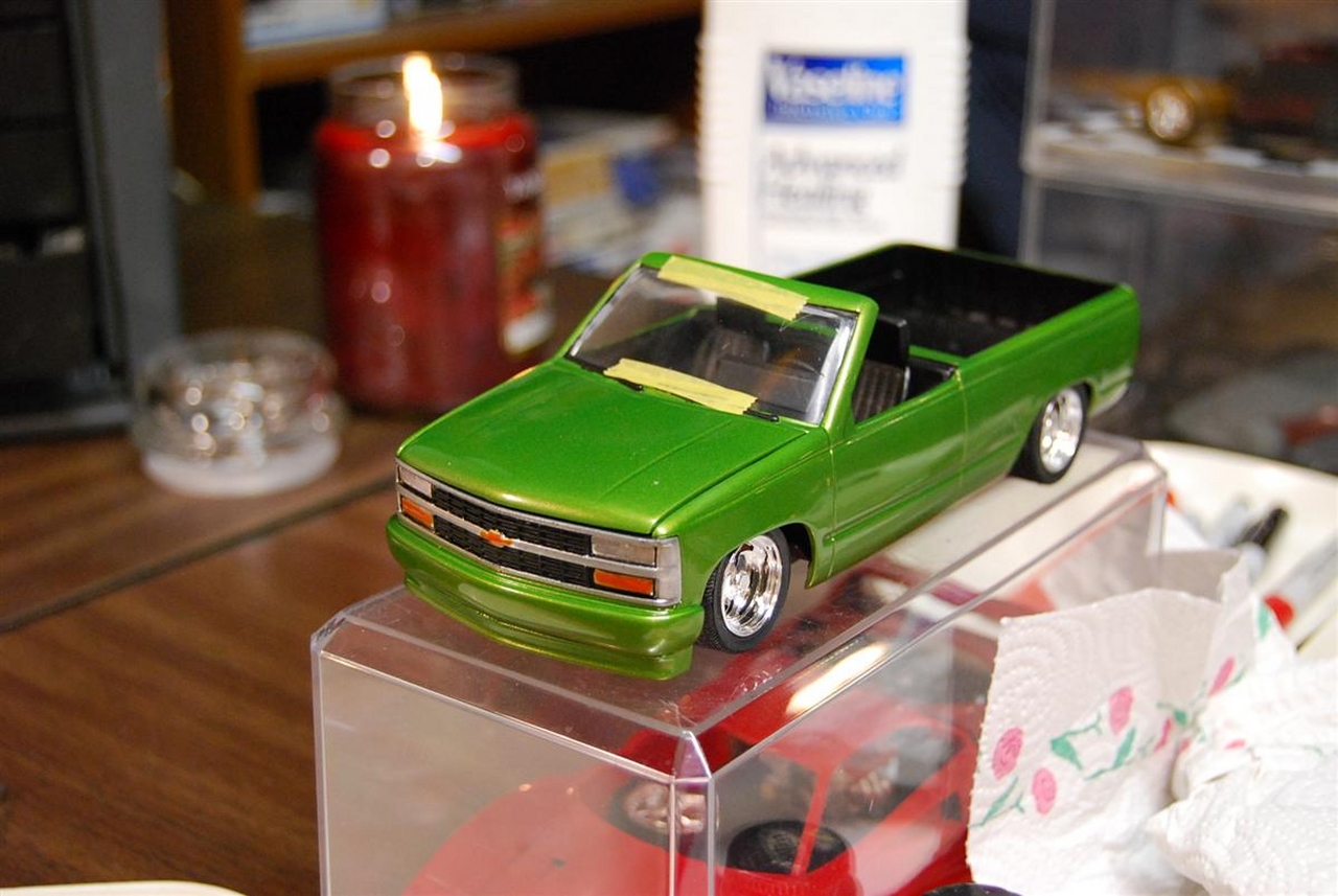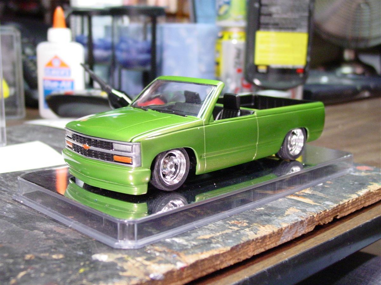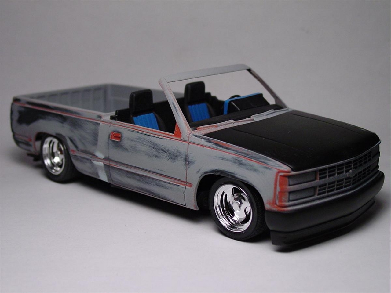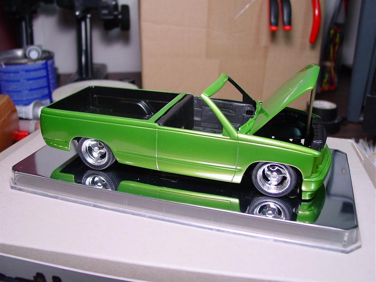 This was a labor of frustration! This kit weighs a lot! There is an incredible amount of body filler in this kit. I blended the cab into the bed. I blended the tail gate into the bed. I built up the area around the interior to make it look right. I later added corvette tail lights. They were sourced from a ’96 vette kit that I wasn’t going to build. I also used chezoom wheels, along with ’73 trans am front and rear suspension. I grafted in a transmission tunnel from a ’94 trans am kit. I used the engine from the Corvette kit. I also smoothed out quite a bit of the dash to give it a clean look.