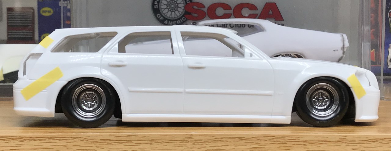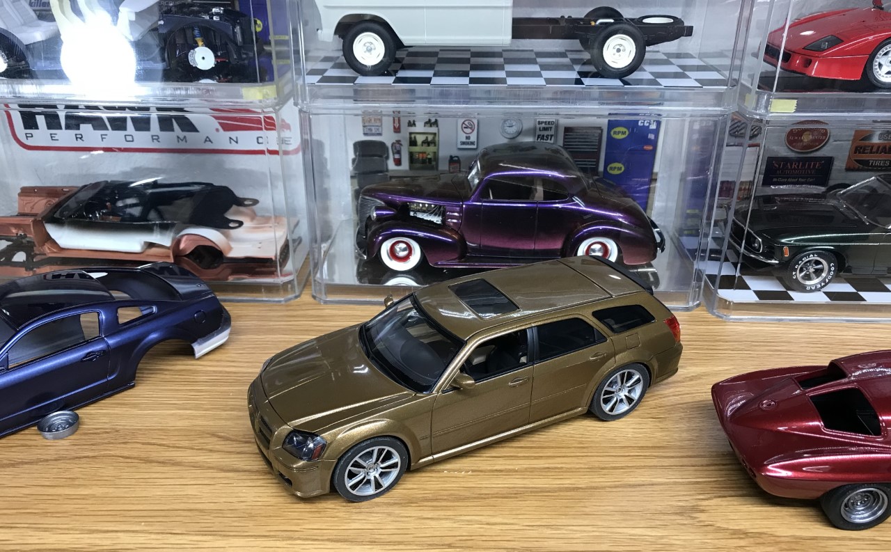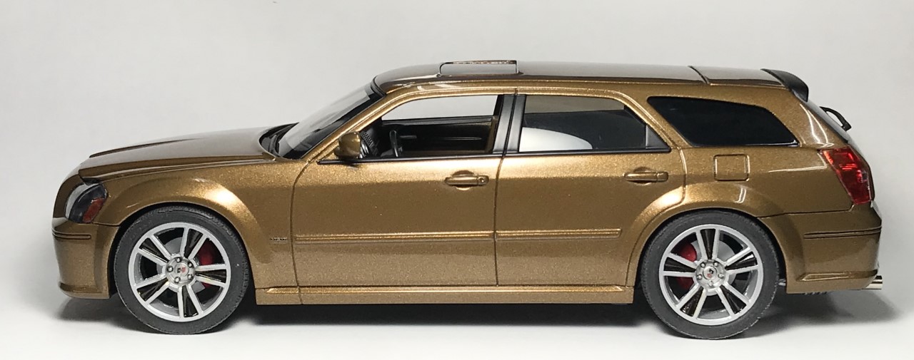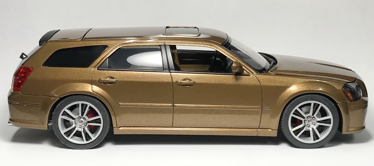 The next change was a new set of wheels. The kit wheels and tires look too small. While going through my stash of wheels, I found a set of Fireball Models “Stunner” wheels and decided to use them. I bought them a few years ago with plans for using them on a different build but found that the advertised scale 20″ was much closer to a scale 23″. They were too big. However, they fit the Magnum perfectly. I also found several pictures online of the full scale version of the wheels mounted on Challengers. Perfect!