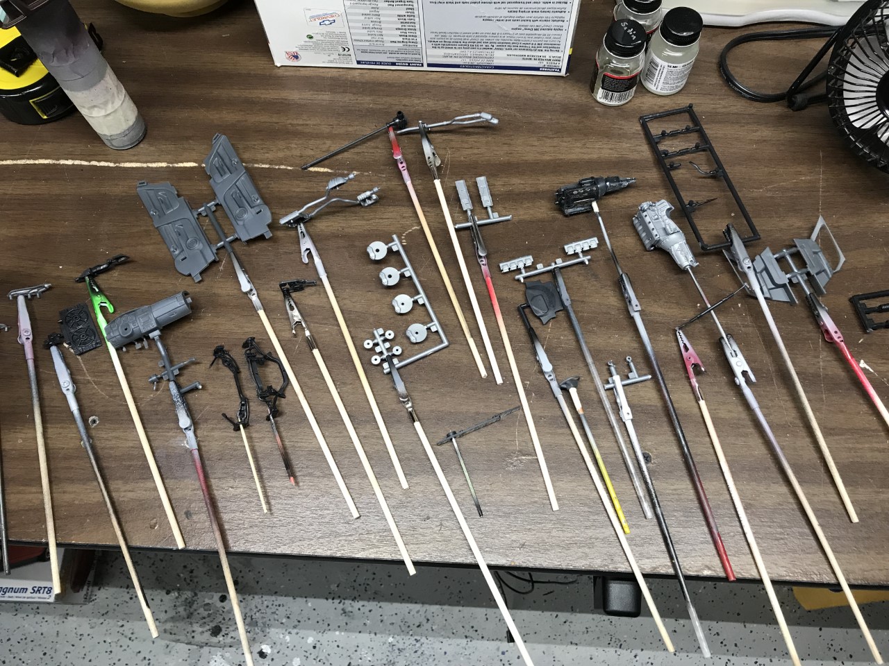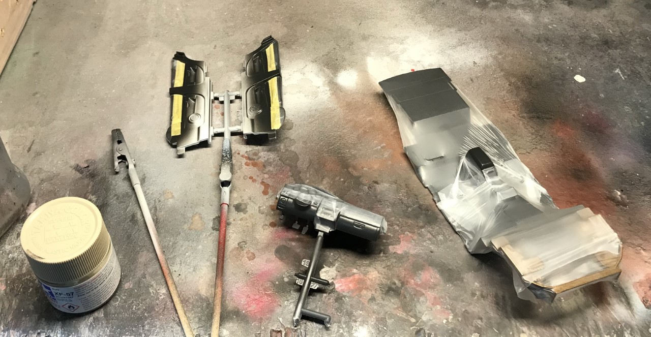 As with the rest of the kit, the chassis and engine practically fell together. I started by prepping the parts, attaching them to sticks, priming them and spraying various colors as required.