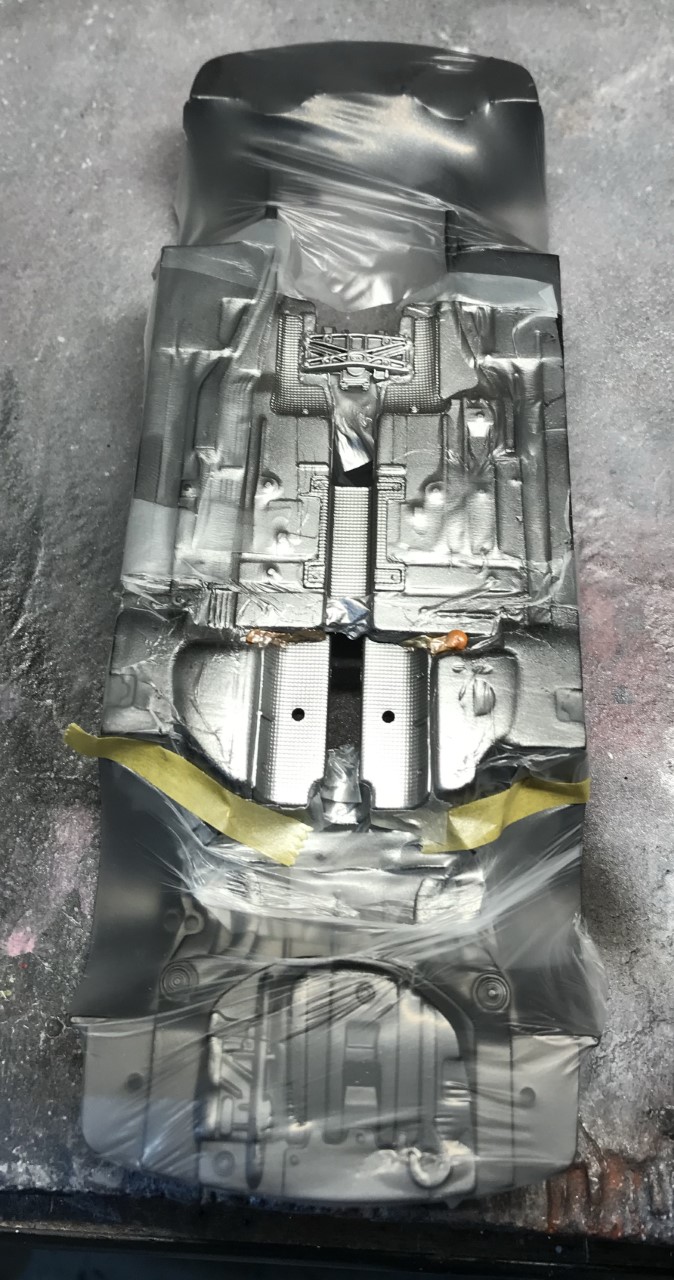 After curing for a few days, I sanded and polished the clear and masked the body for trim paint. To avoid hand painting the grills, I painstakingly masked it with Tamiya tape and parafilm.