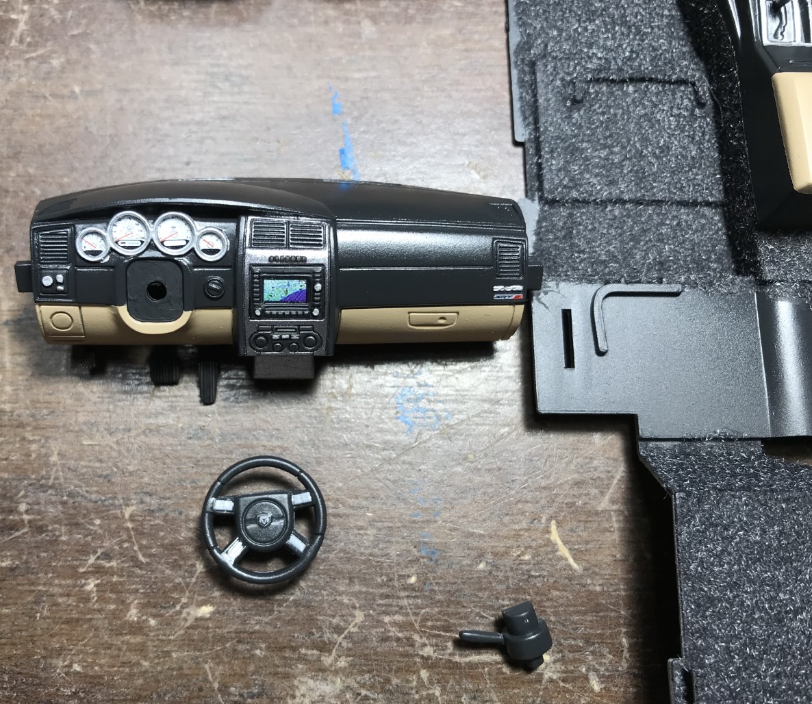 The Magnum’s interior is comprised of quite a few parts. Everything was engraved will and required minimal clean-up. As usual, the two-part front seats along with the rear bench required filler to clean up the seams. Once complete, I reviewed reference photos online to decide my color scheme. Rather than use a black and gray combination that is typical for the Magnum, I chose a dark charcoal gray (mix of Tamiya grays) and Tamiya buff. Once painted, I flocked the interior with charcoal grey flocking and added decals and detail paint to the dash and other parts.
