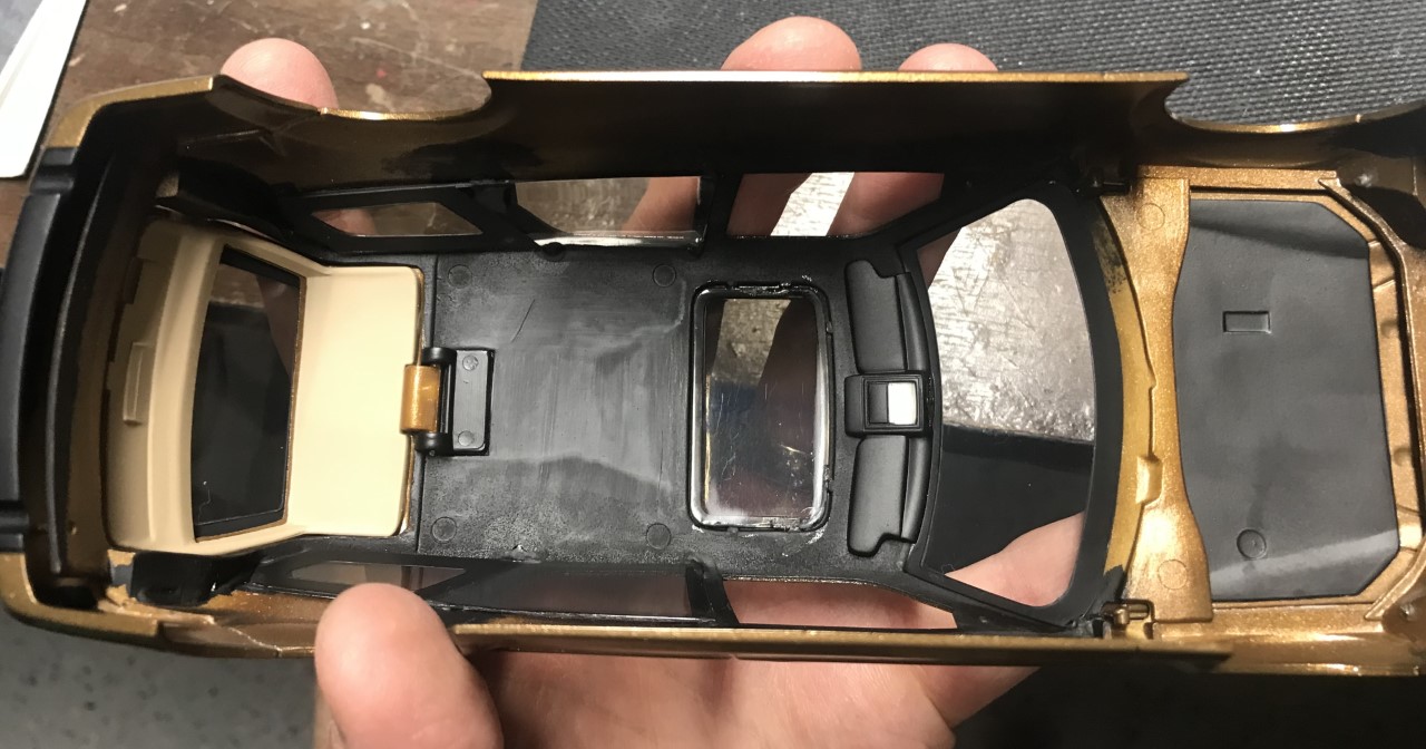 I used Scale Finishes glossy Y9 dark gold paint. The last project I used their paint was the ’70 Roadrunner I finished a few years ago. I struggled using the paint then and I struggled once again here. The color builds very slowly and is difficult to to make uniform. While painting, I ran out of paint and realized that none of the separate parts matched. I ordered another bottle but elected to use the base cote version. Once that arrived, I quickly finished spraying color. The base cote version is much easier to use! Shortly after, I sprayed the body with Gravity Colors 2-part clear.