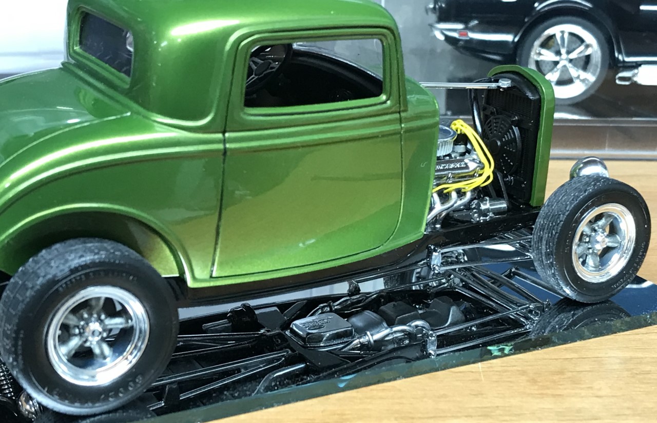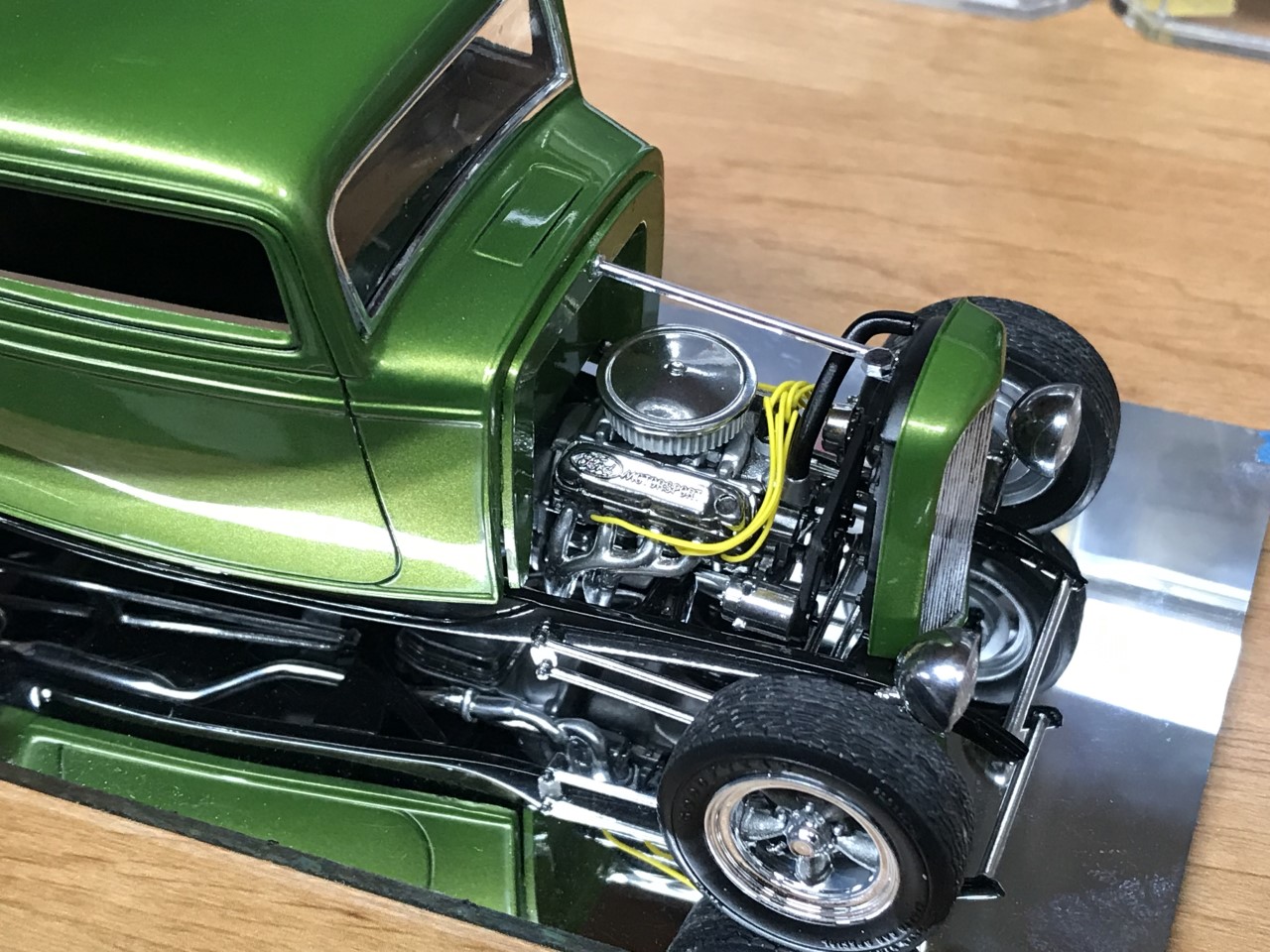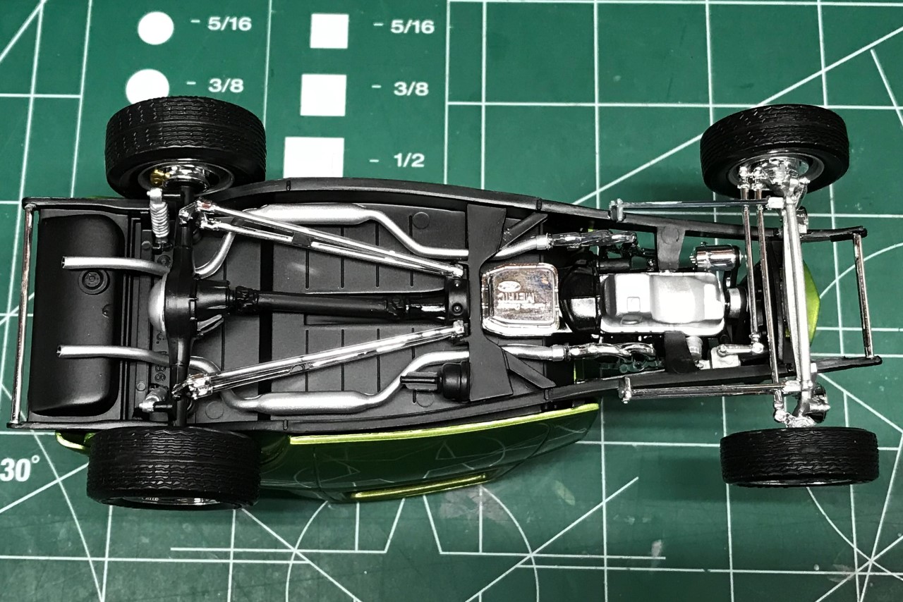 A bad move on the chassis resulted in stripping the paint and starting over. One I fixed all of the sink marks and other blemishes, I resprayed the chassis. After letting the enamel cure for a week or so, I started the final assembly. The chassis and suspension went together quickly. I assembled the engine and wired it and glued it in place. There were a few stragglers that needed paint and chrome. Once those were painted, I was able to finish the model. I also added the side panels of the hood that I painted but never attached during the original build.