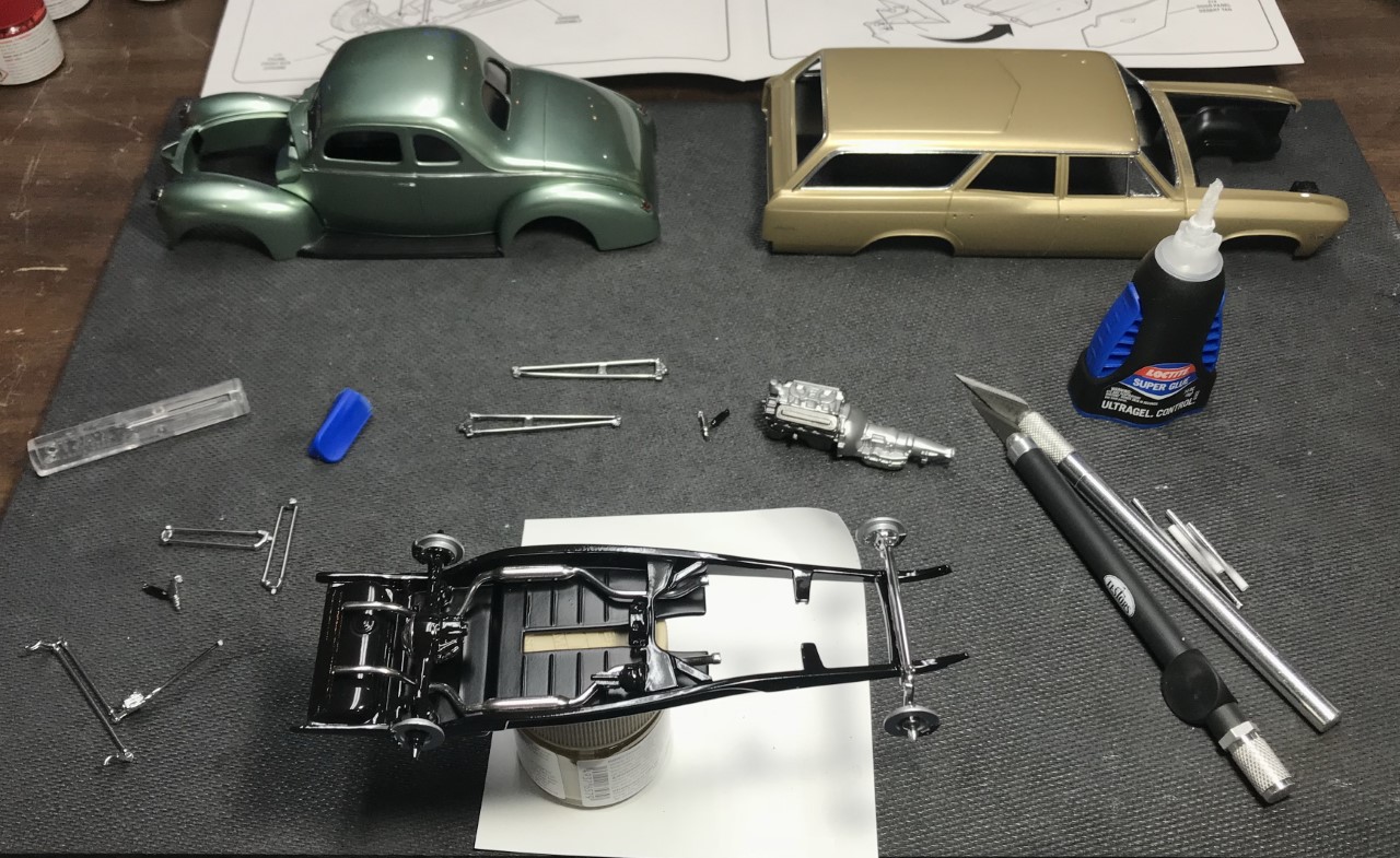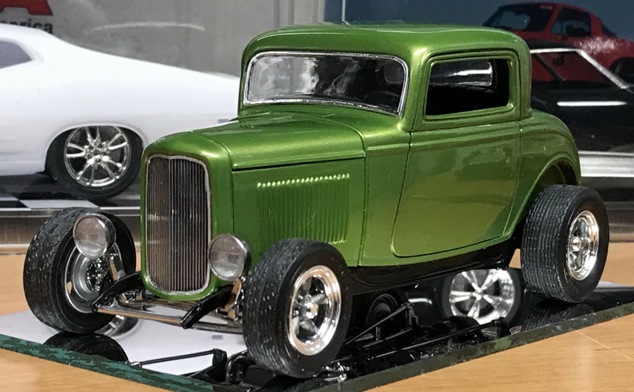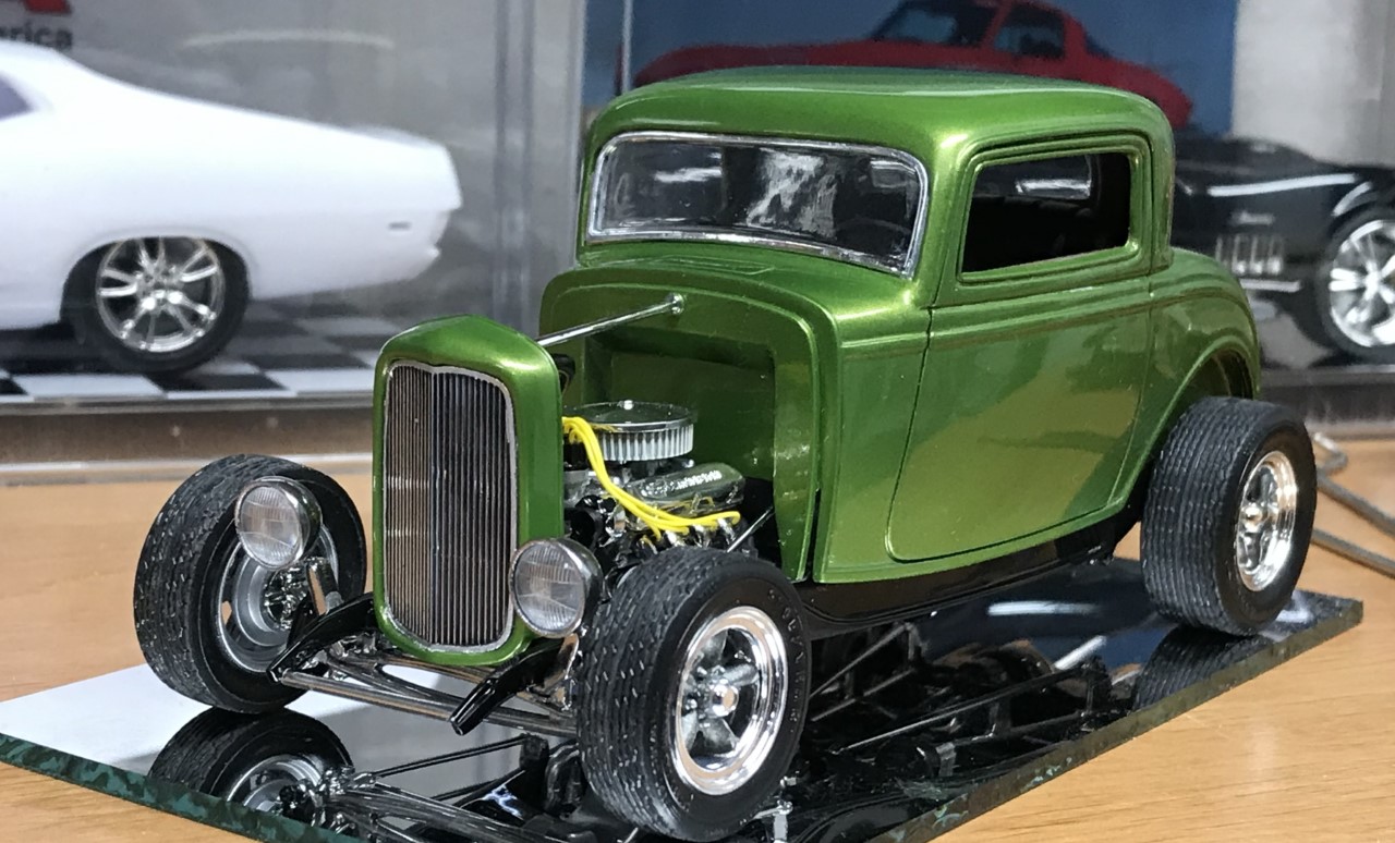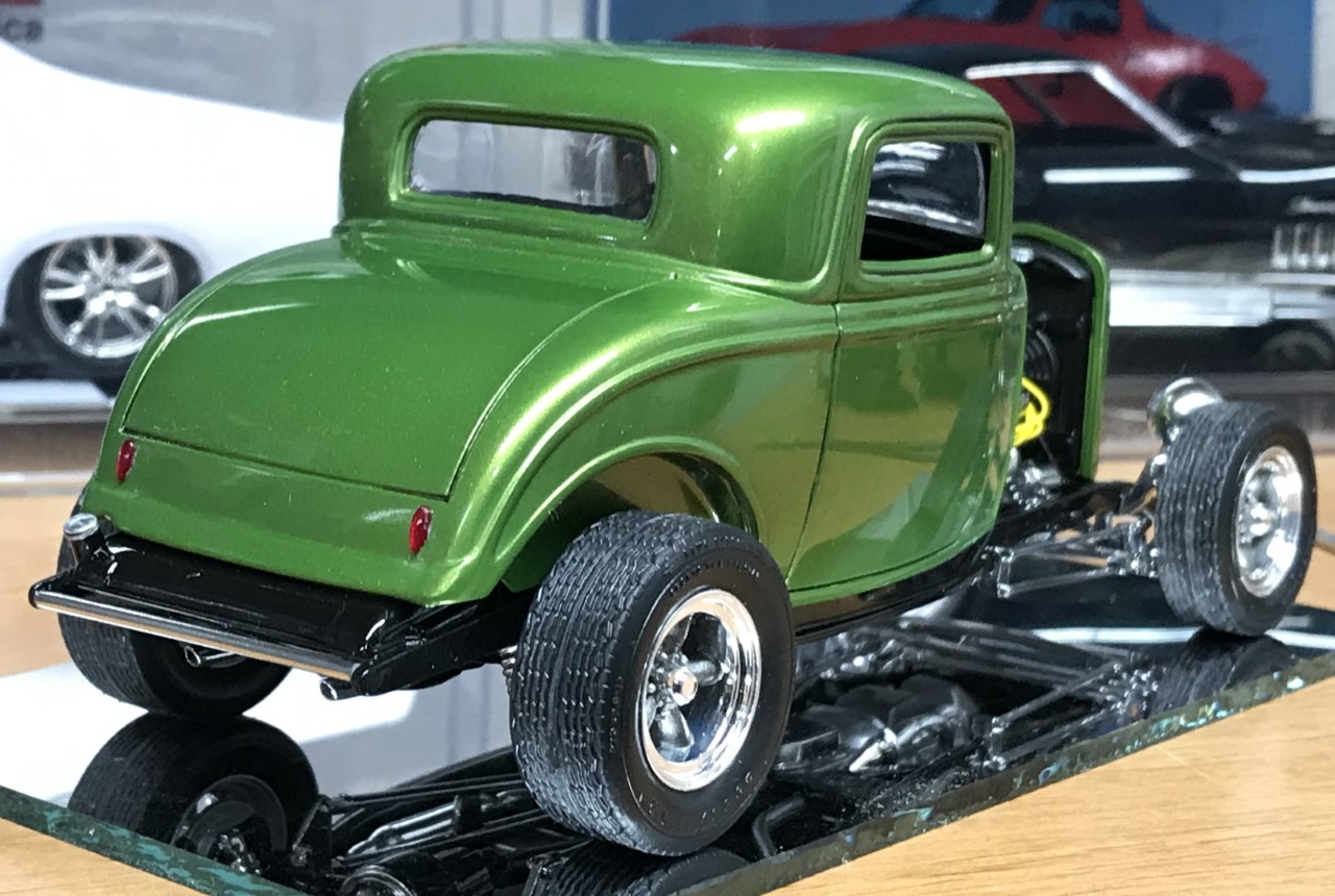 A bad move on the chassis resulted in stripping the paint and starting over. One I fixed all of the sink marks and other blemishes, I resprayed the chassis. After letting the enamel cure for a week or so, I started the final assembly. The chassis and suspension went together quickly. I assembled the engine and wired it and glued it in place. There were a few stragglers that needed paint and chrome. Once those were painted, I was able to finish the model. I also added the side panels of the hood that I painted but never attached during the original build.