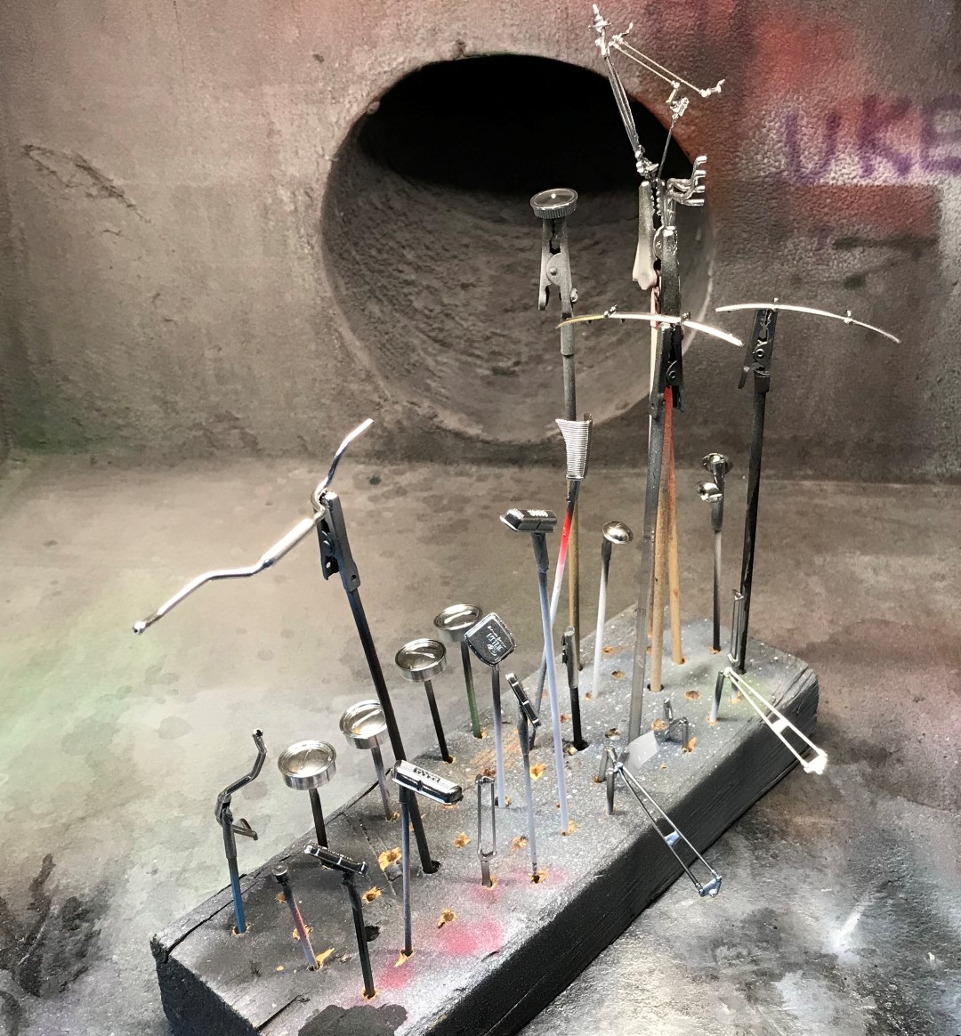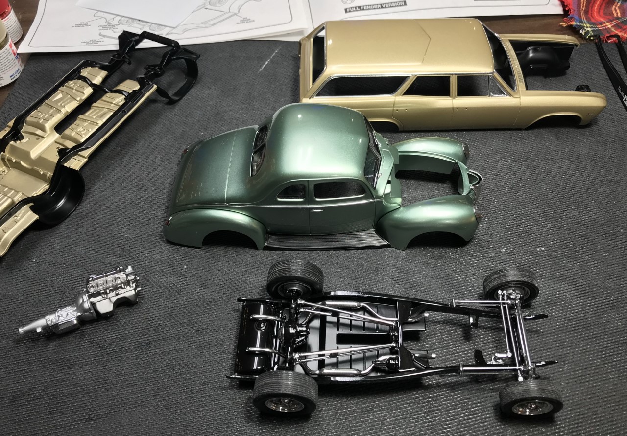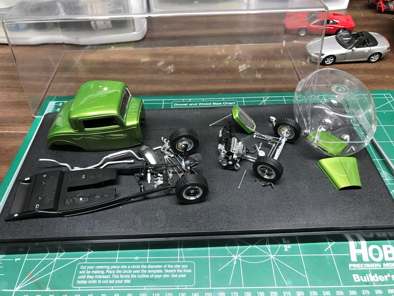 Once everything was ready and attached to clips, toothpicks, sticks of styrene or a bottle, I chromed everything but the chassis and rear axle. The engine and transmission were painted gunmetal and aluminum.