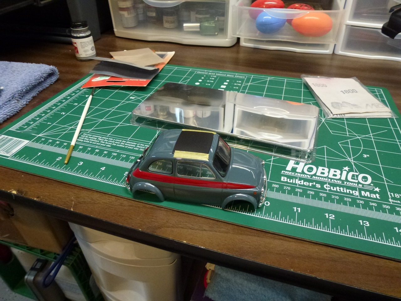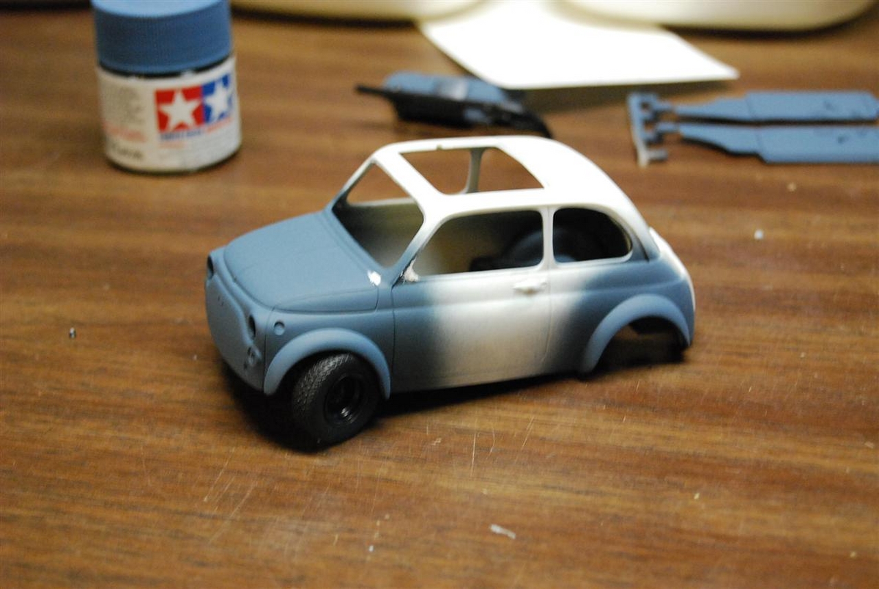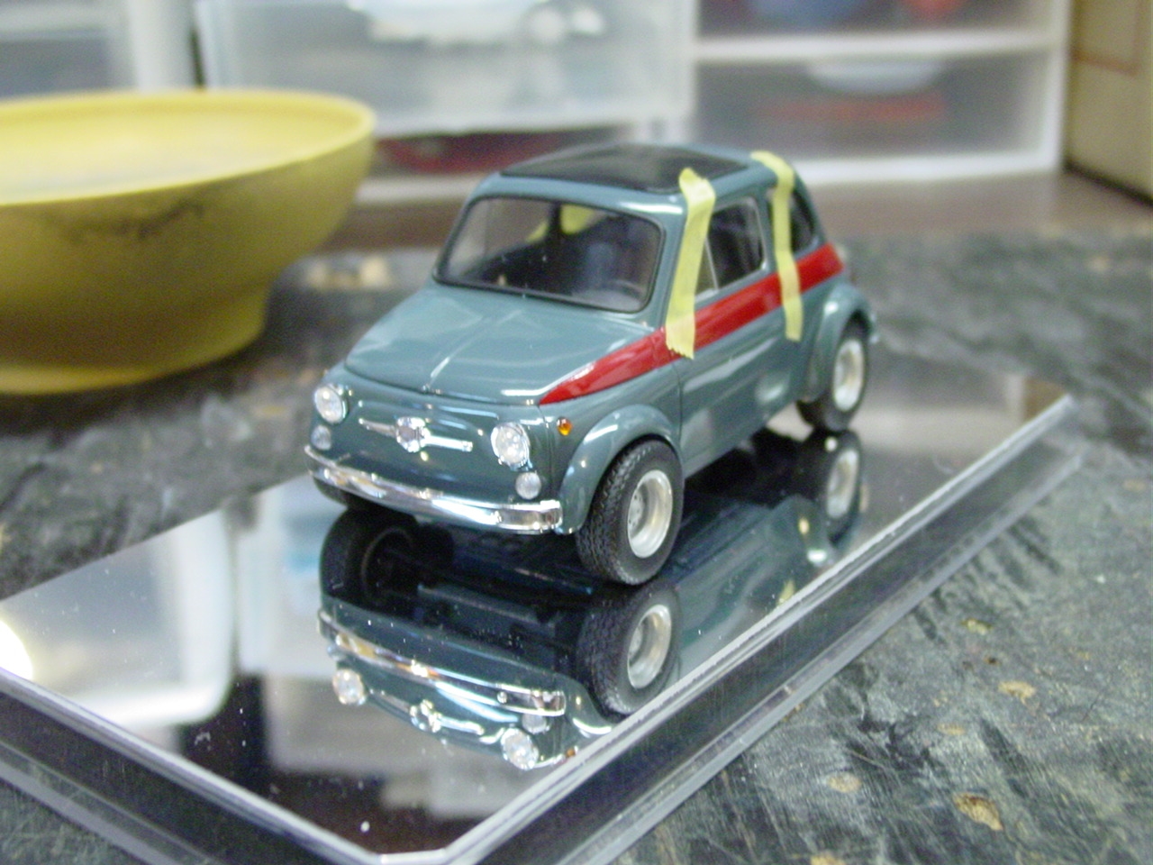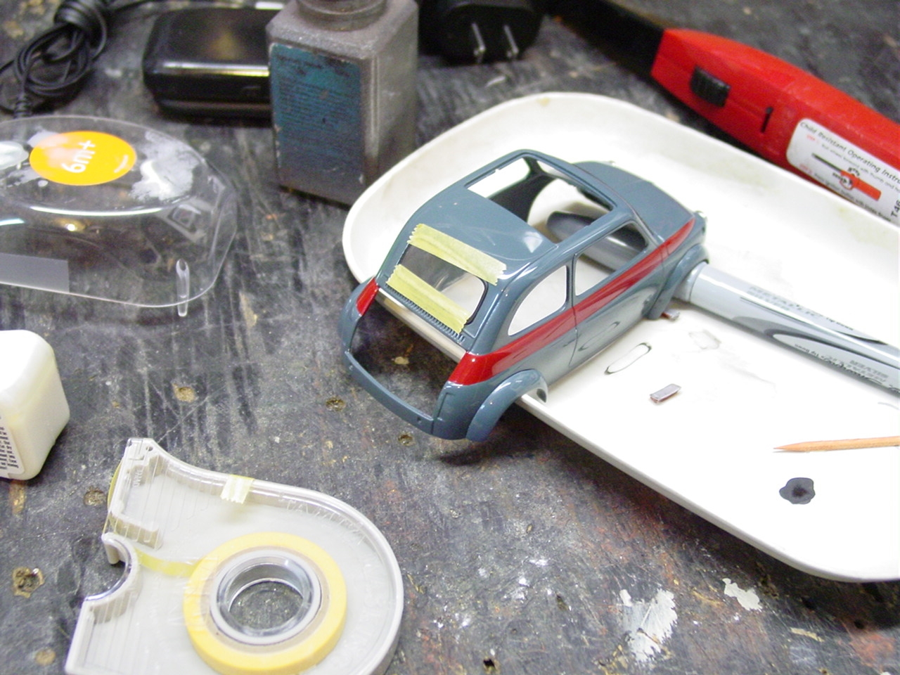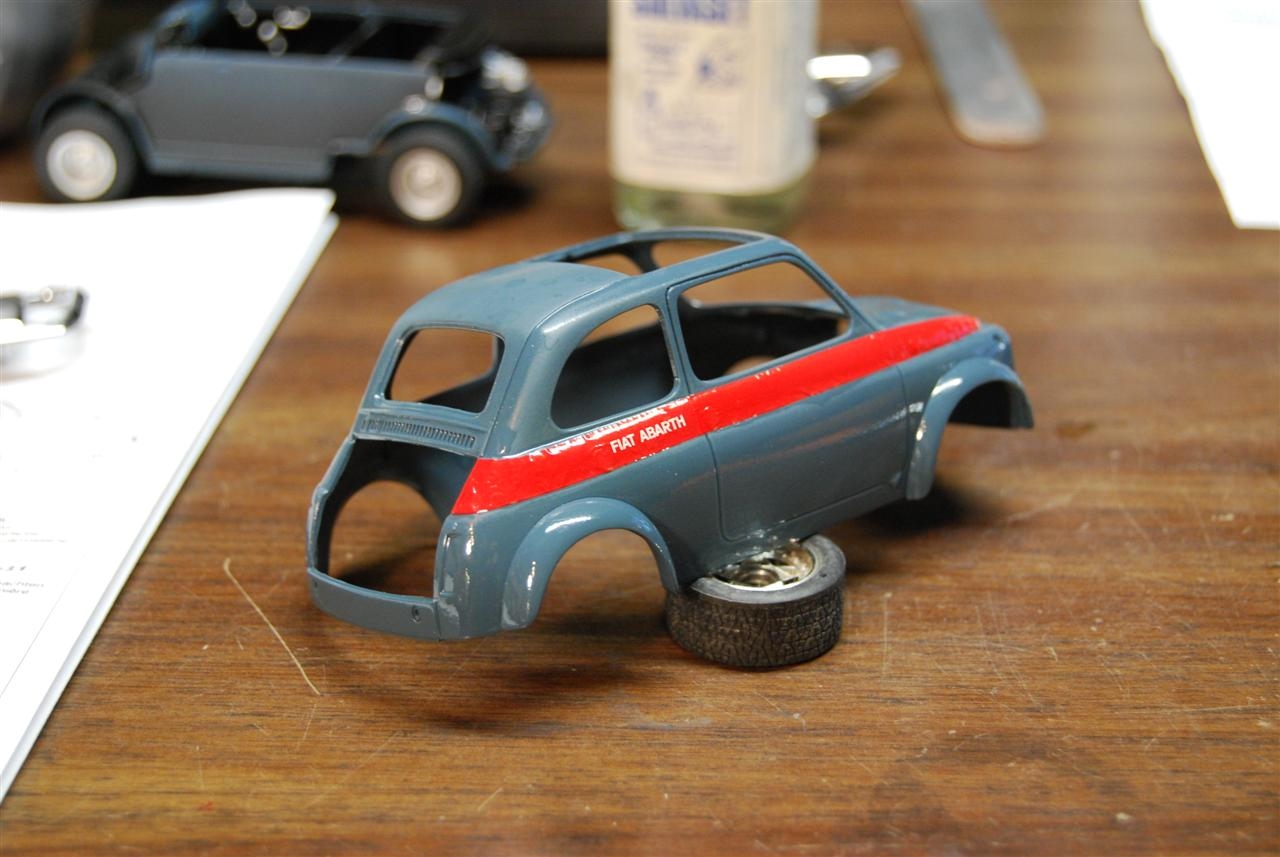 Luigi from the movie Car’s was a Fiat very similar to this kit. The likeness is why I wanted to build it! I shaved quite a bit of trim off of this kit giving it a cleaner look. I botched the original decals for the sides and since the kit was discontinued, at the time, I wasn’t able to order a new decal sheet. I still wanted the red stripes and medium blue alone would be a little boring. I decided to mask the body and sprayed the stripes.