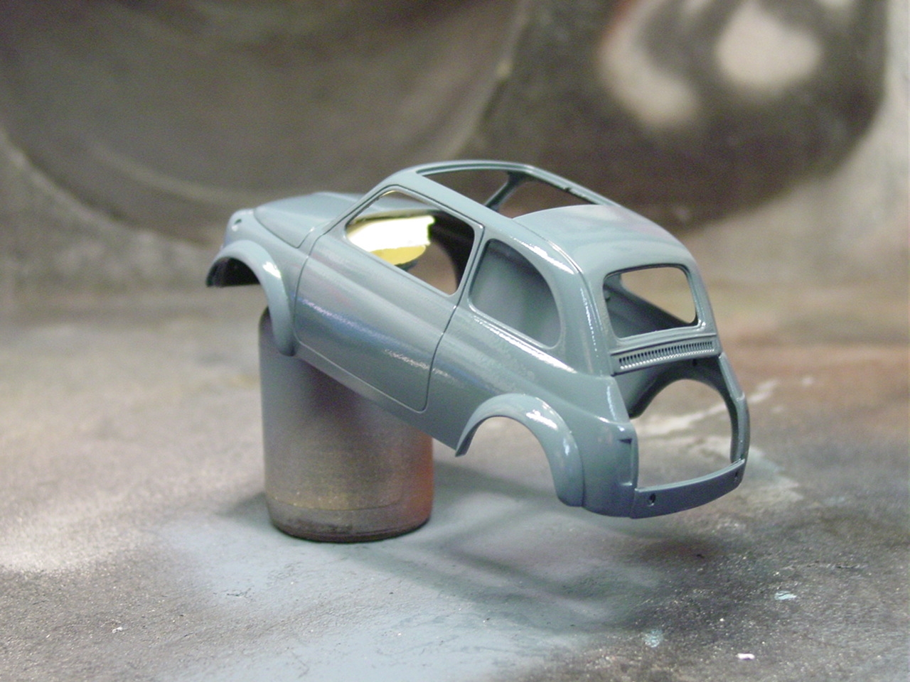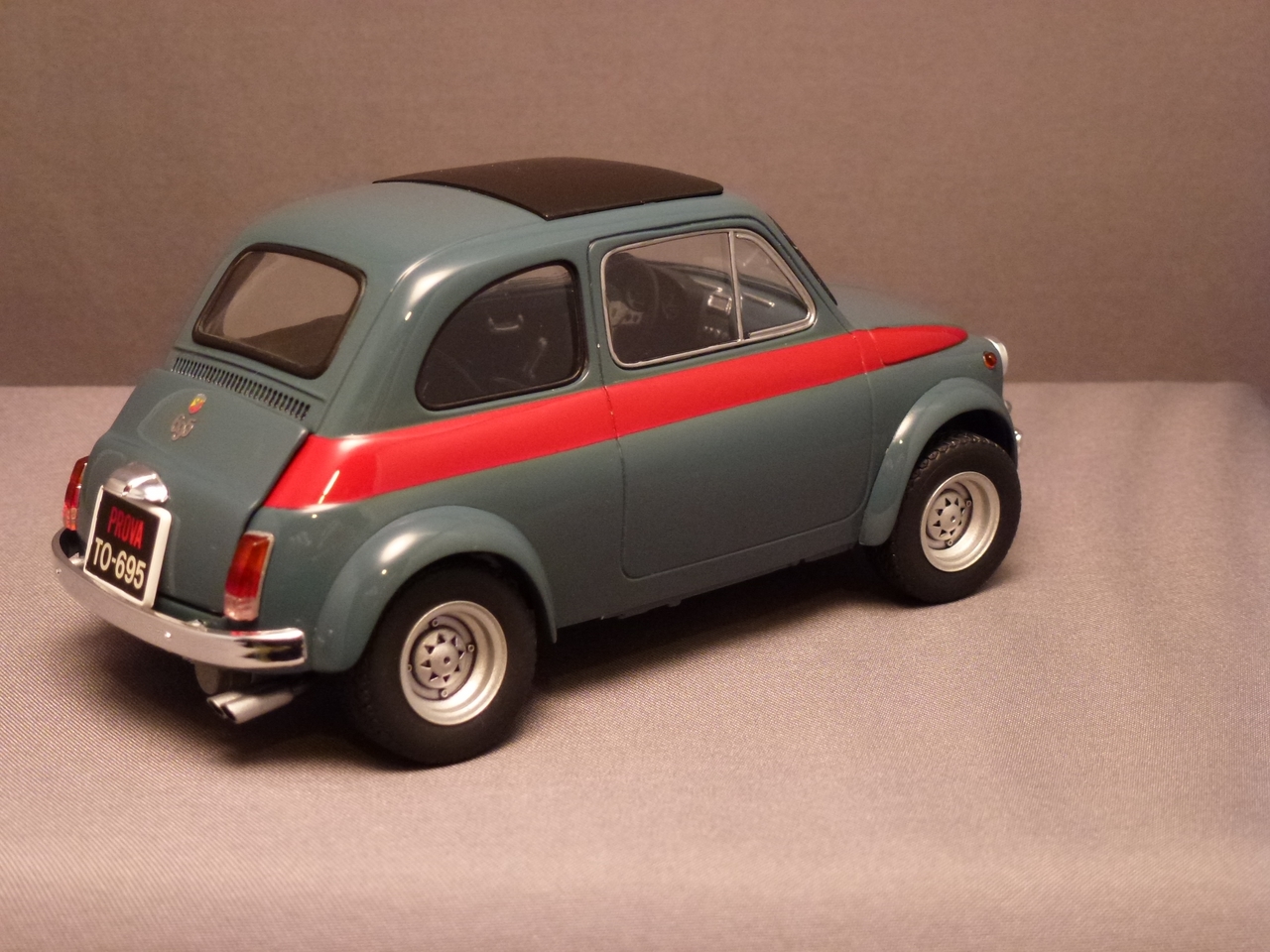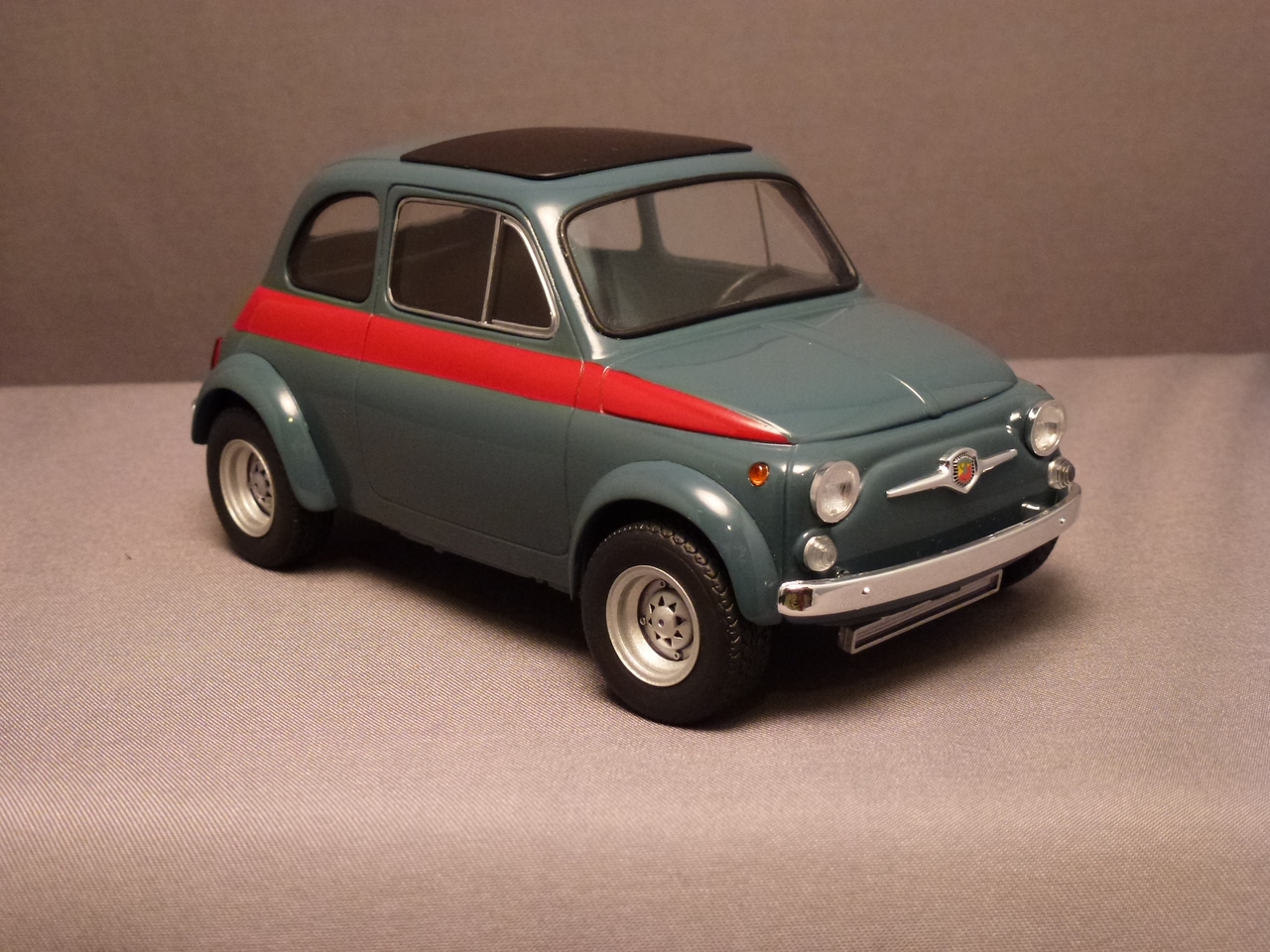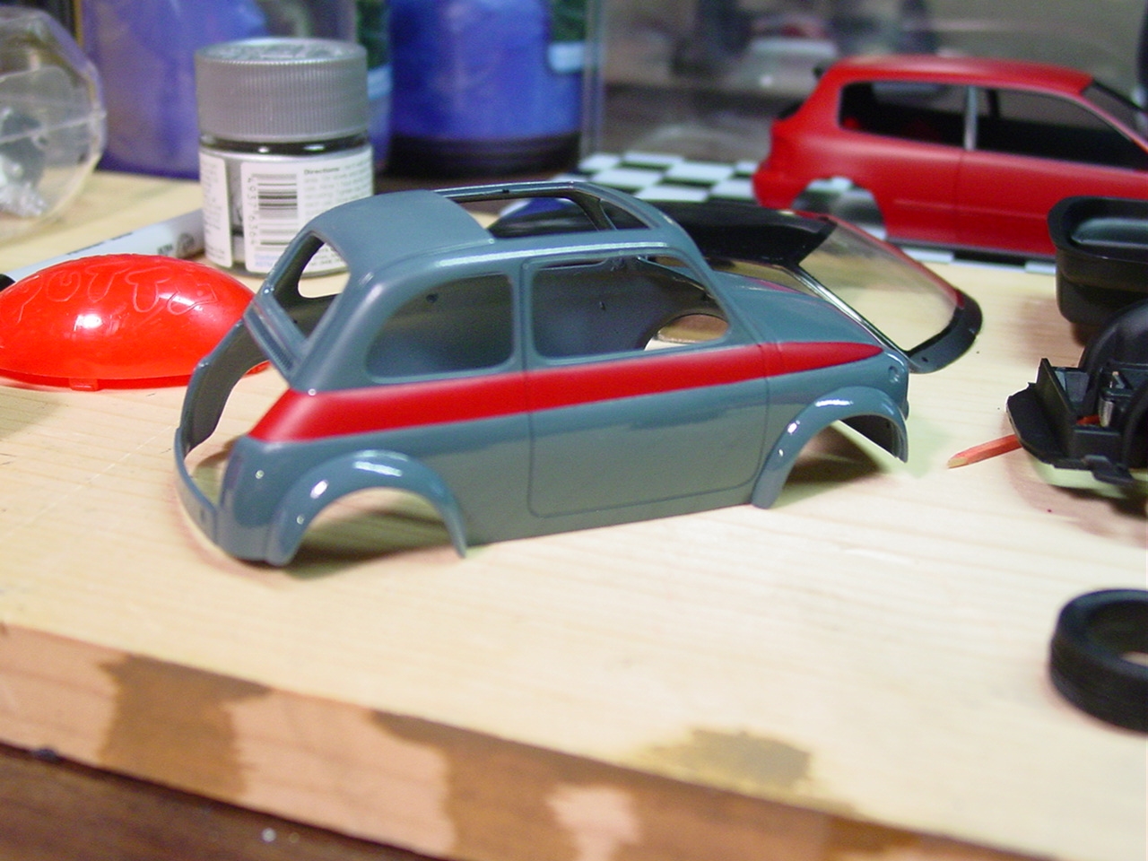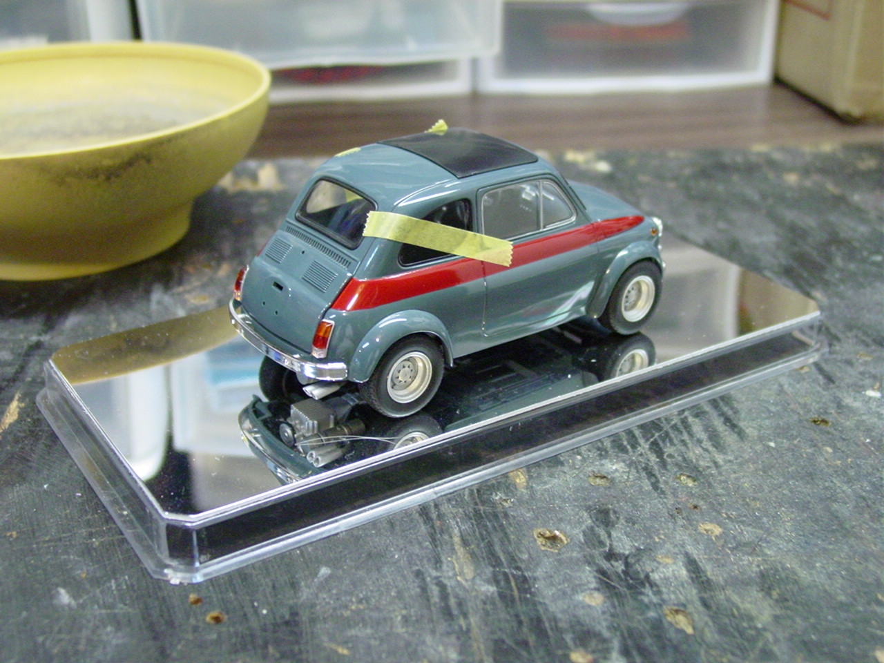 Luigi from the movie Car’s was a Fiat very similar to this kit. The likeness is why I wanted to build it! I shaved quite a bit of trim off of this kit giving it a cleaner look. I botched the original decals for the sides and since the kit was discontinued, at the time, I wasn’t able to order a new decal sheet. I still wanted the red stripes and medium blue alone would be a little boring. I decided to mask the body and sprayed the stripes.