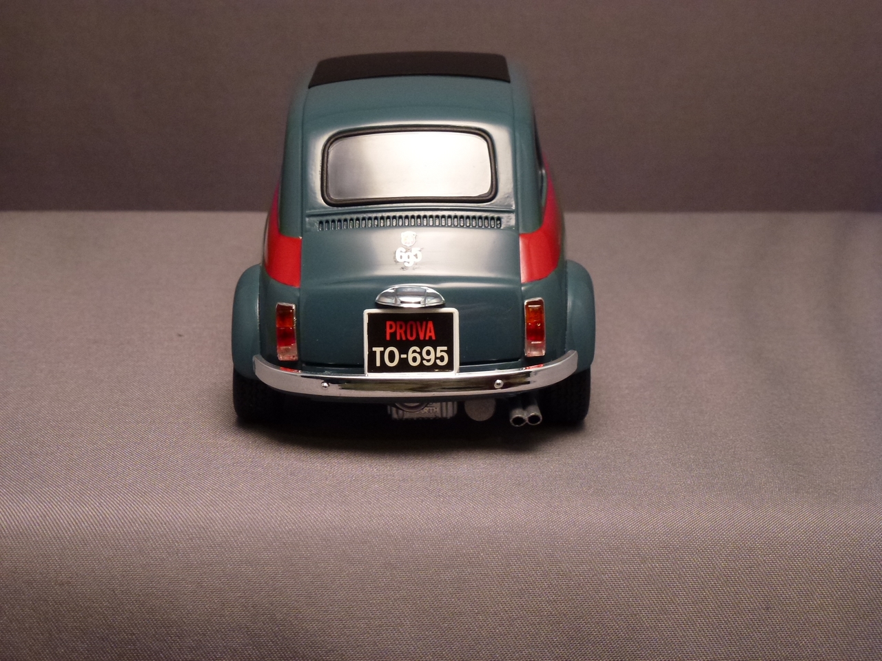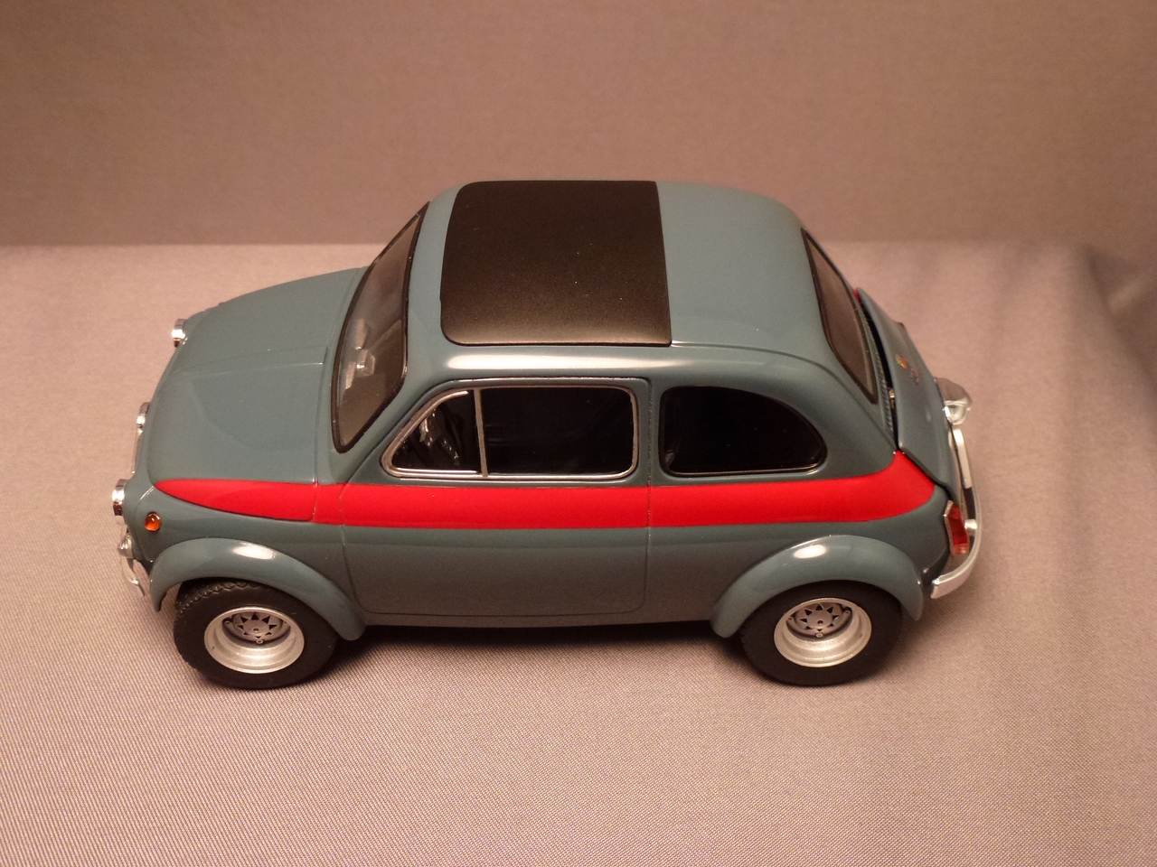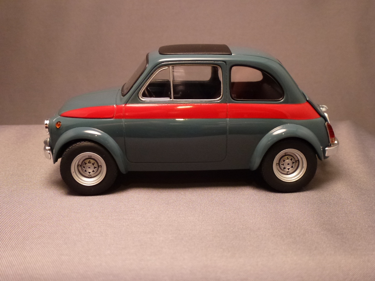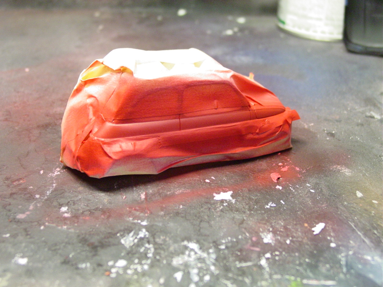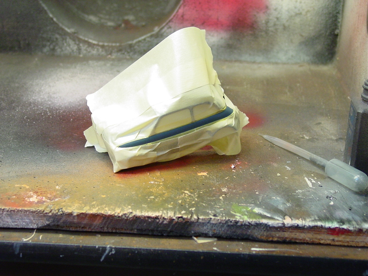 Luigi from the movie Car’s was a Fiat very similar to this kit. The likeness is why I wanted to build it! I shaved quite a bit of trim off of this kit giving it a cleaner look. I botched the original decals for the sides and since the kit was discontinued, at the time, I wasn’t able to order a new decal sheet. I still wanted the red stripes and medium blue alone would be a little boring. I decided to mask the body and sprayed the stripes.