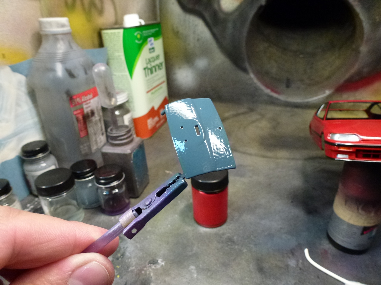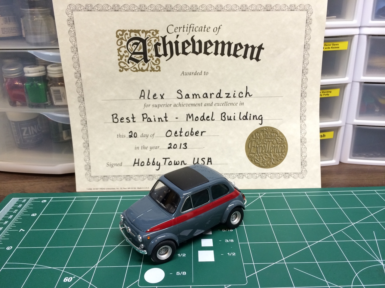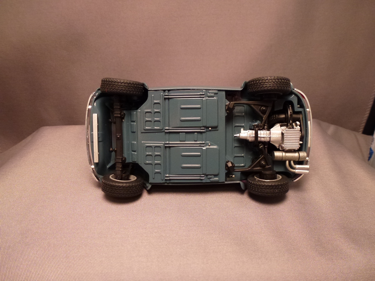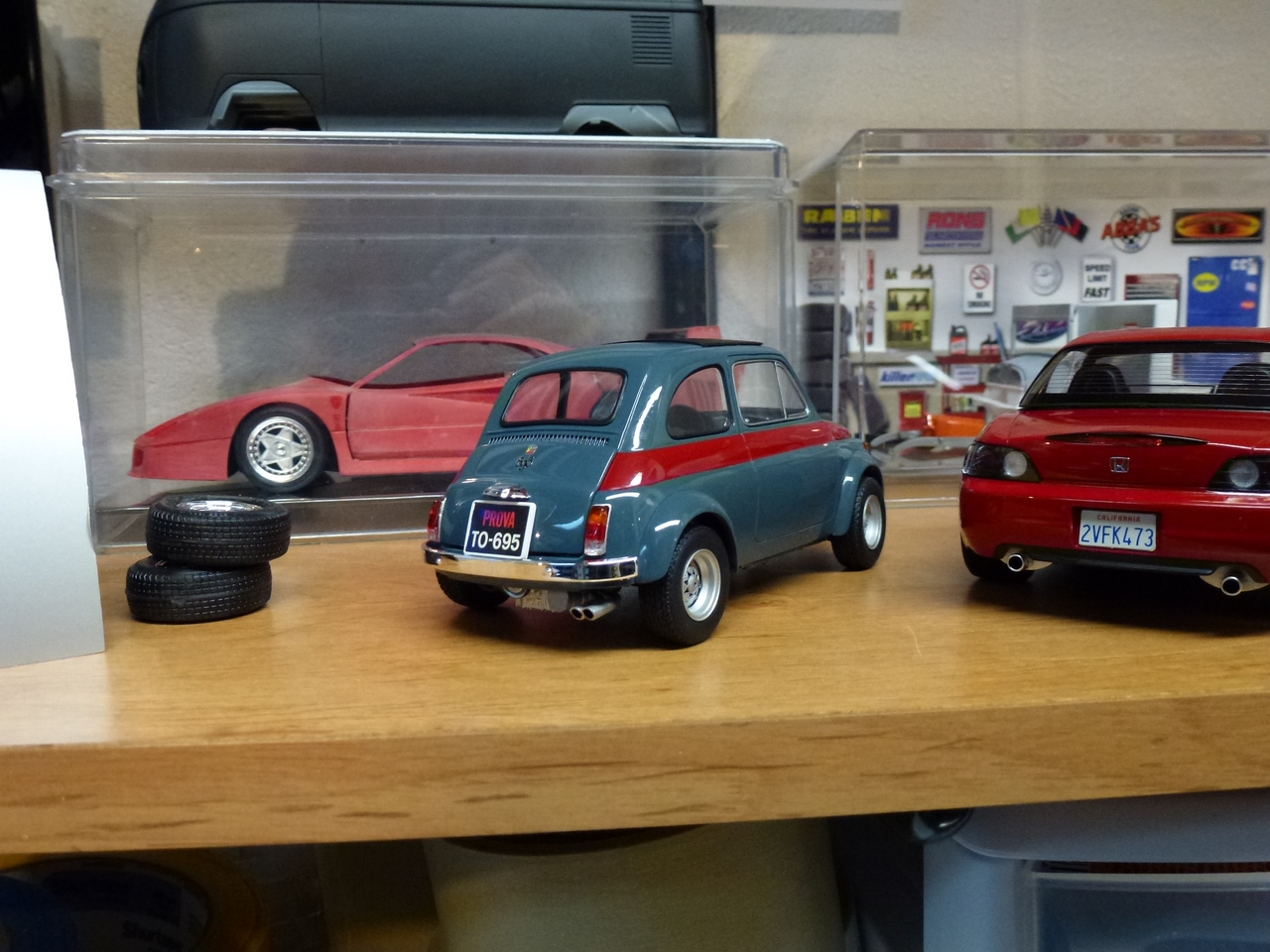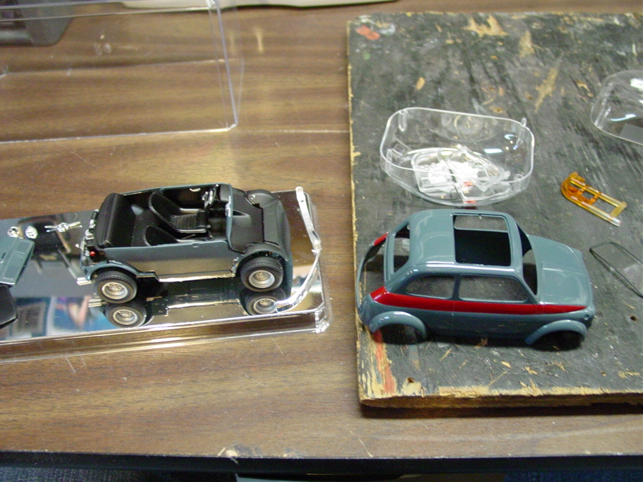 Luigi from the movie Car’s was a Fiat very similar to this kit. The likeness is why I wanted to build it! I shaved quite a bit of trim off of this kit giving it a cleaner look. I botched the original decals for the sides and since the kit was discontinued, at the time, I wasn’t able to order a new decal sheet. I still wanted the red stripes and medium blue alone would be a little boring. I decided to mask the body and sprayed the stripes.