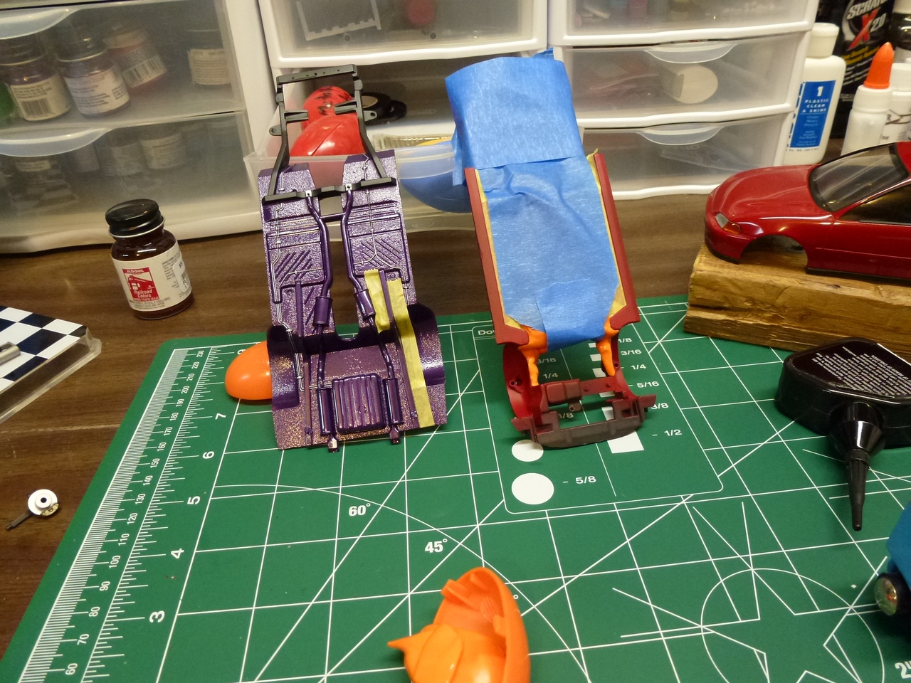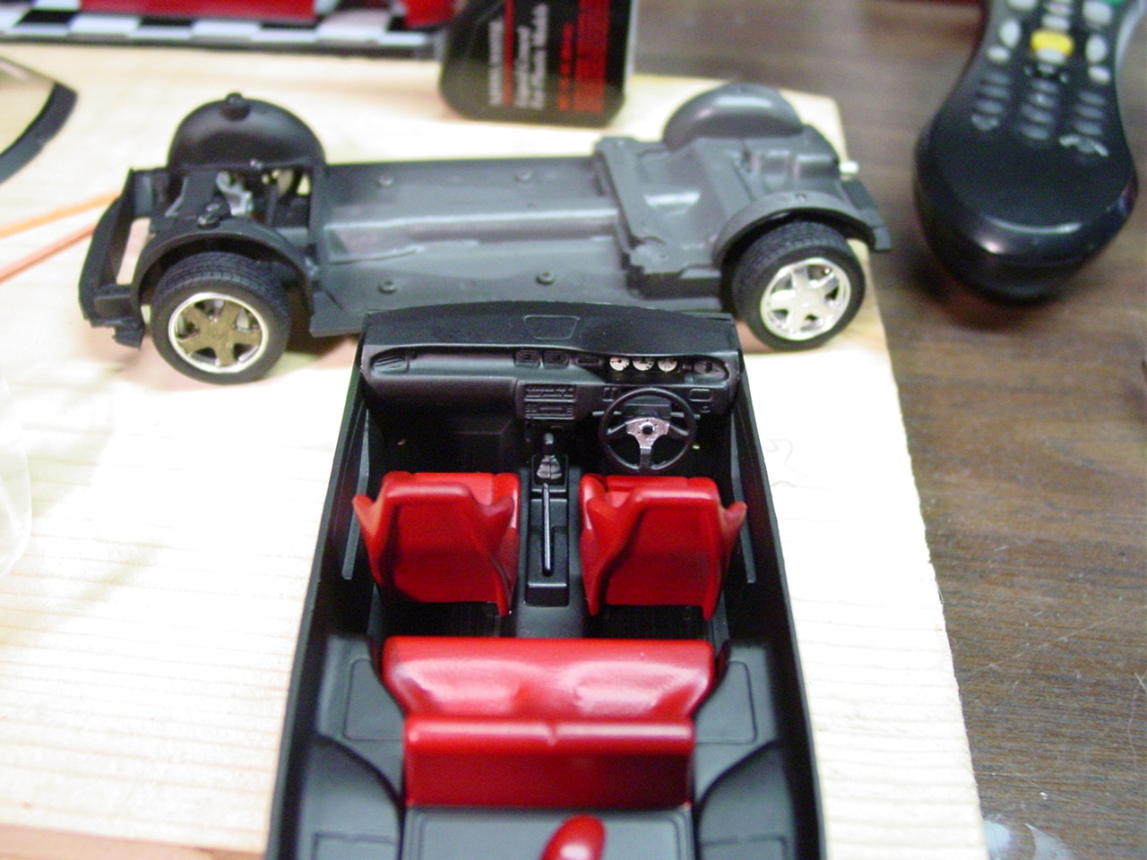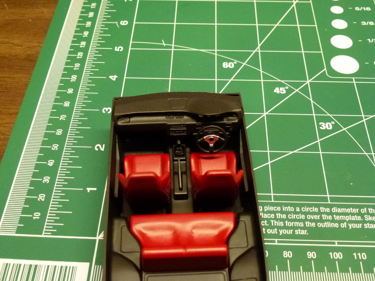 I used Tamiya’s Smoke color to tint the windows. They are a little too dark but look really sweet! I decided to paint the seats the same color as the body. Now you can see them through the dark tint!
